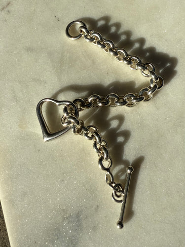 Sliding Heart Rolo Link Sterling Silver Toggle Clasp Bracelet 7”