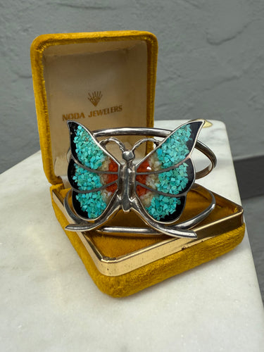Vintage Butterfly Turquoise & Coral Inlay Sterling Silver Cuff Bracelet 6.25”