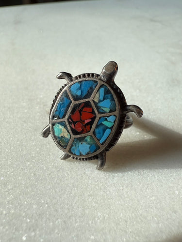 Crushed Turquoise & Coral Sterling Silver Turtle Ring Size 4