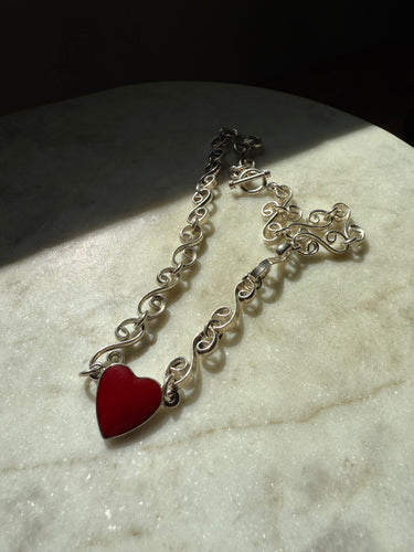 Mexico Sterling Silver Red Heart Chunky Necklace 19”