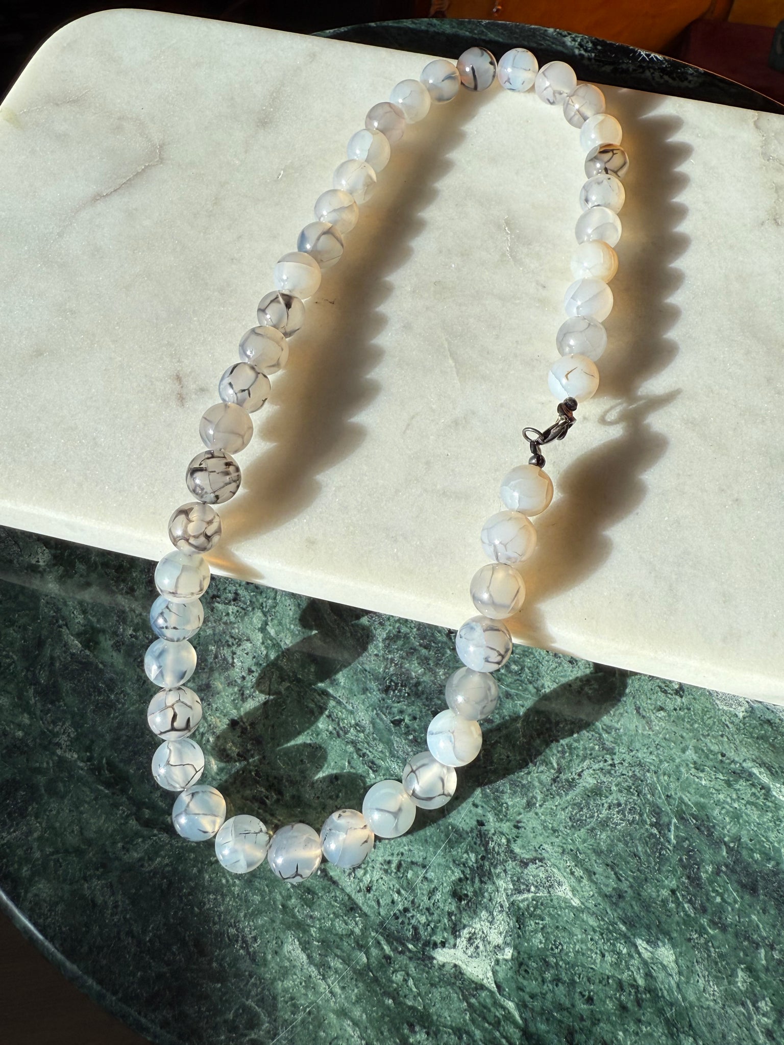 56.3 grams • .925 Sterling silver clasp • 10mm width beads • 18.5” length, fits more like 18” due to width