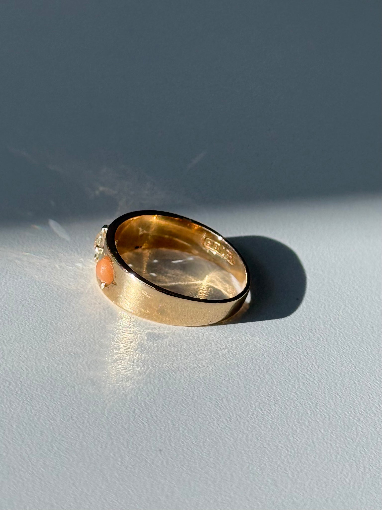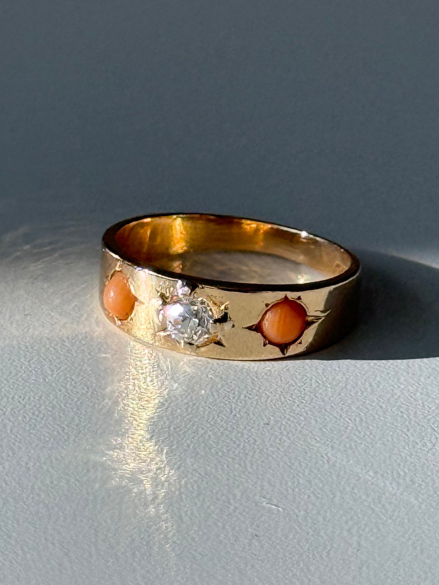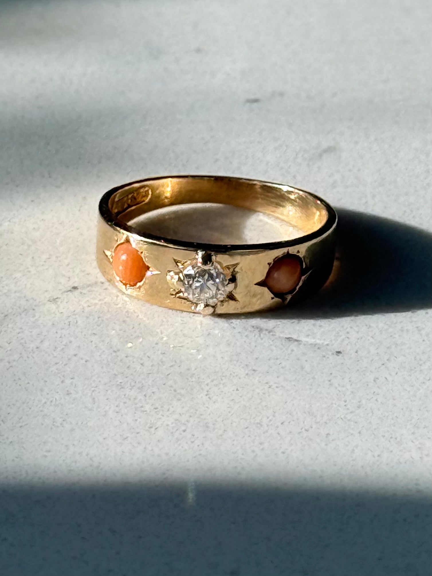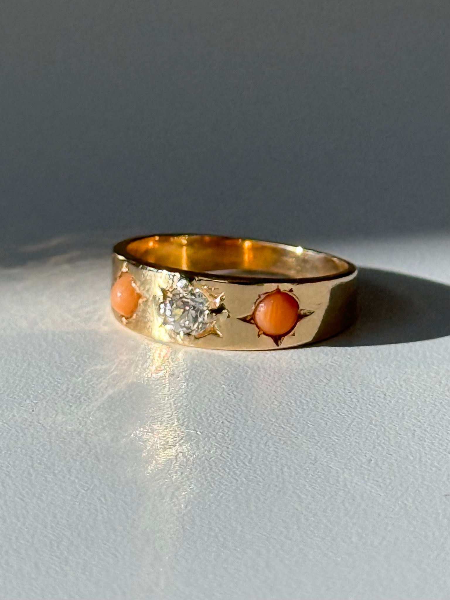 Antique 18k Yellow Gold Coral & Old Mine Cut Trilogy Ring•.15ct Old Mine Cut Diamond •Size 4.75•2.8 grams