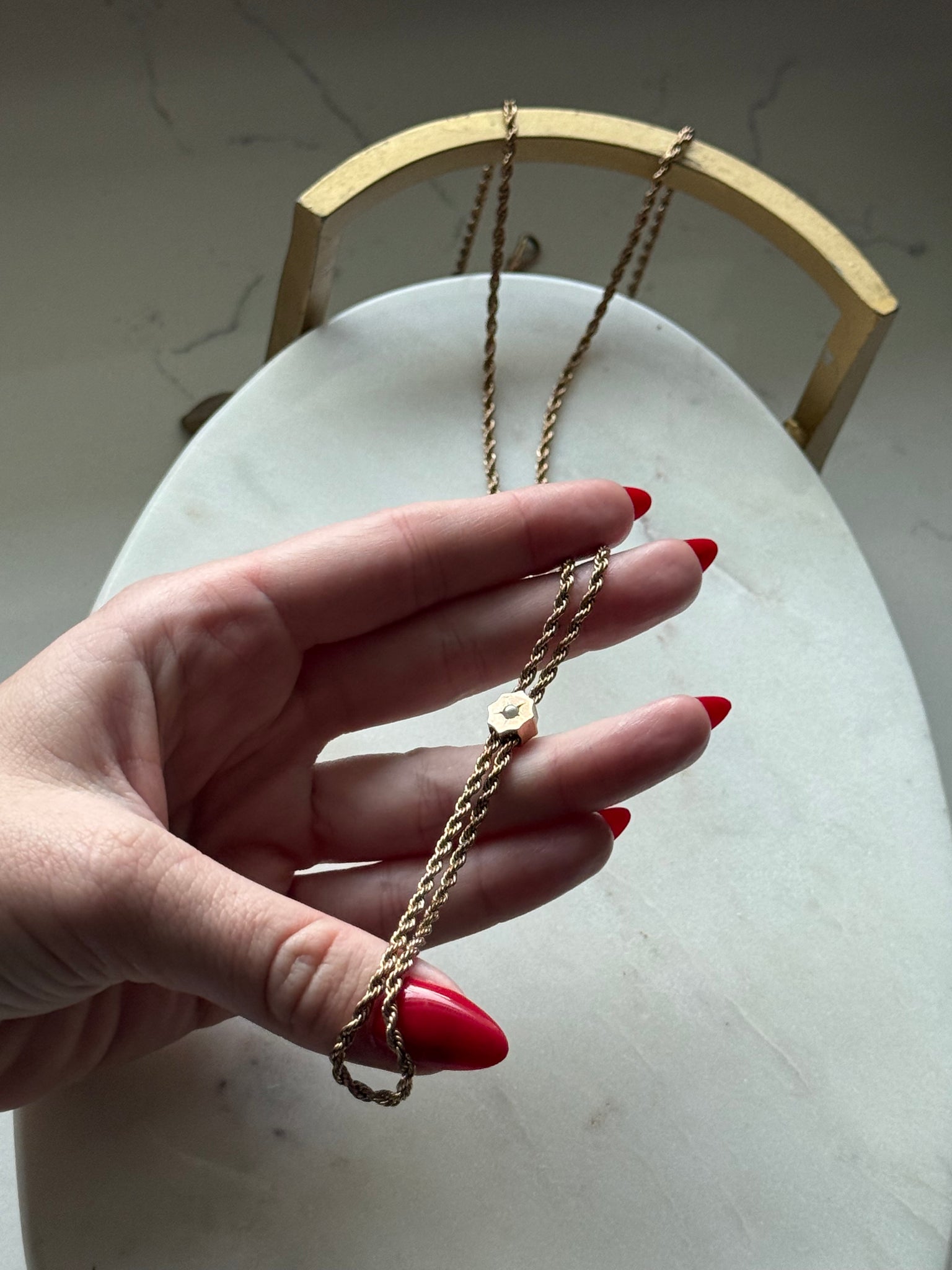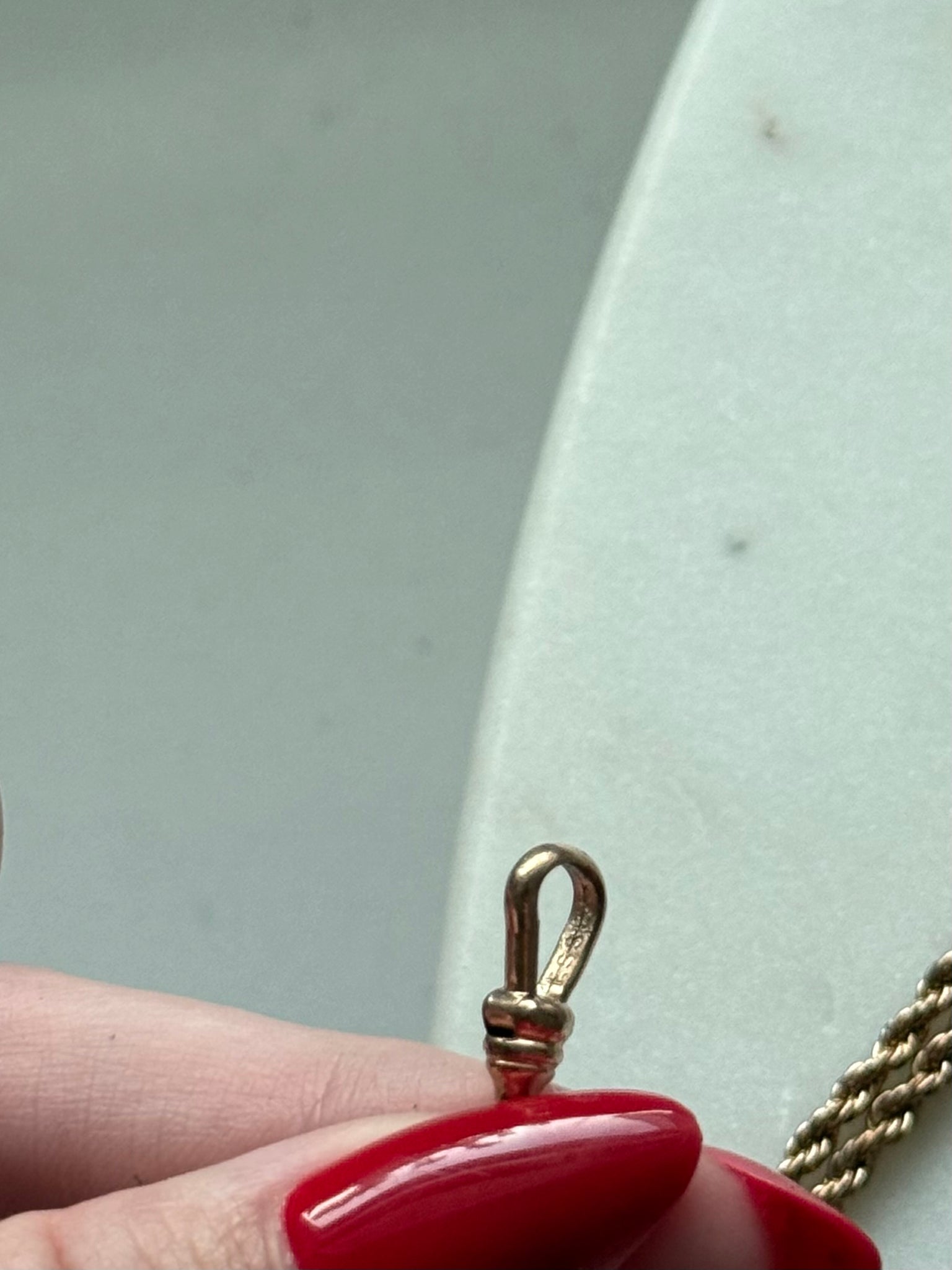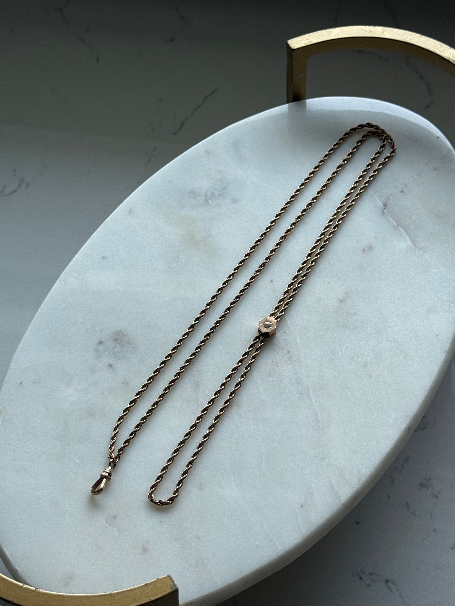 The slider charm that is engraved with initials is 10k Rosey gold, the rope and dog clip are 1/20 12k gold filled • 17.2 total weight • 18” length