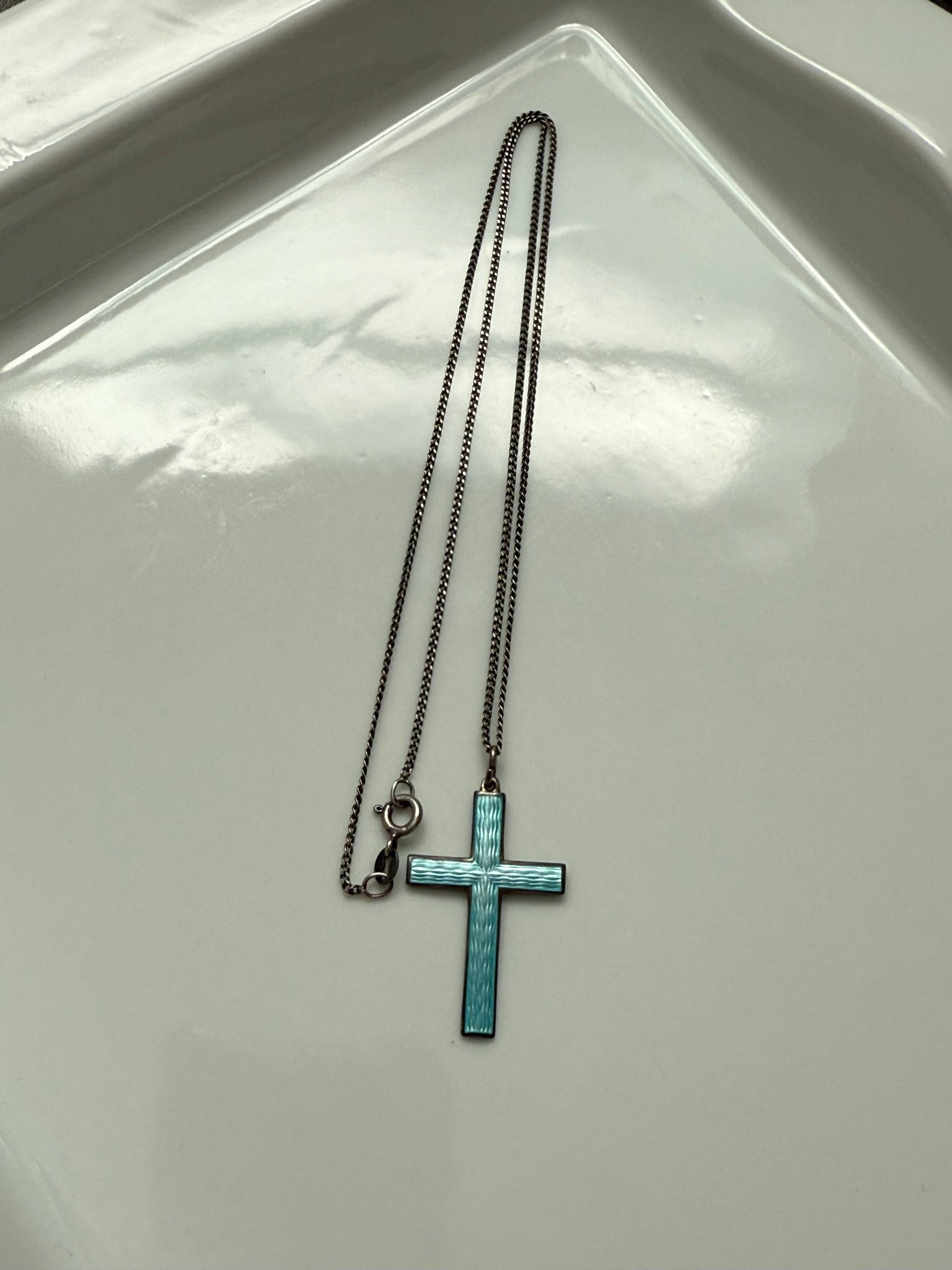 Guilloche Blue Enamel Sterling Silver Cross Necklace
