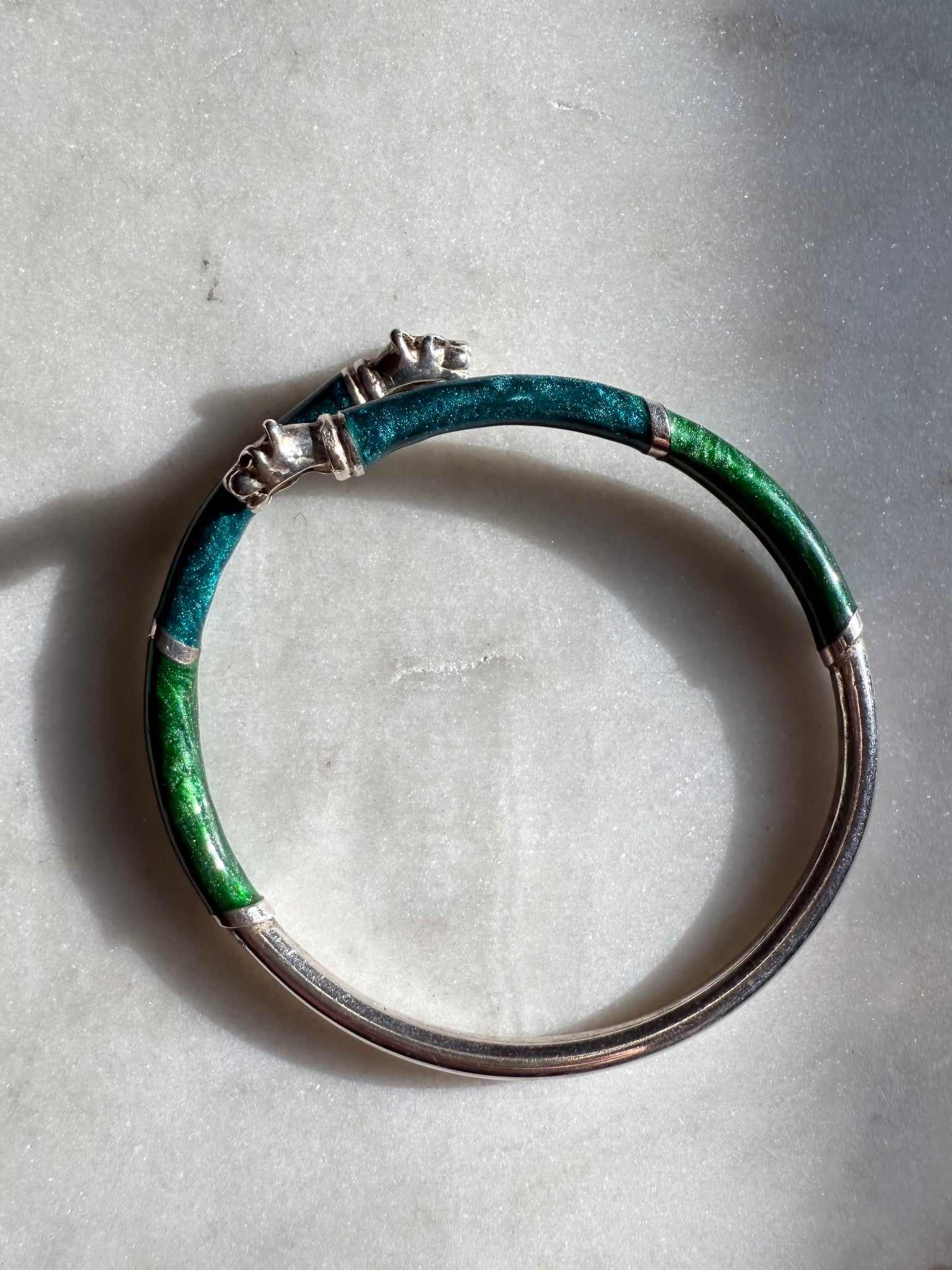 Blue & Green Enamel Dueling Panther Sterling Silver Bracelet
