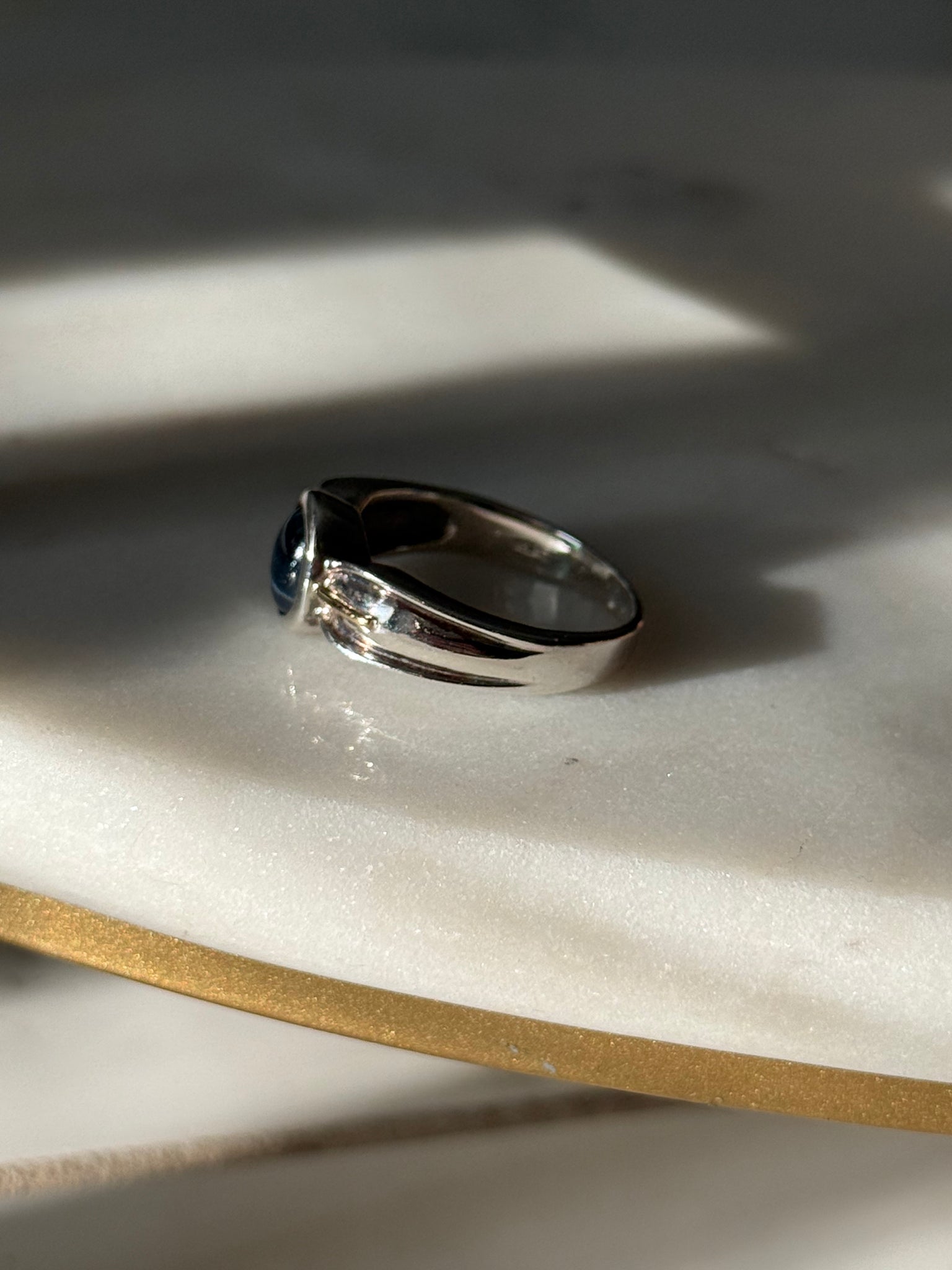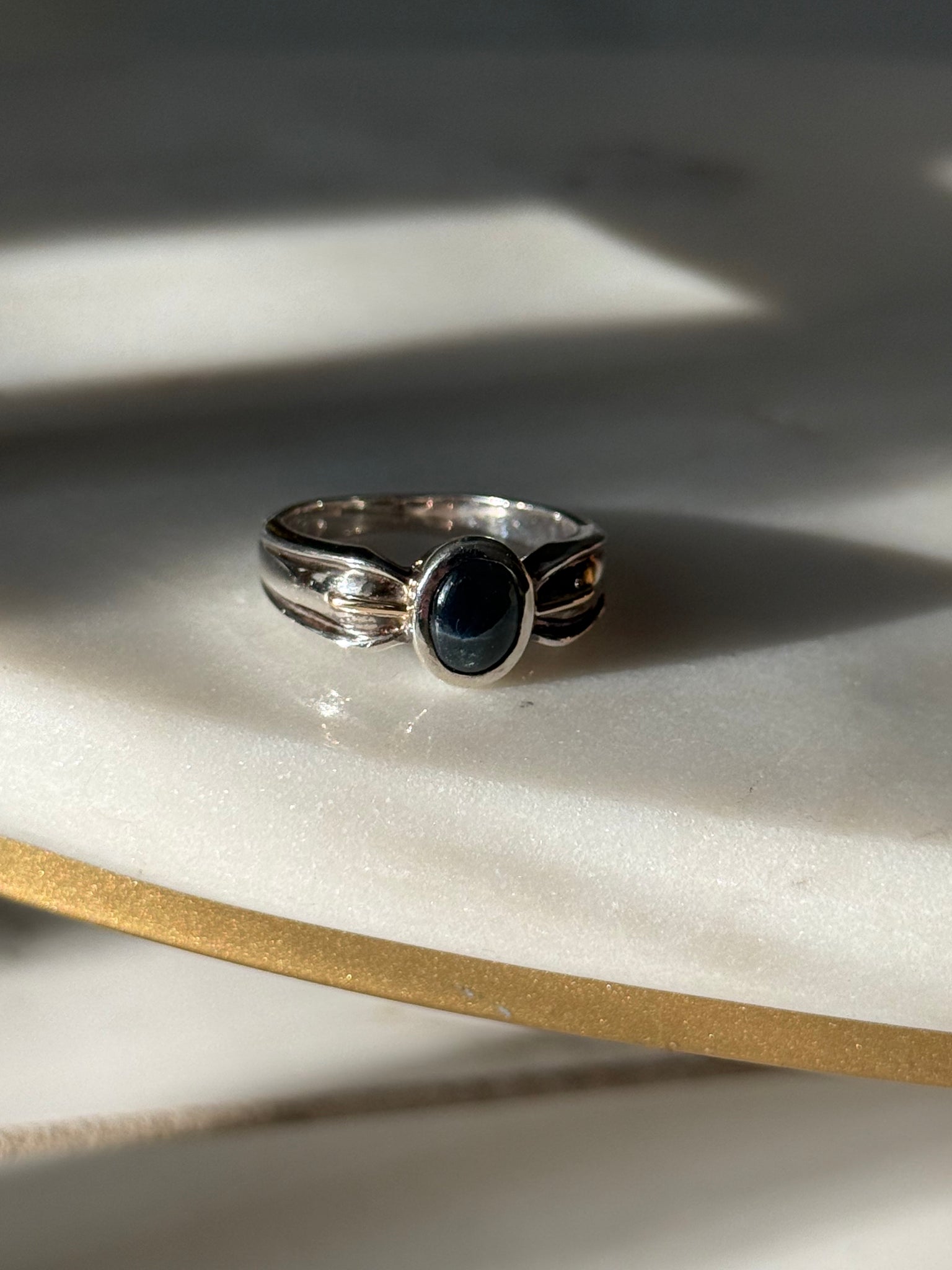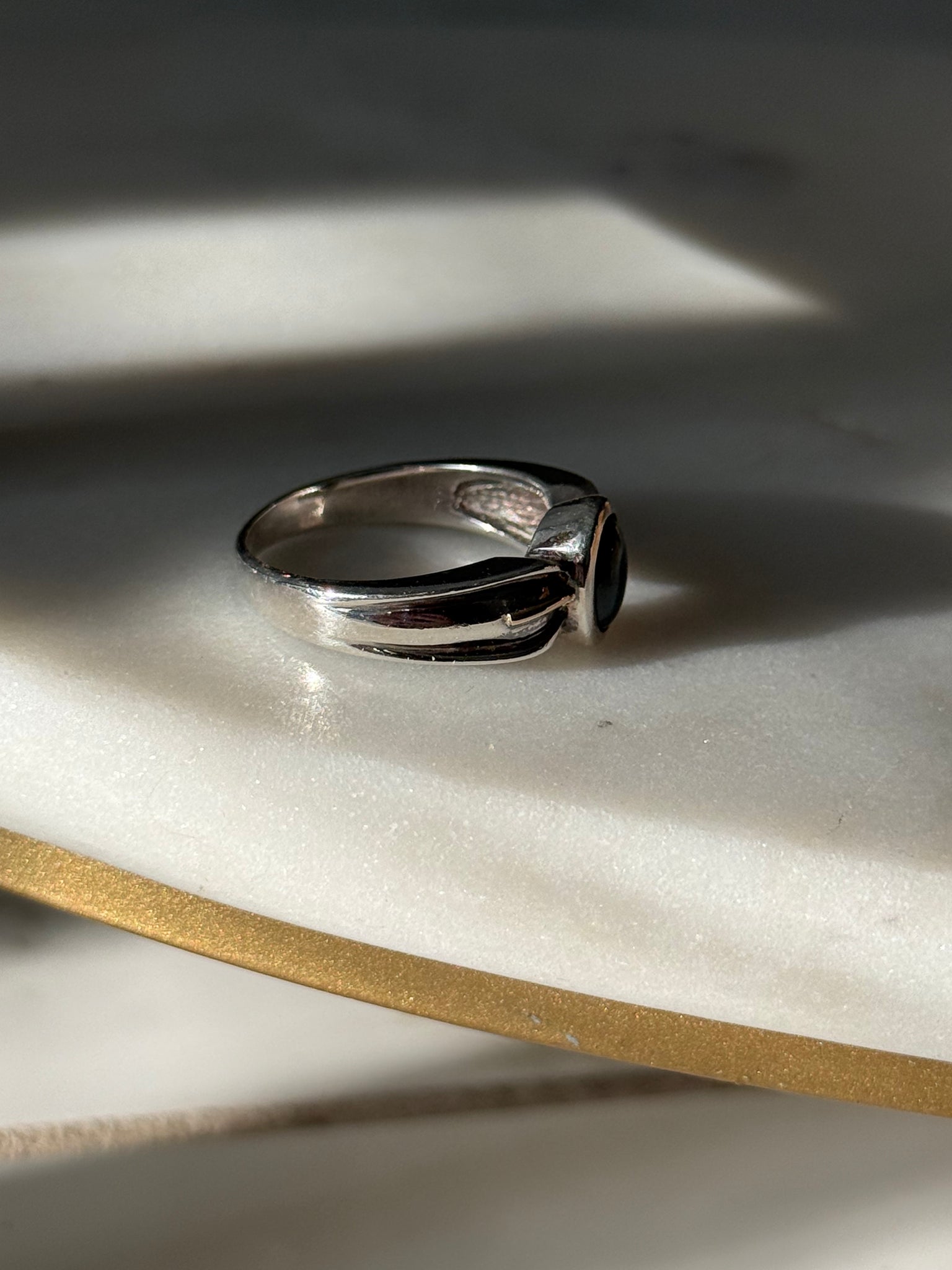 .925 Sterling silver with 14k yellow gold on the small pieces on each side of the stone • 5.4 grams • ring size 9