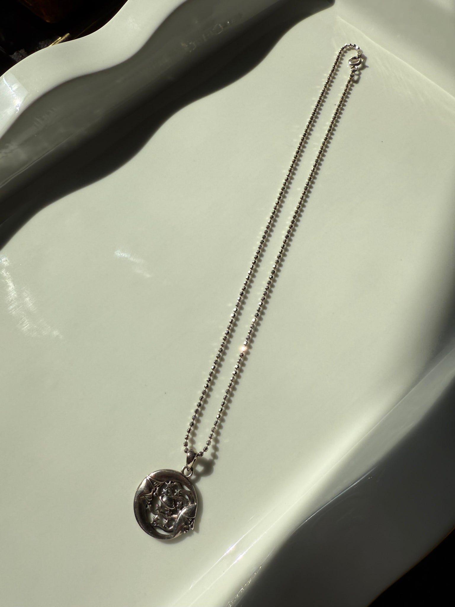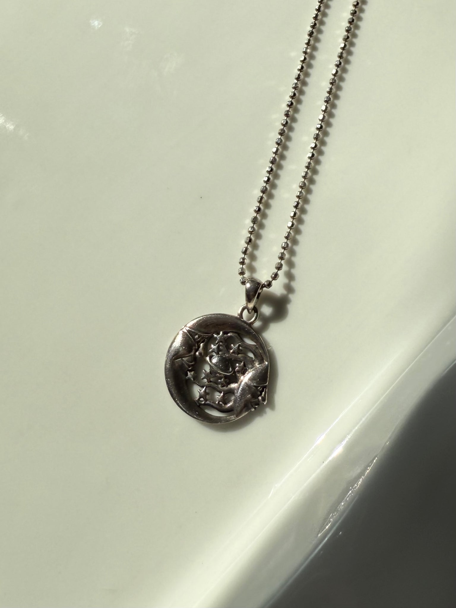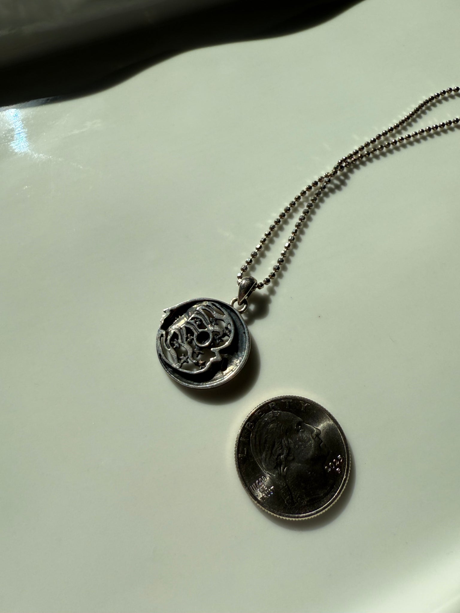 7.6 grams • comes with pendant and chain- both .925 Sterling Silver • pendant measures .75” and the bale fits up to a 2mm width chain • the ball chain is 16” length and 1.5mm width