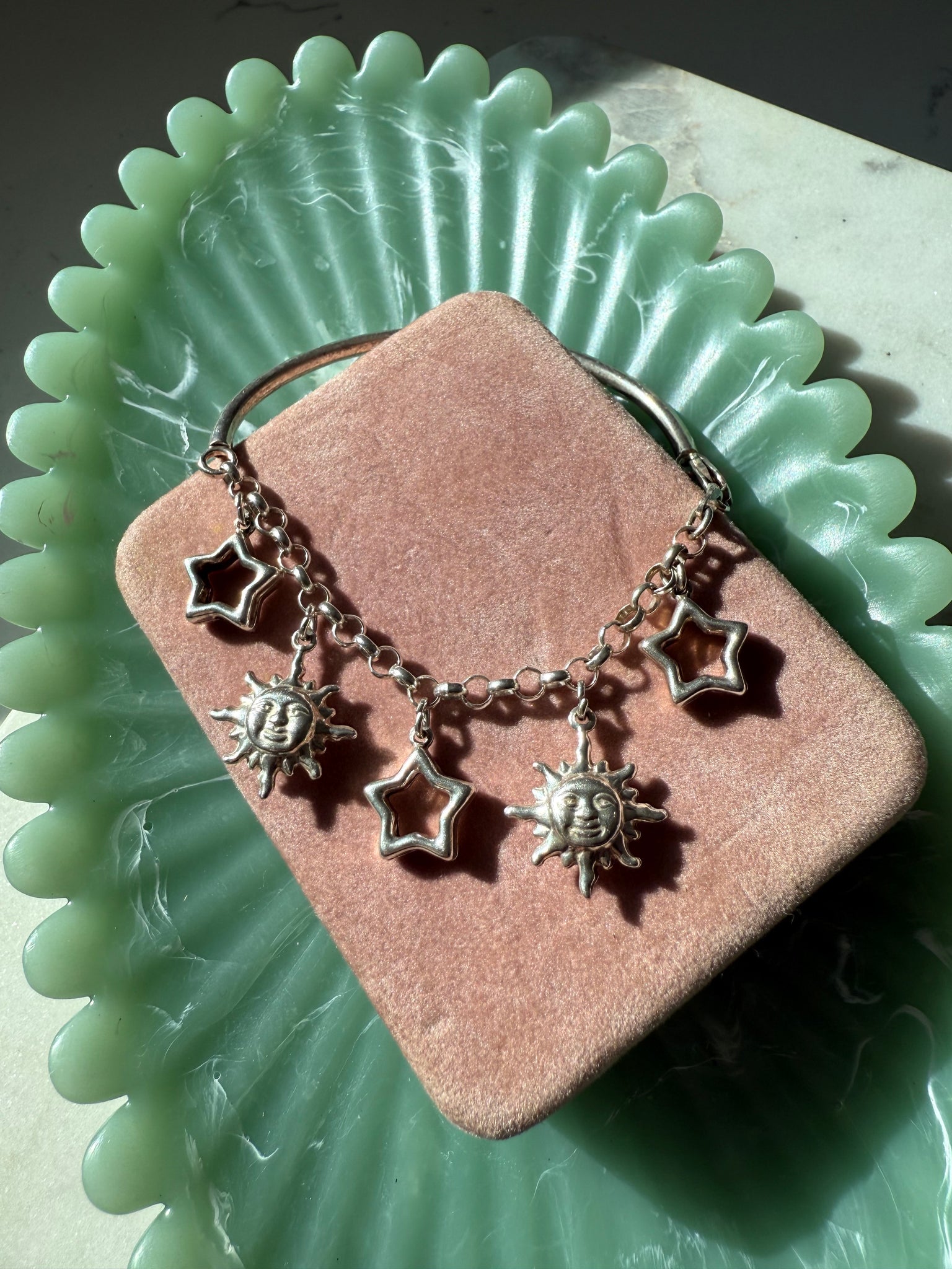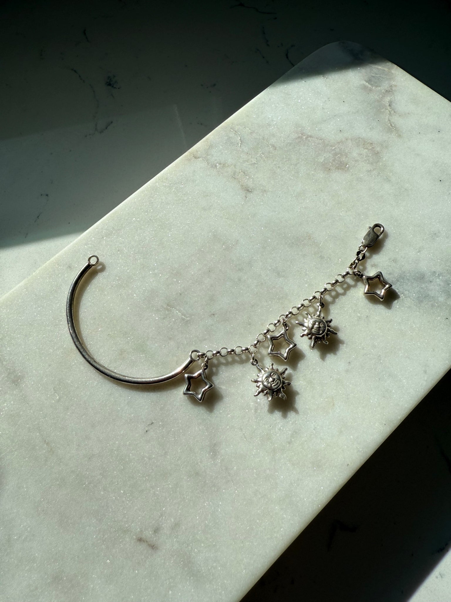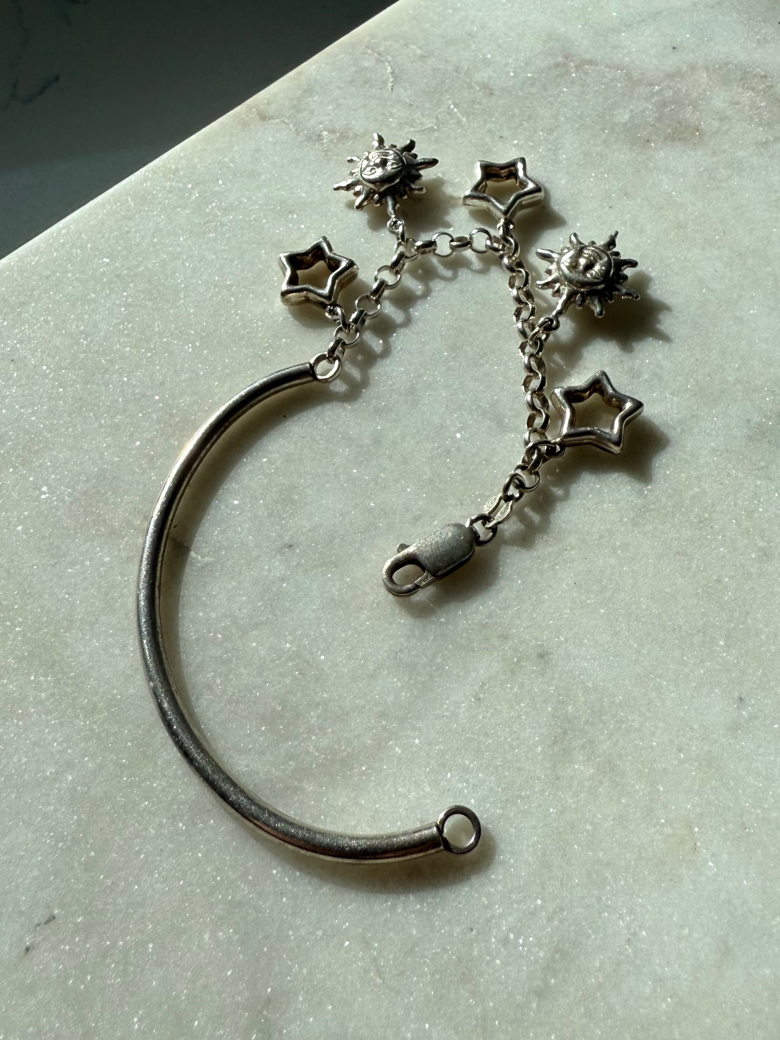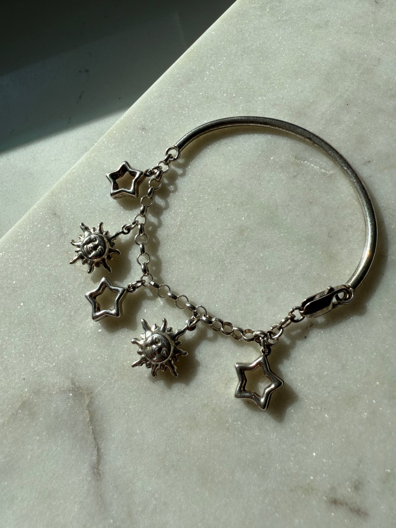 Celestial Sun & Star Sterling Silver Charm Bangle Bracelet 7.5”