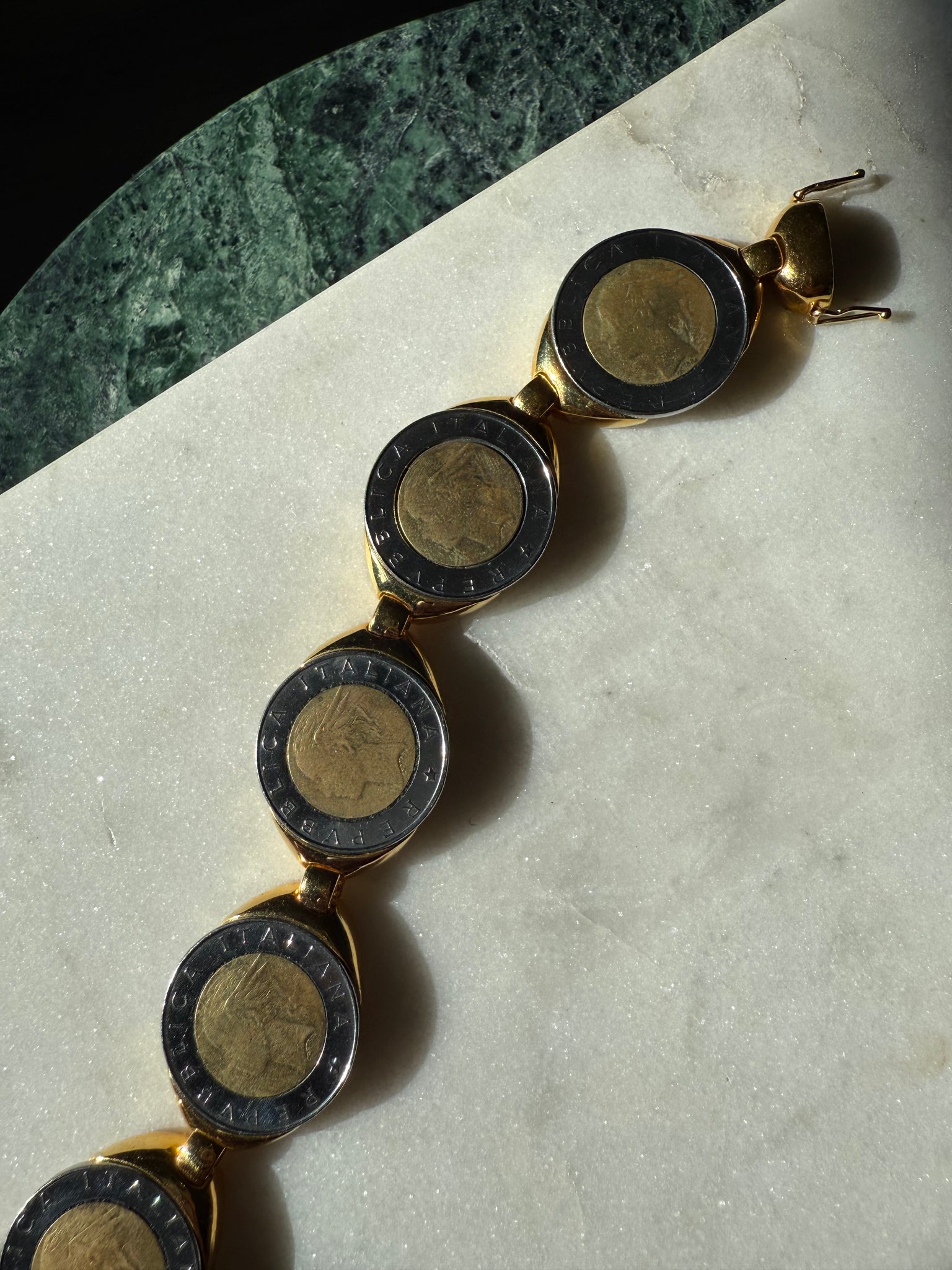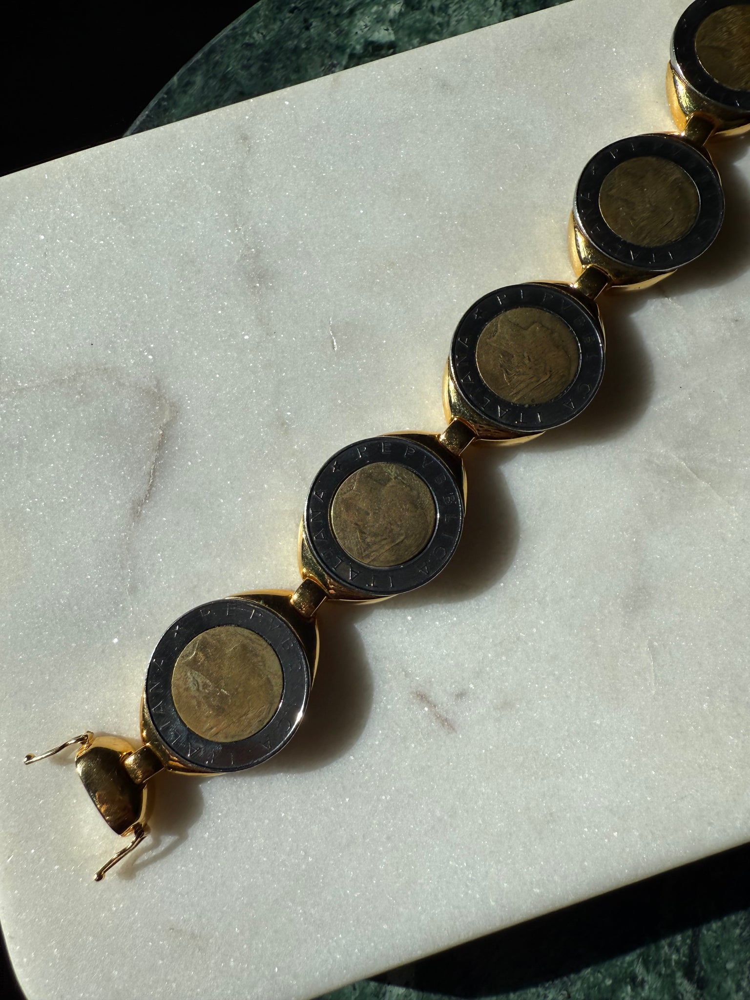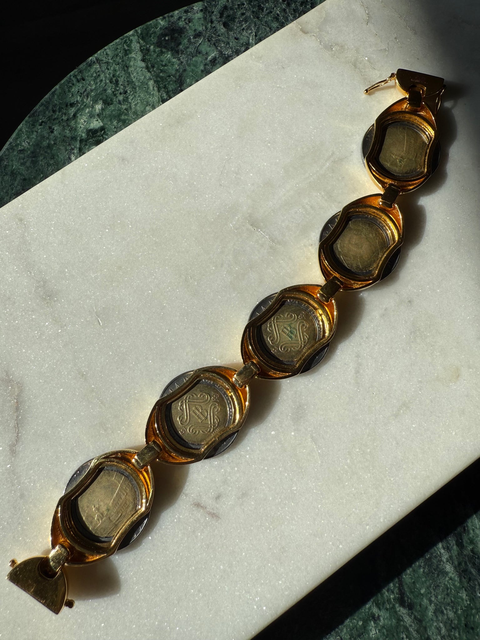 Very heavy gold plated costume bracelet with a magnetic clasp, measures 7.5” length