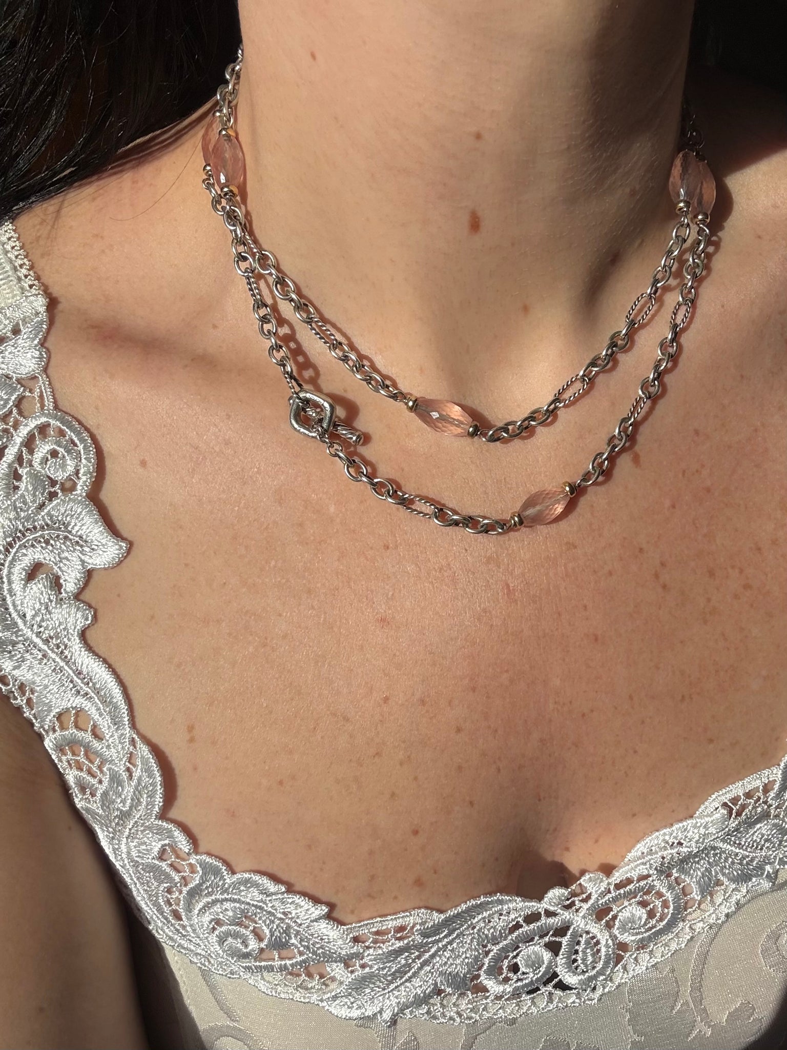 43.1 grams • .925 Sterling silver & 750 (18k yellow gold) • 8mm rose quartz pieces • 5mm chain link pieces • 34” length