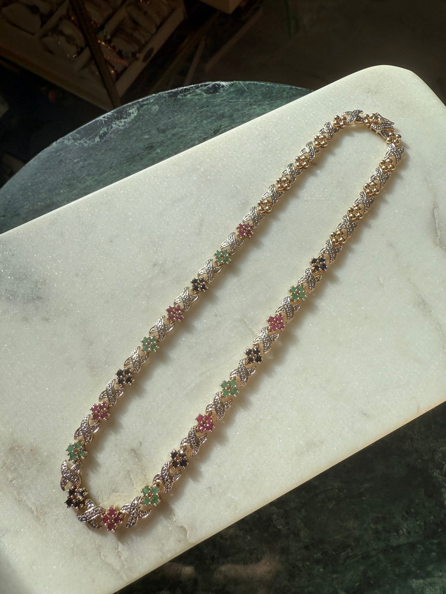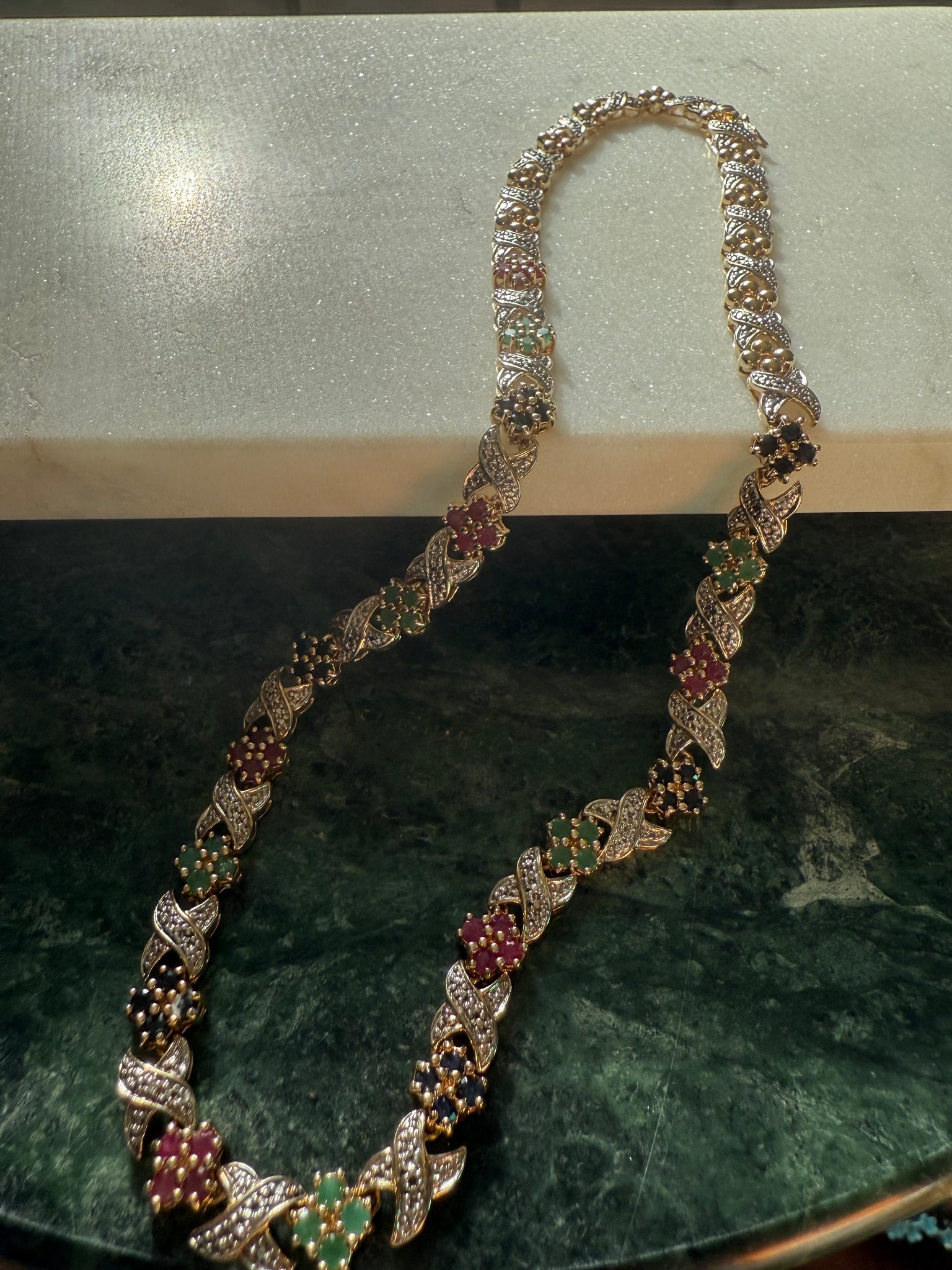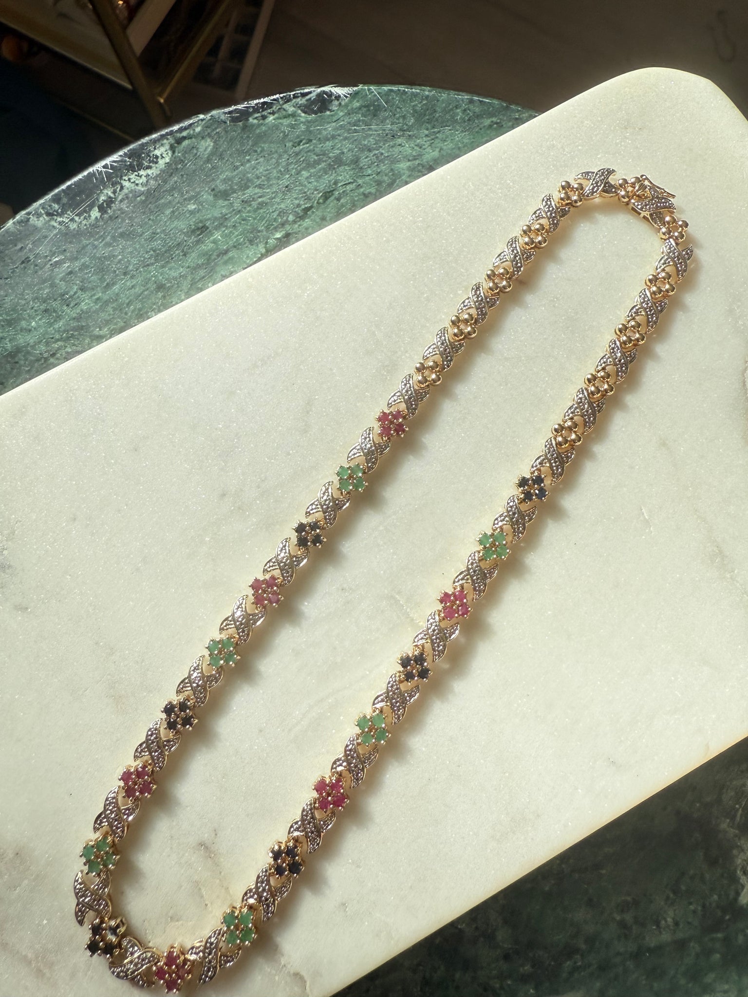 36.1 grams • .925 gold vermeil and sterling two toned • stamped China • 8mm • 17.45” lying flat • natural rubies, emeralds and blue sapphires