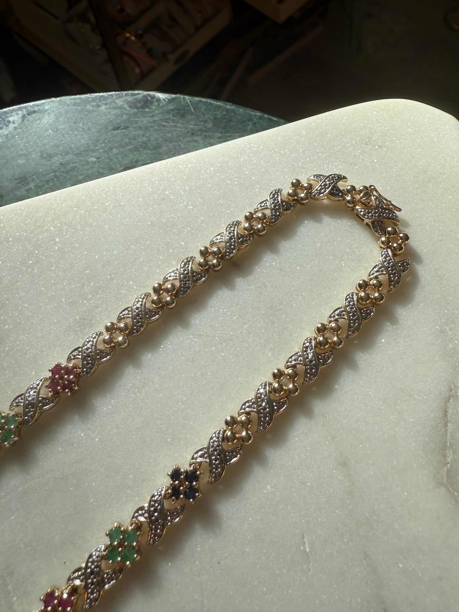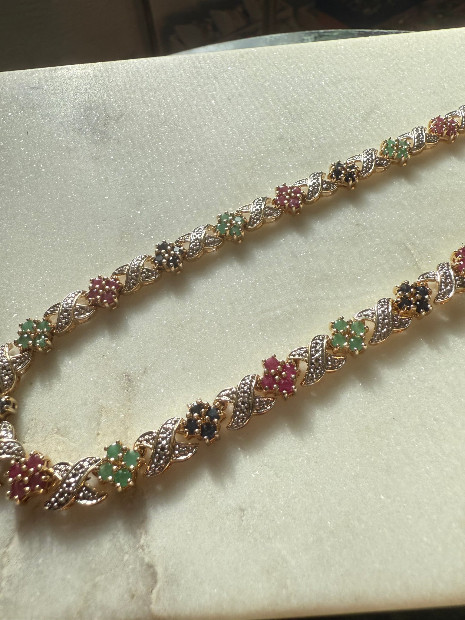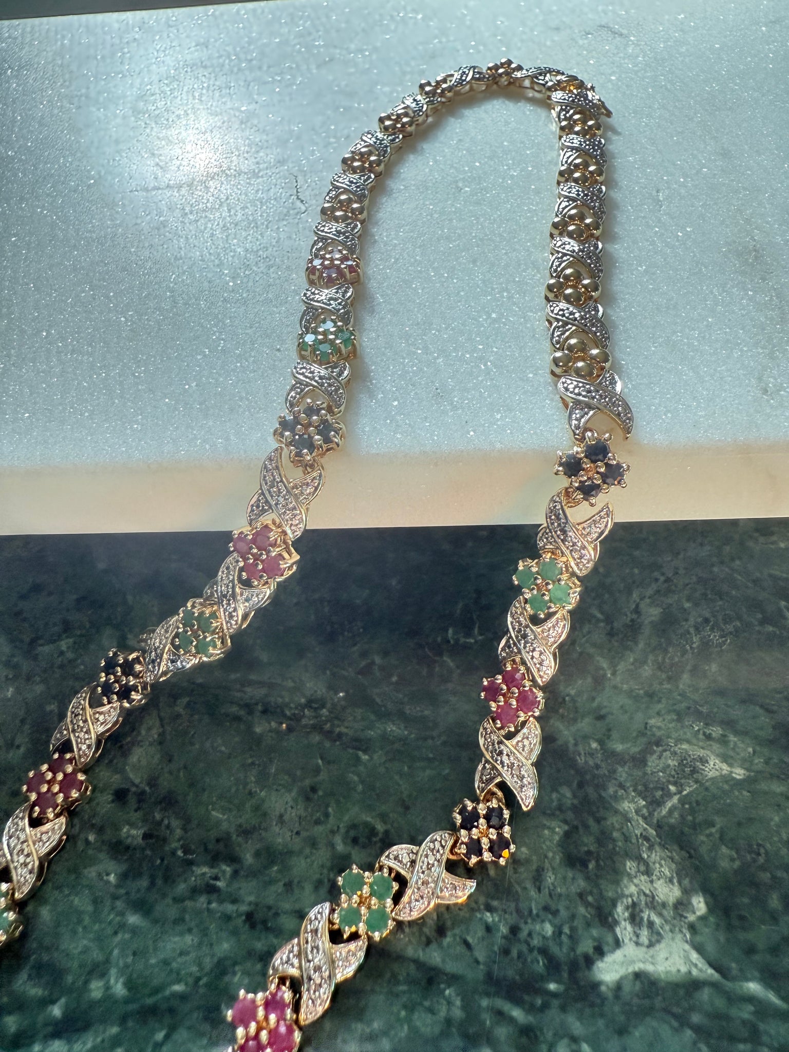 36.1 grams • .925 gold vermeil and sterling two toned • stamped China • 8mm • 17.45” lying flat • natural rubies, emeralds and blue sapphires