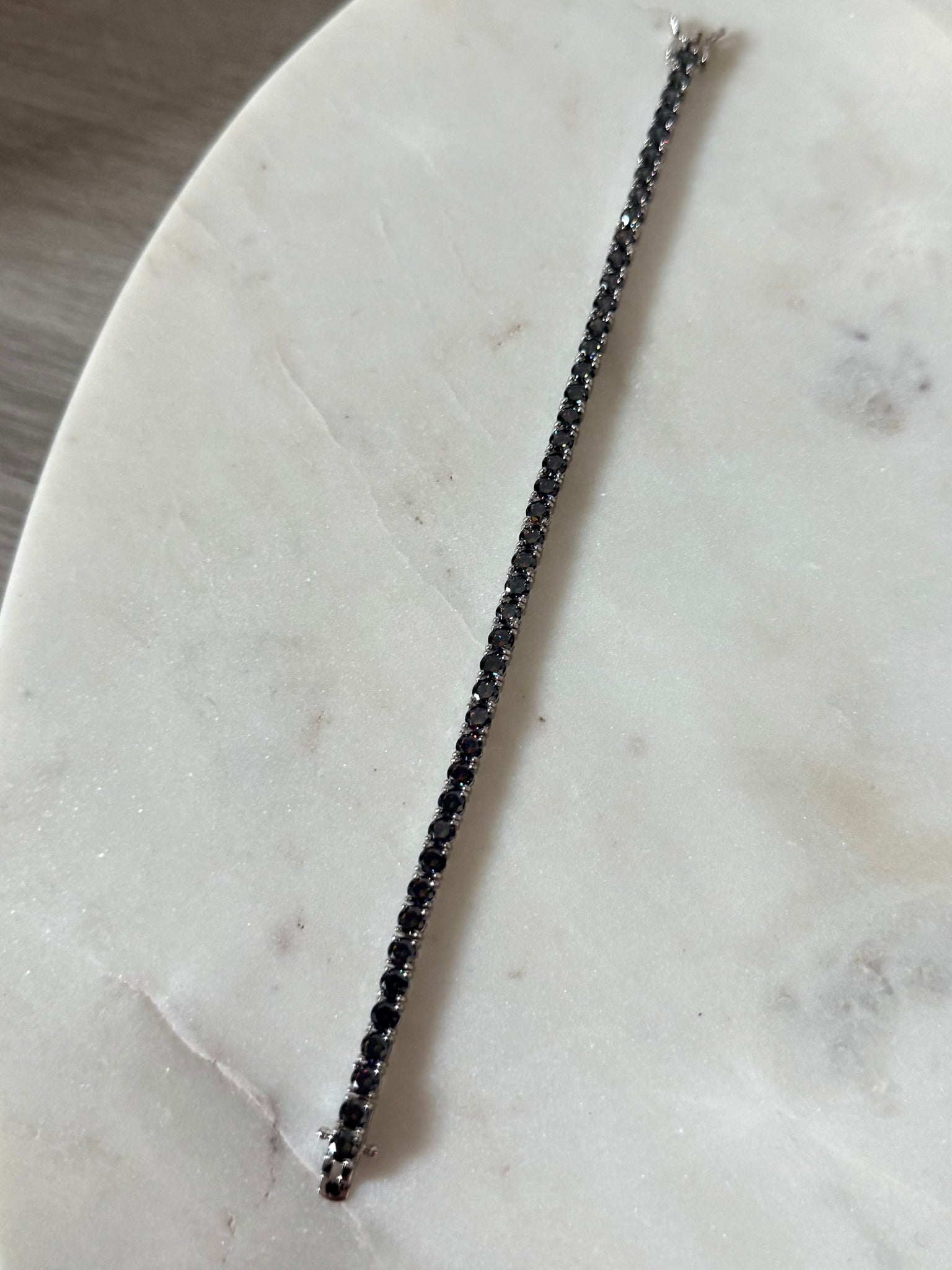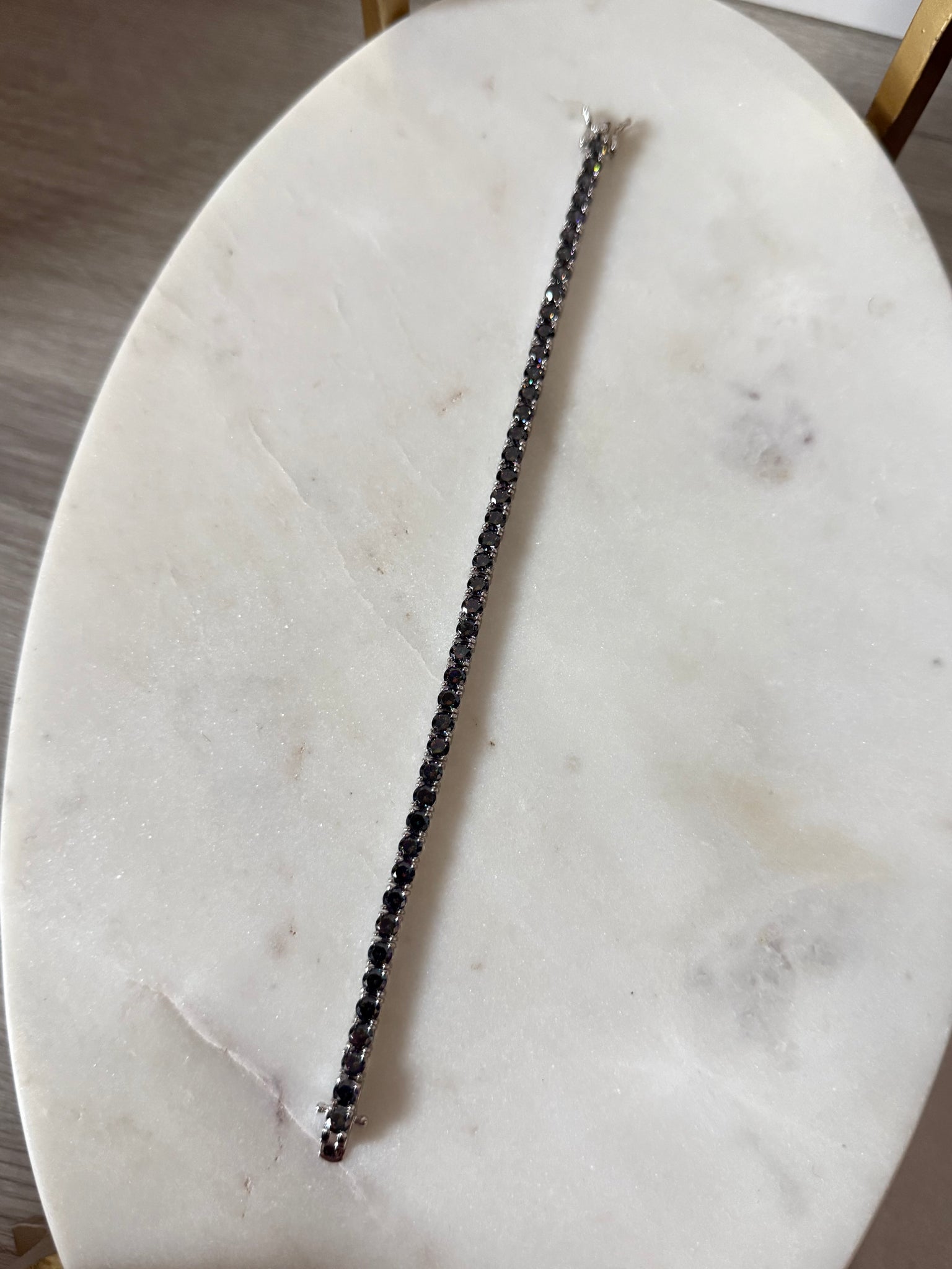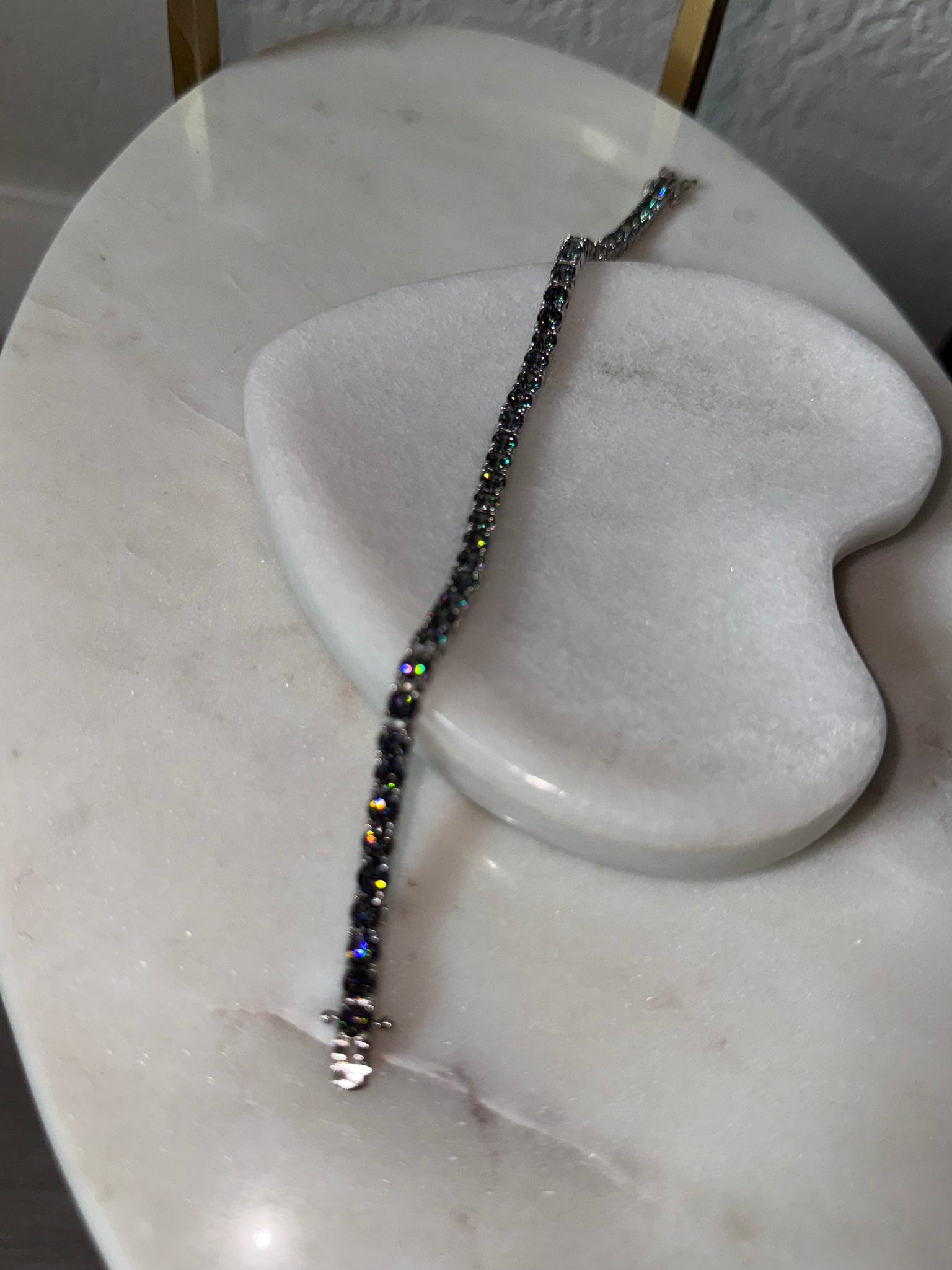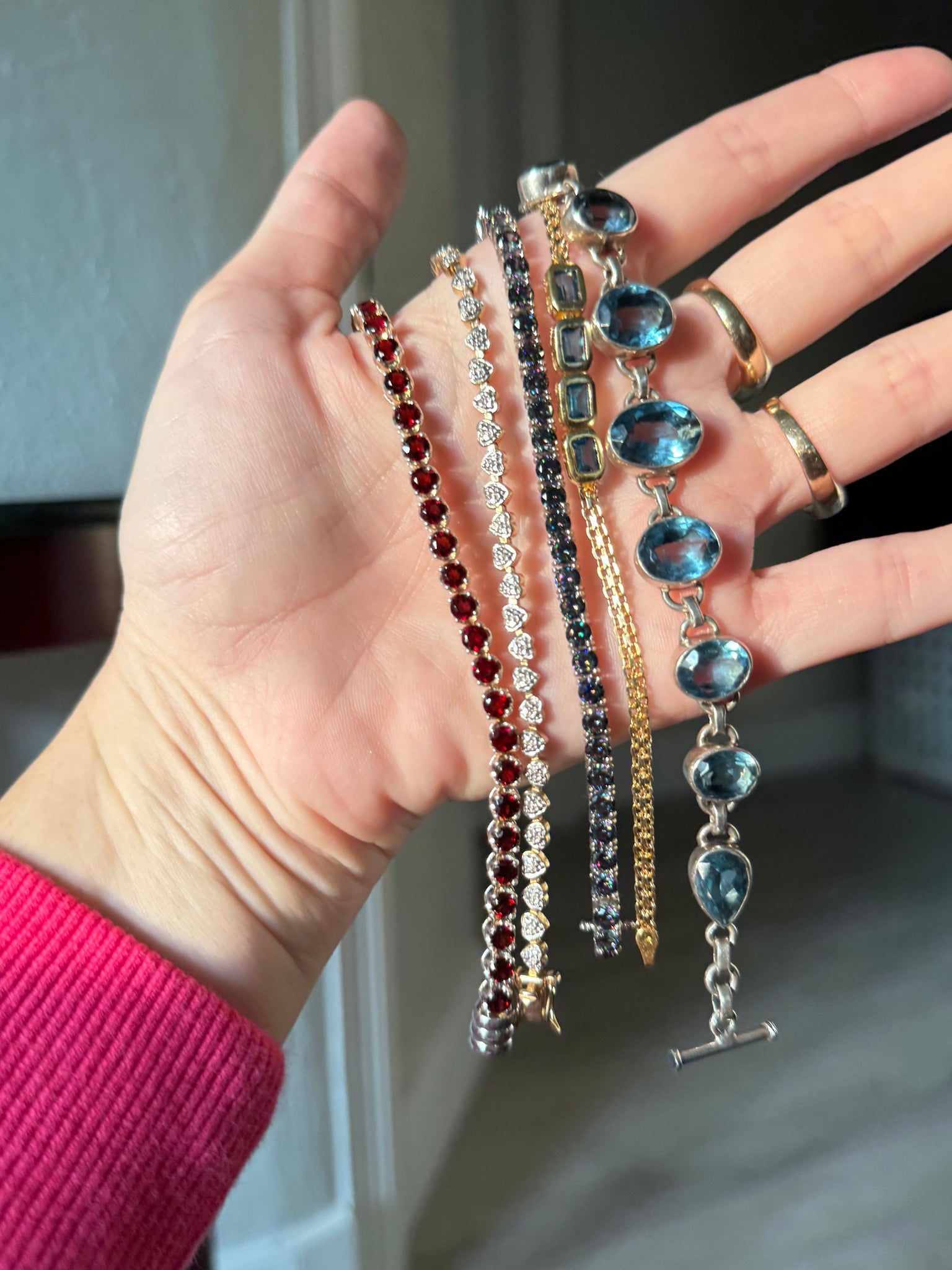 15 grams • 4mm width links • 7.5” length fully lying flat with measuring tape • quartz stones that are made to resemble mystic blue topaz