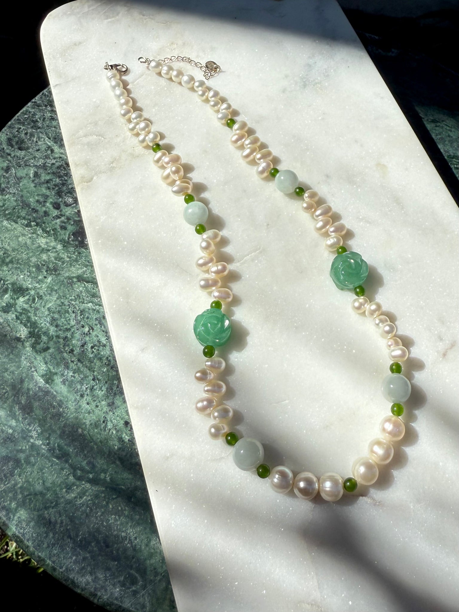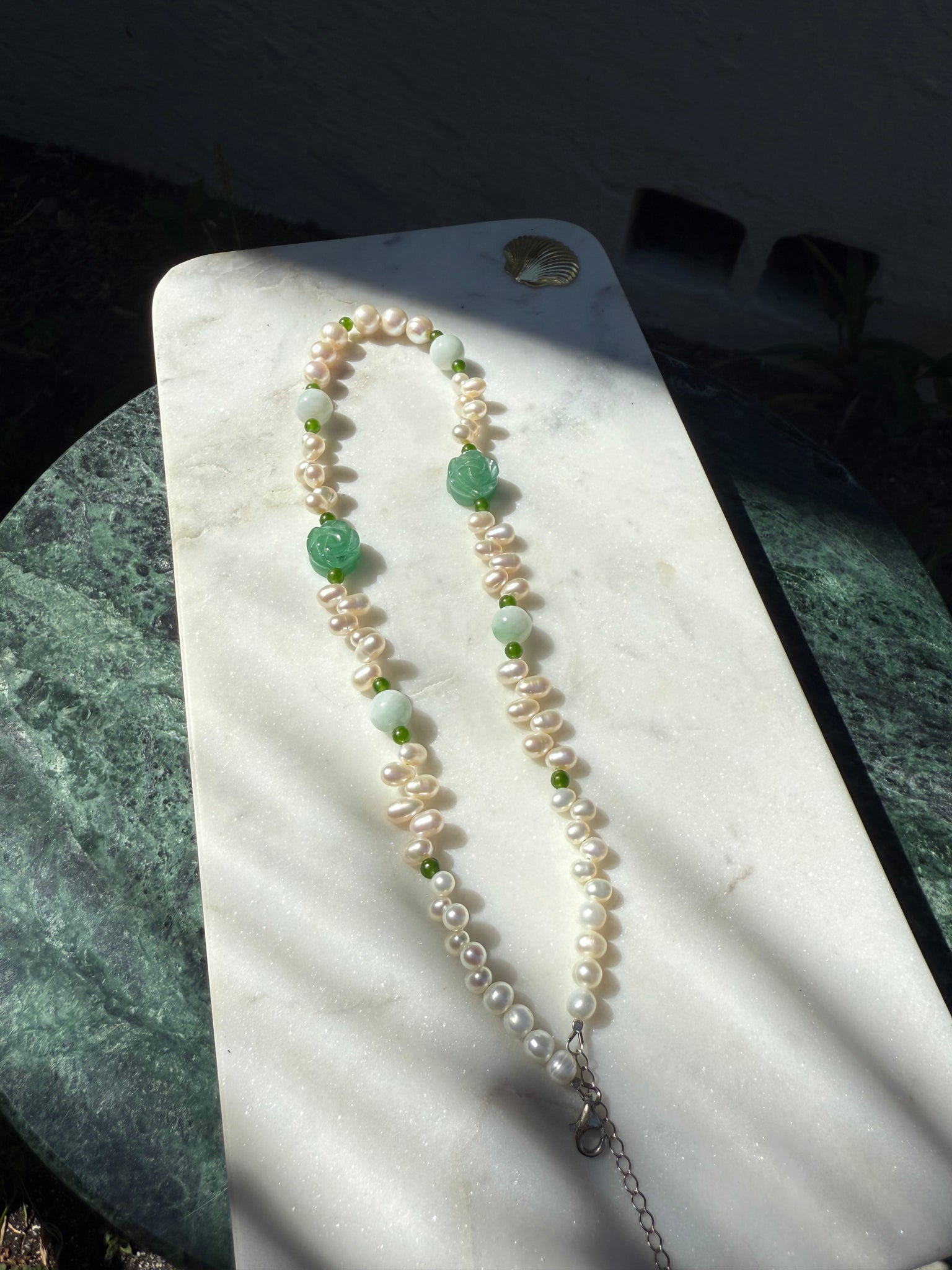 39.3 grams • .925 Sterling silver clasp • im unsure if the pearls and jade are faux or not • 18.5” - 20.5” length • 13mm width • hallmarked by the maker ‘Meico’