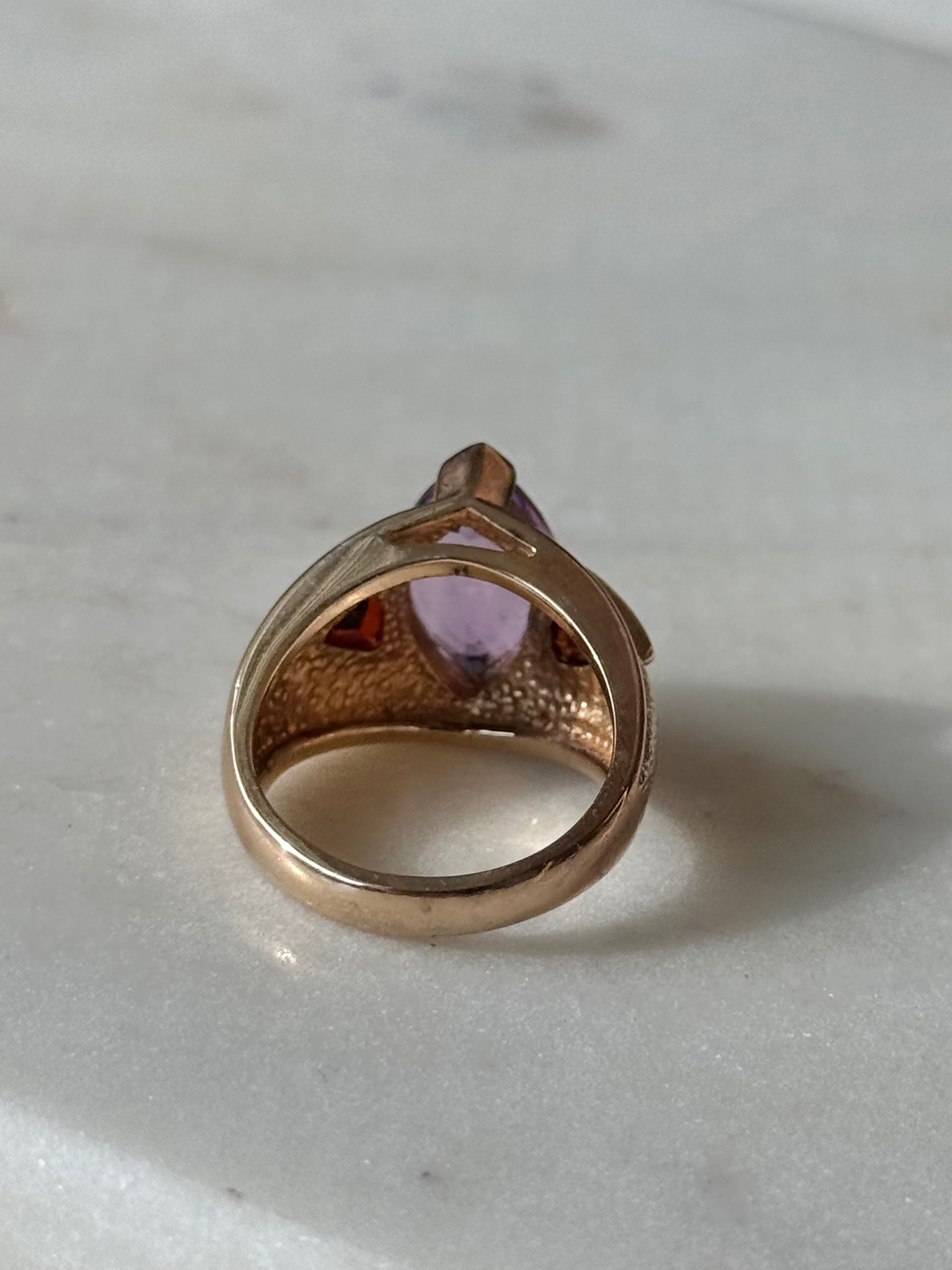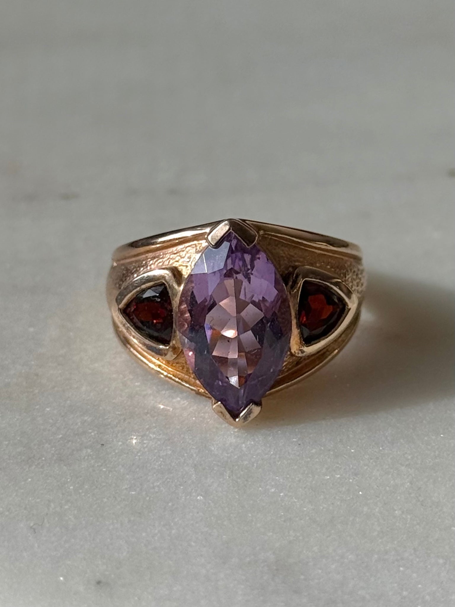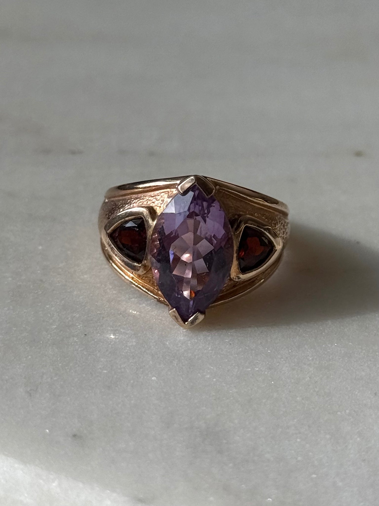 8.4 grams • ring size 8 • modern .925 gold vermeil with amethyst and garnet