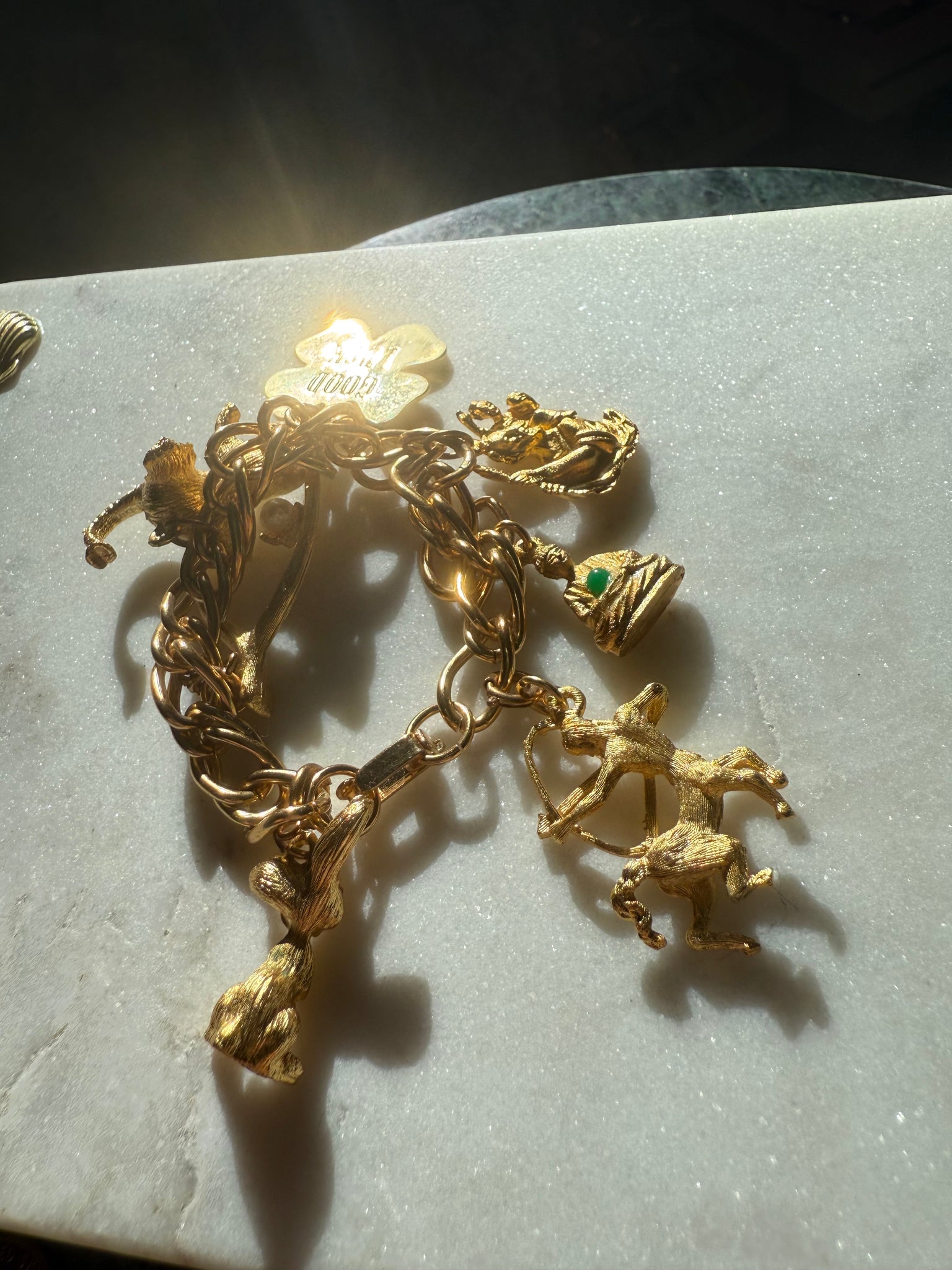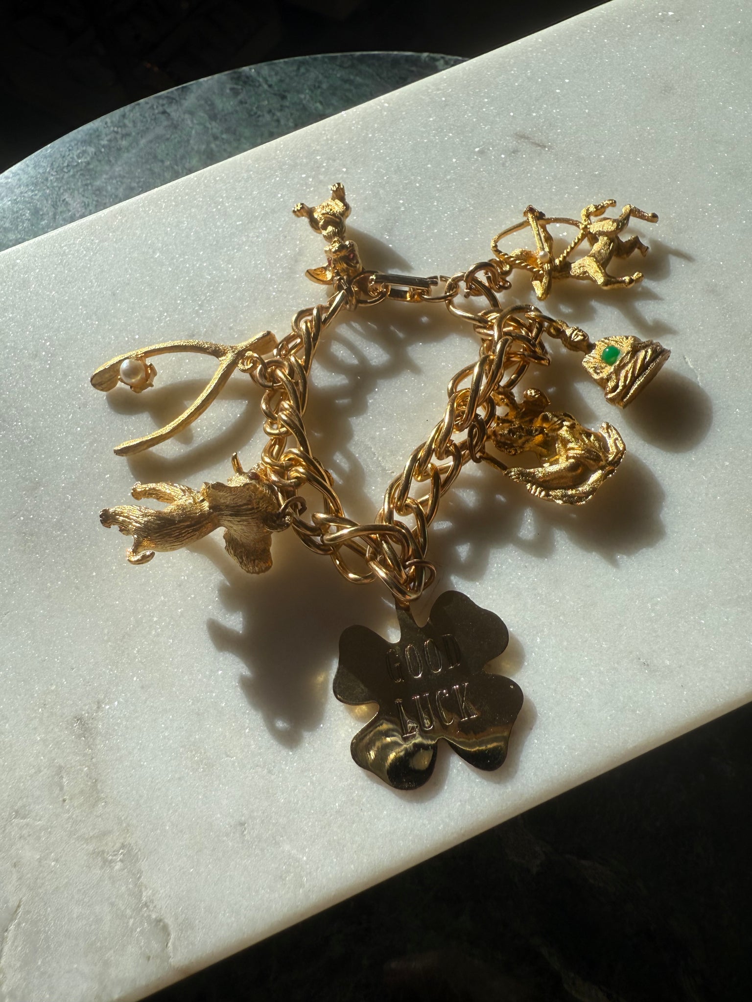 68.2 grams • gold plated • 6.25” length, due to the chunky charms it fits a little smaller than 6.25”