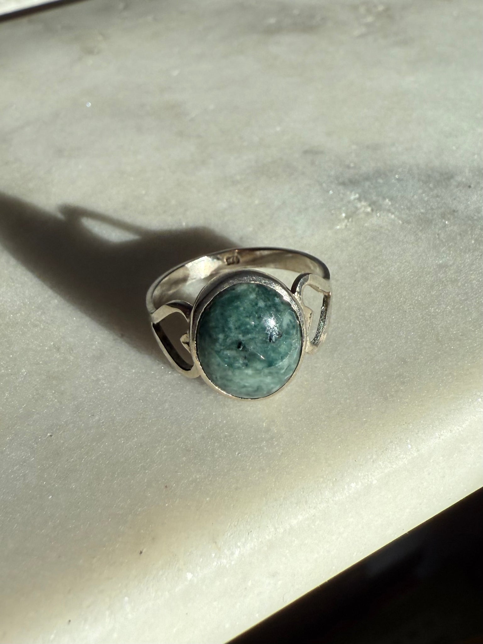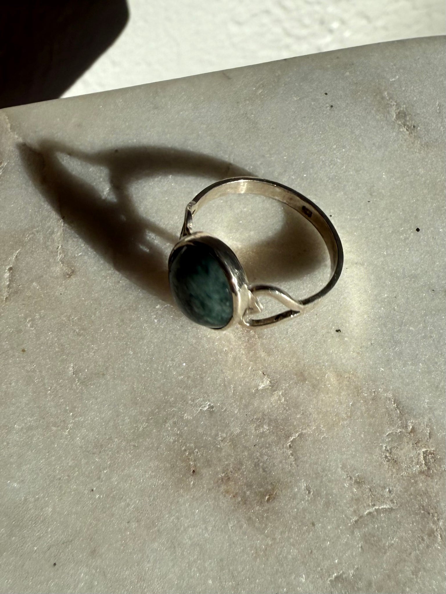 2.6 grams • .925 Sterling Silver • size 7.5 • has a stone that resembles agate but I am unsure, has two hearts on the shoulders of the ring