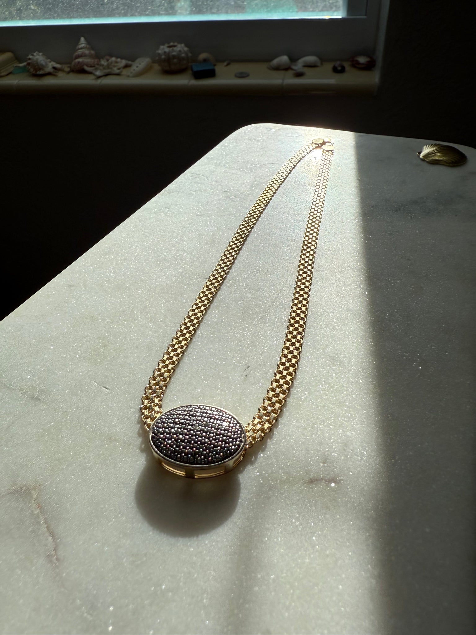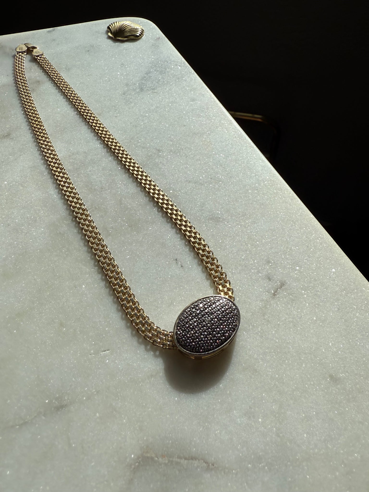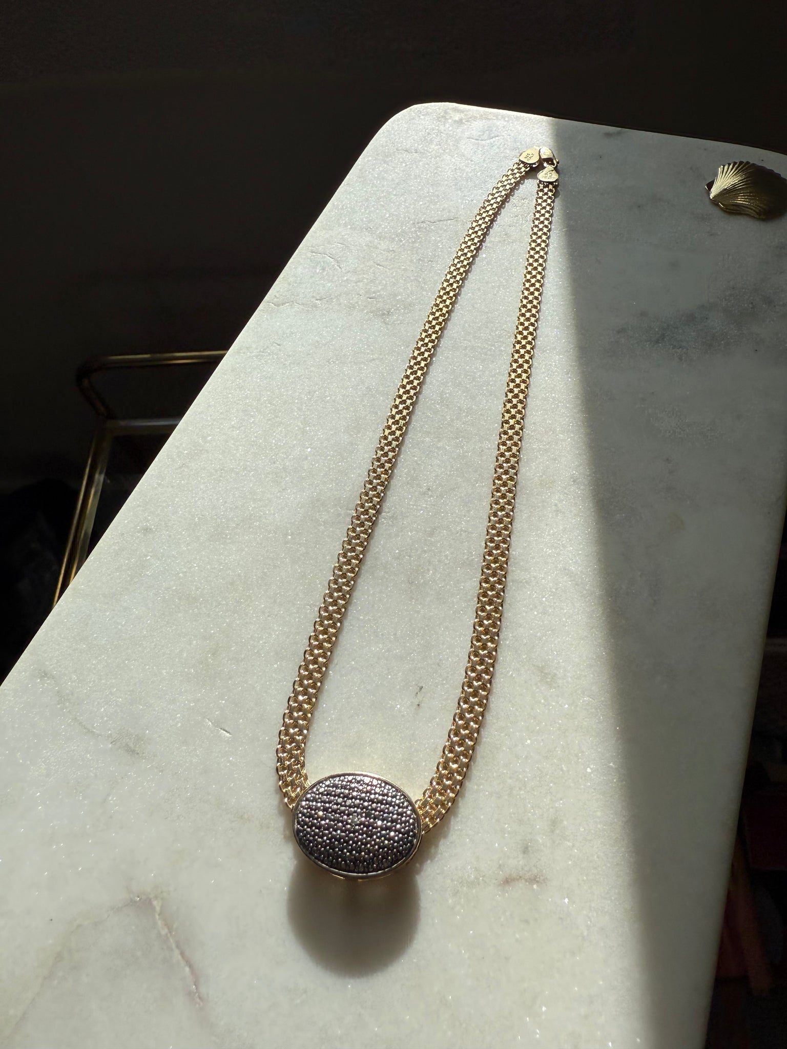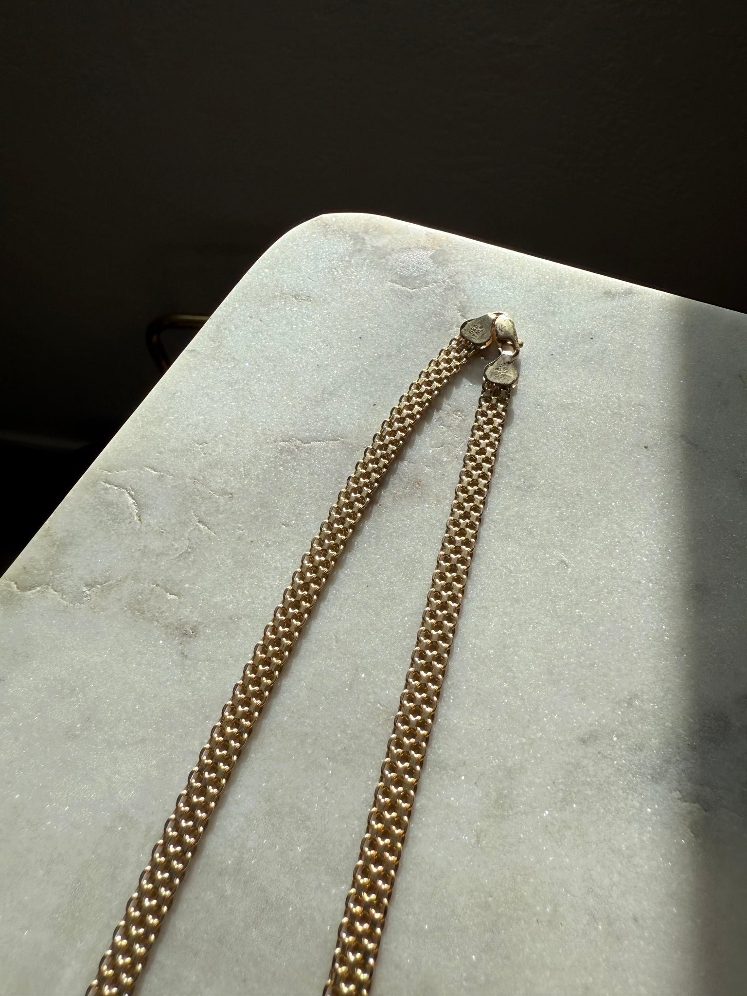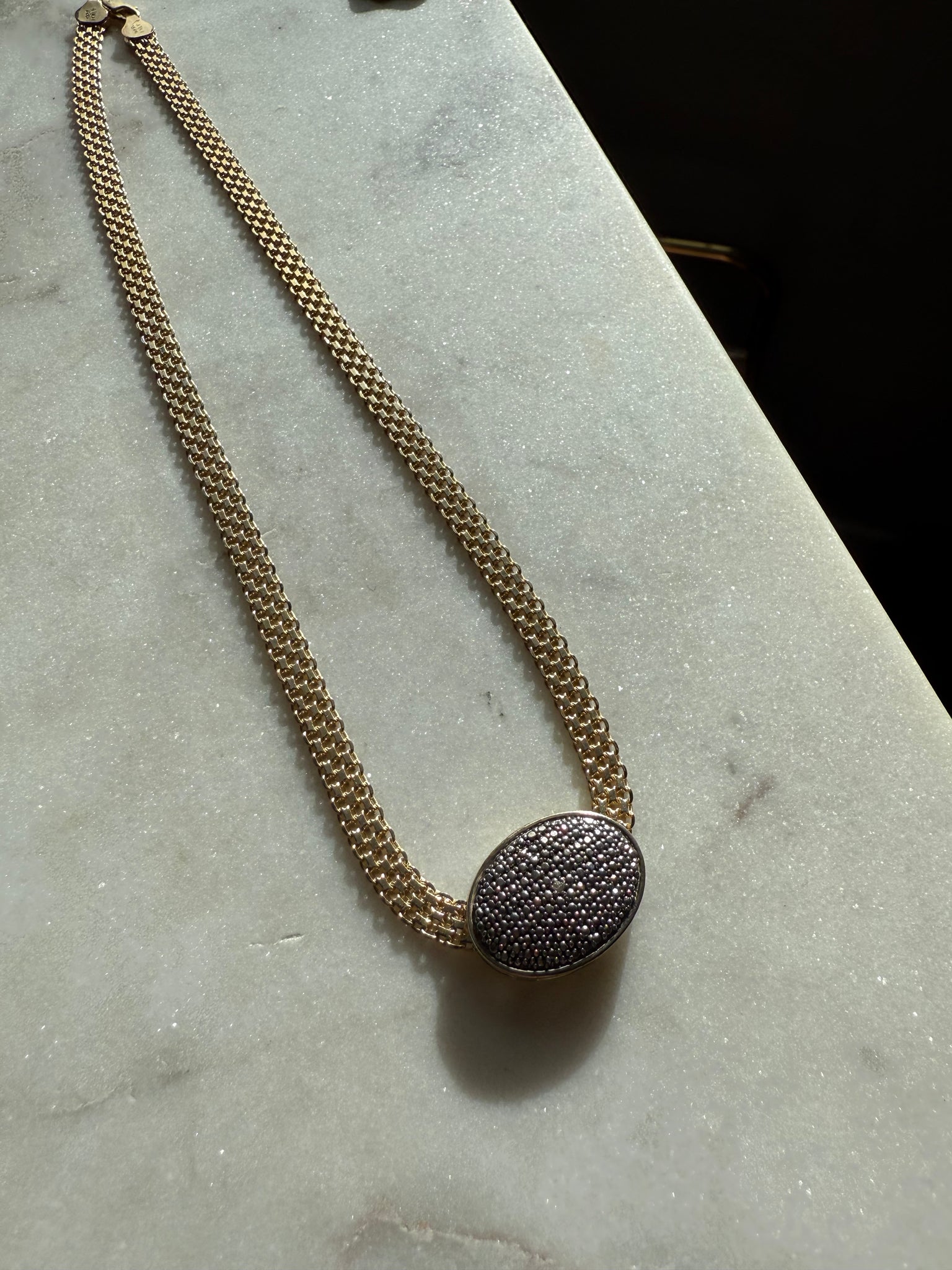 19.1 grams • stamped .925 Italy • 17.75” length, fits like 17” • pendant is 1” x .65” and is silver .925, the rest of the chain is gold vermeil .925
