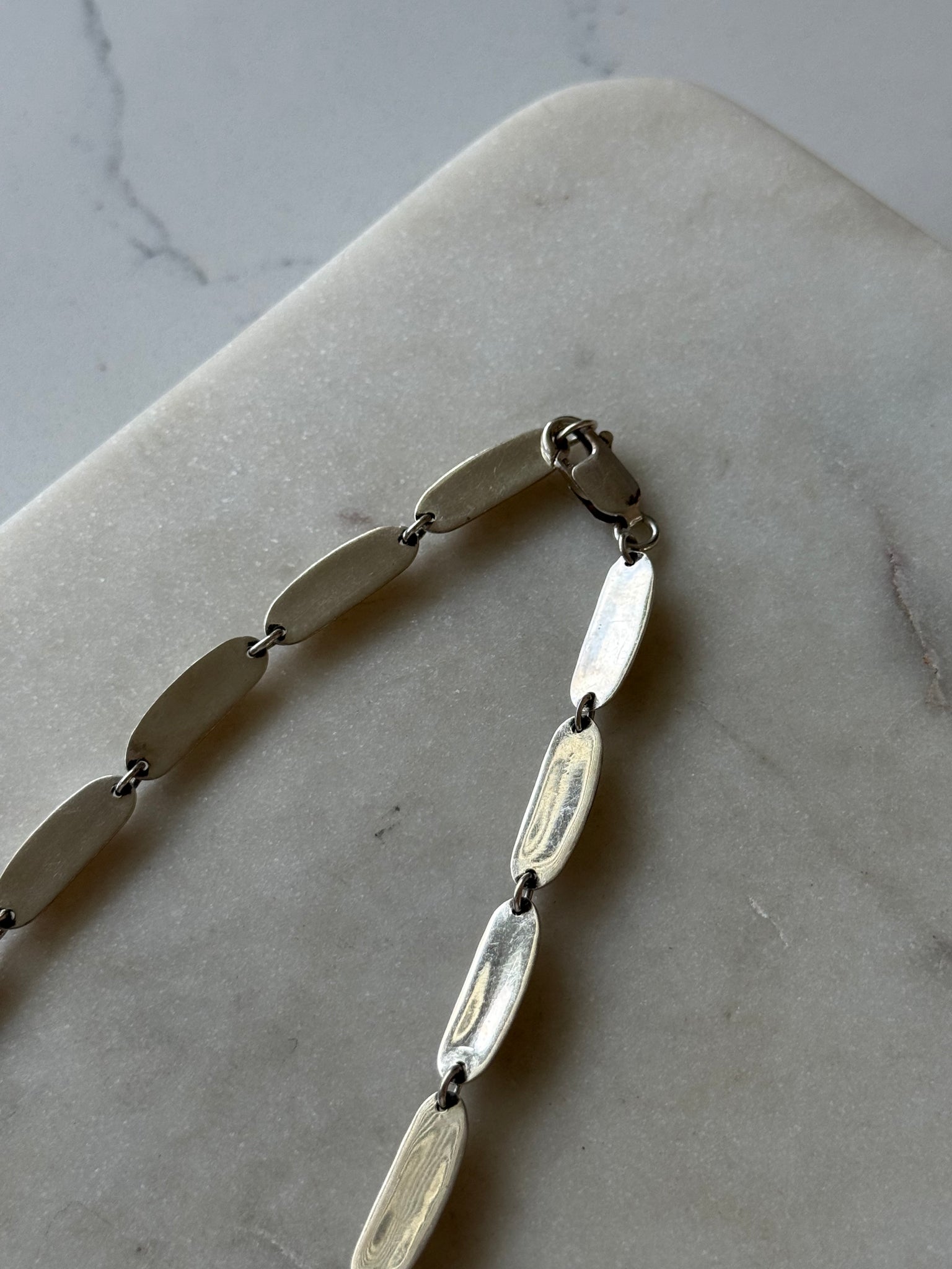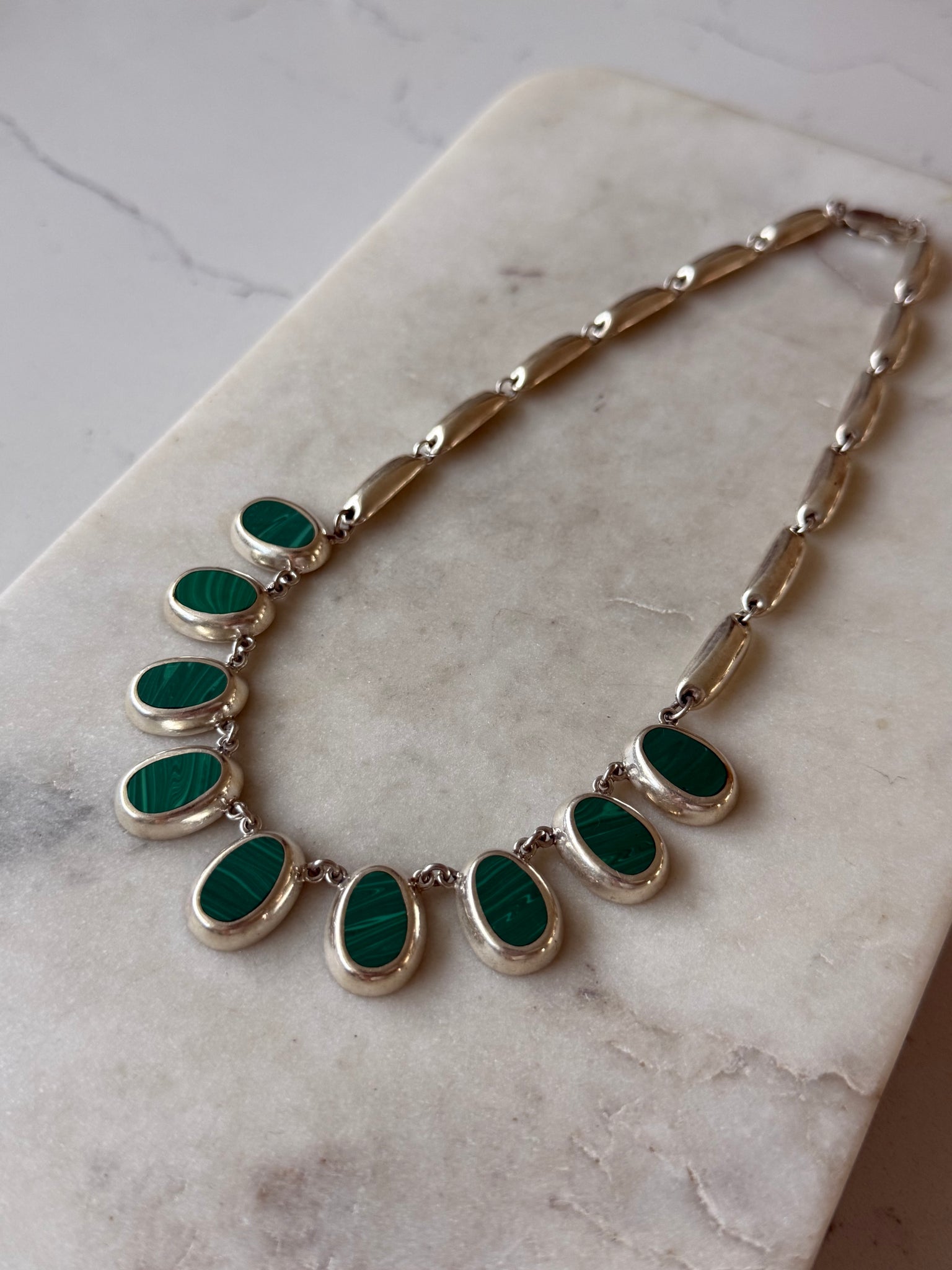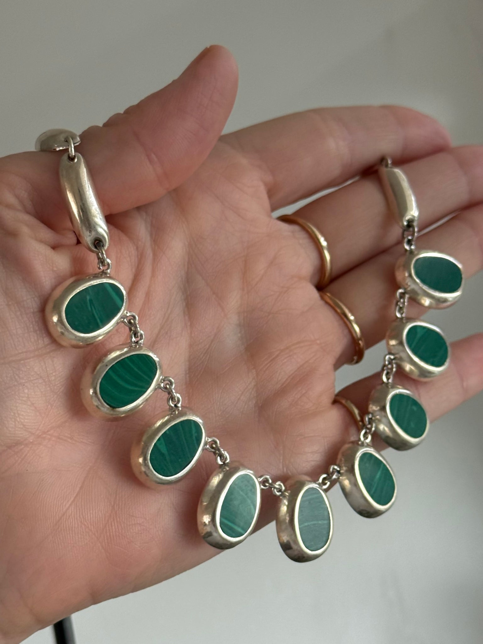 30.9 grams • .925 Sterling silver with malachite inlay • 16.5” length • the malachite pieces measure 18mm x 14mm, the other Sterling links measure 7mm width
