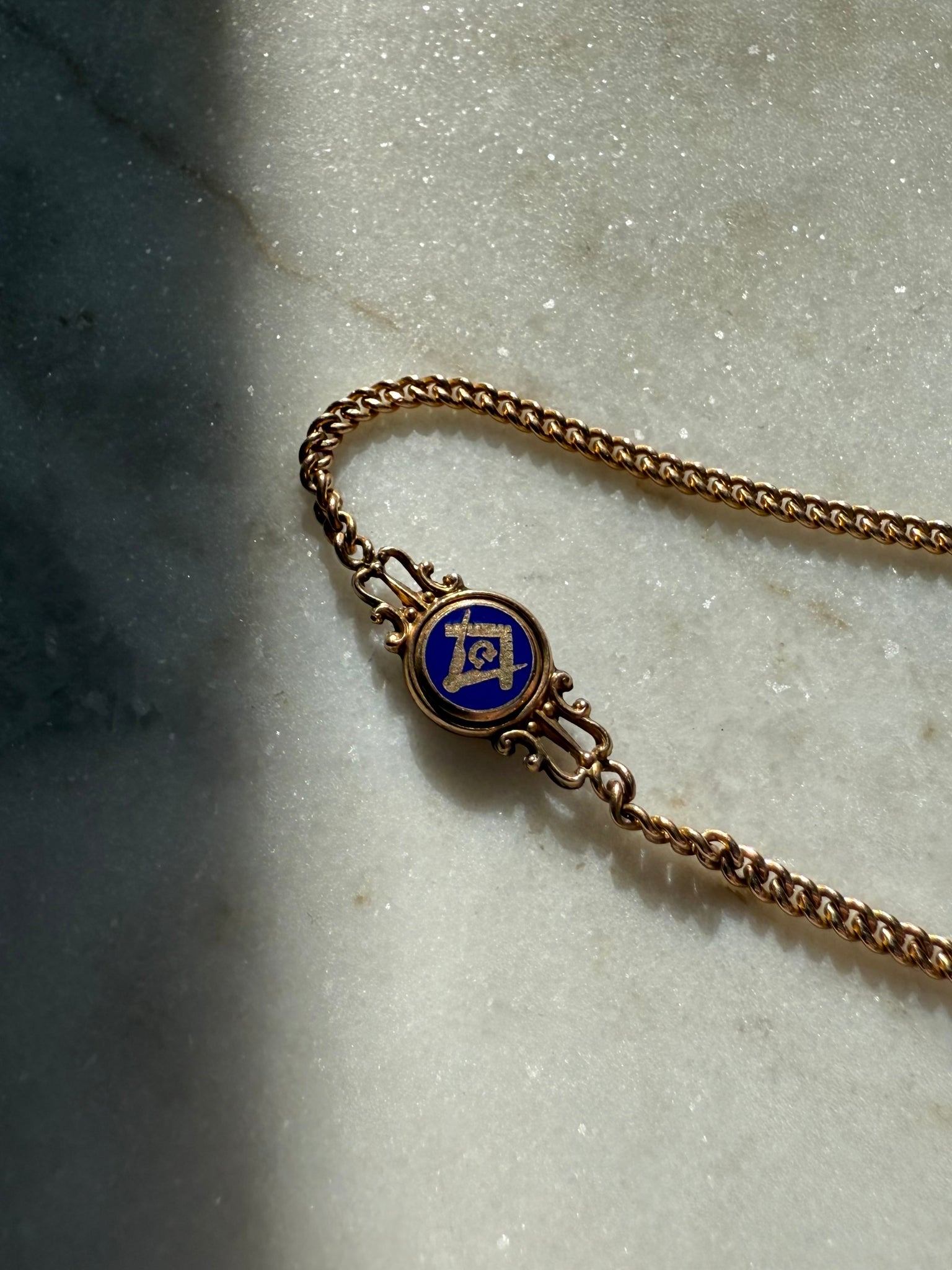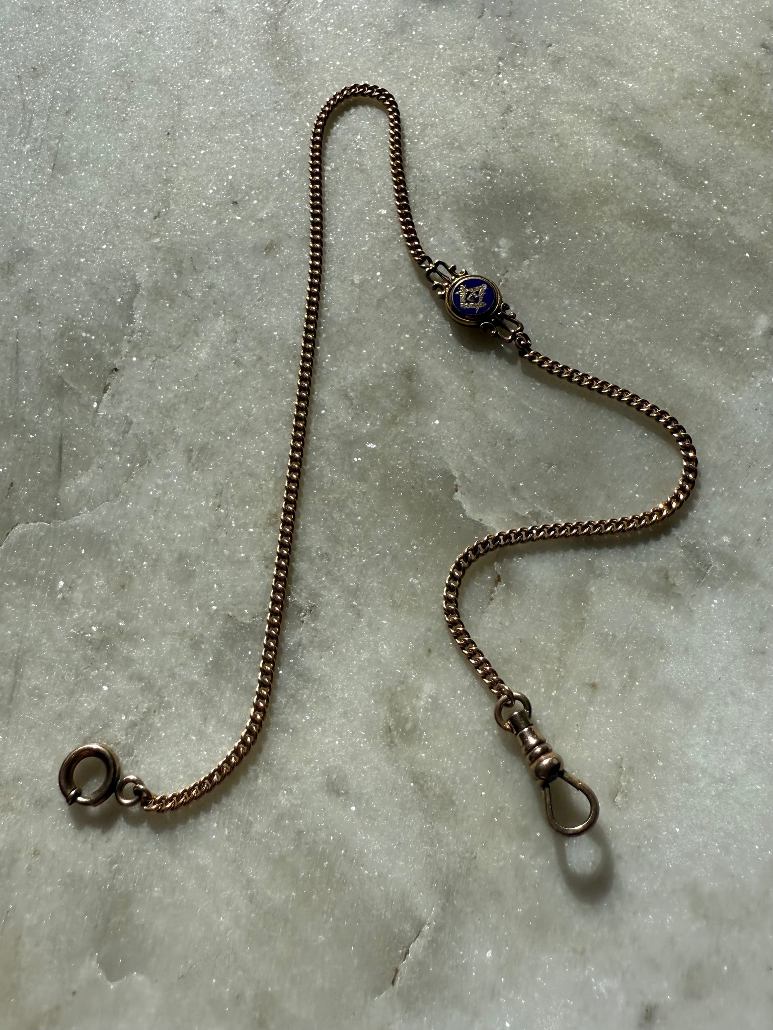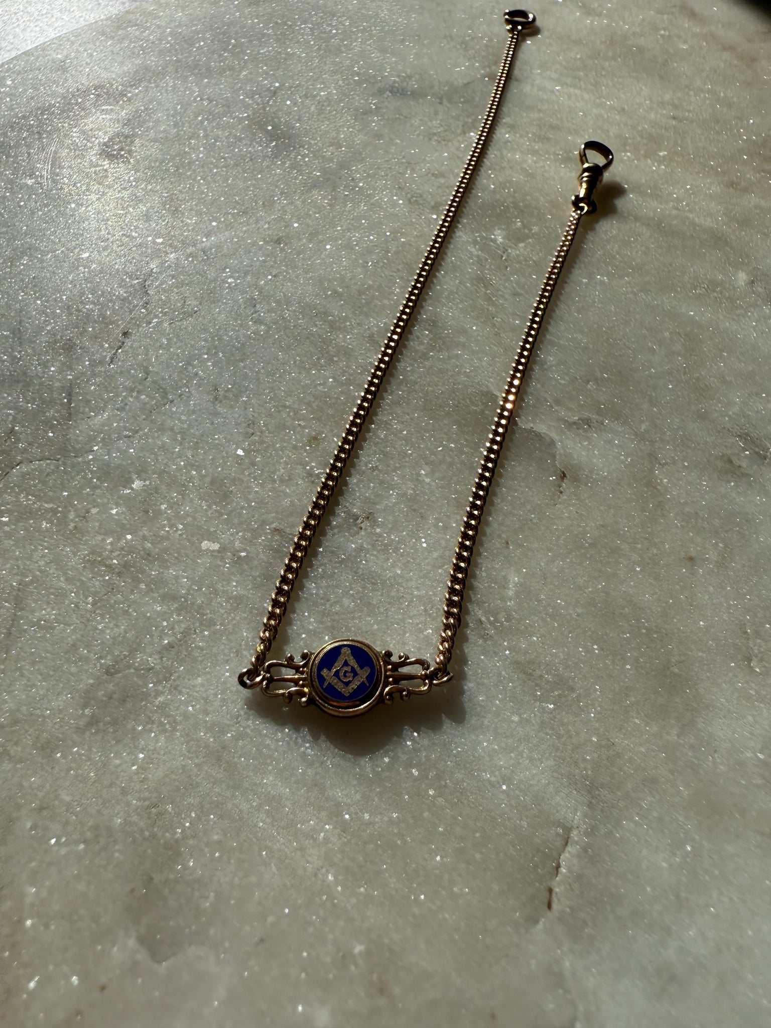 7.7 grams • Bates & Bacon 1/20 12k gold fill • 13” lying flat with measuring tape • mason enamel piece measures 9.85mm • the curb links measure 2.5mm • the dog clip measures 7.5mm • normal antique wear, some oxidation in areas