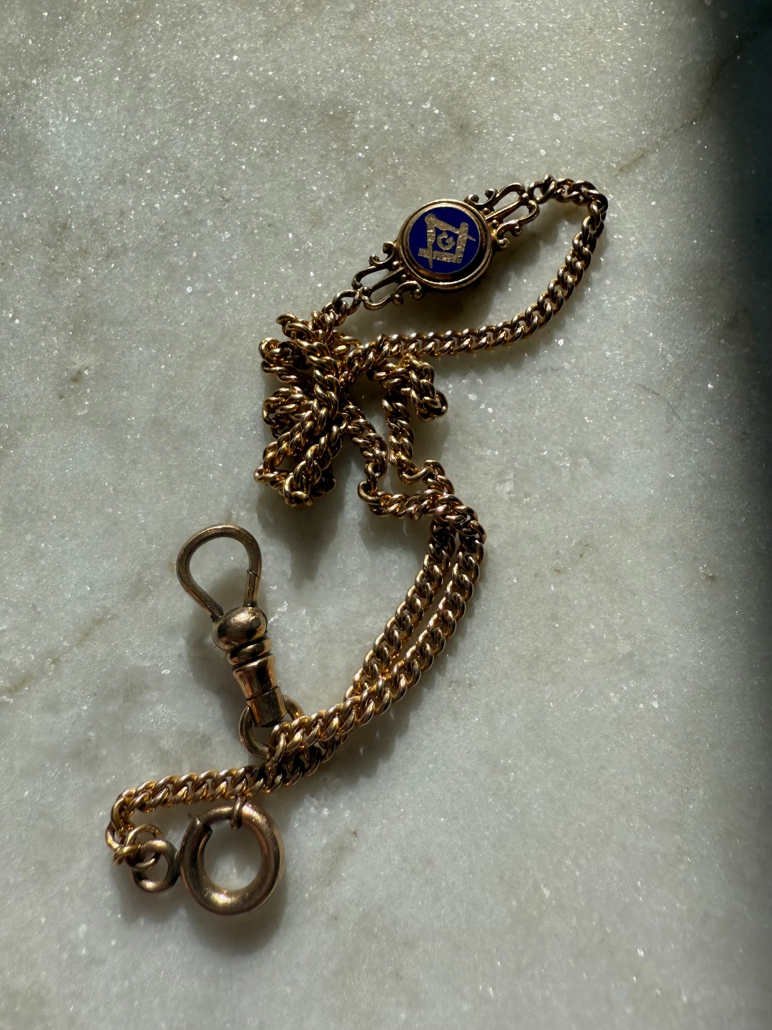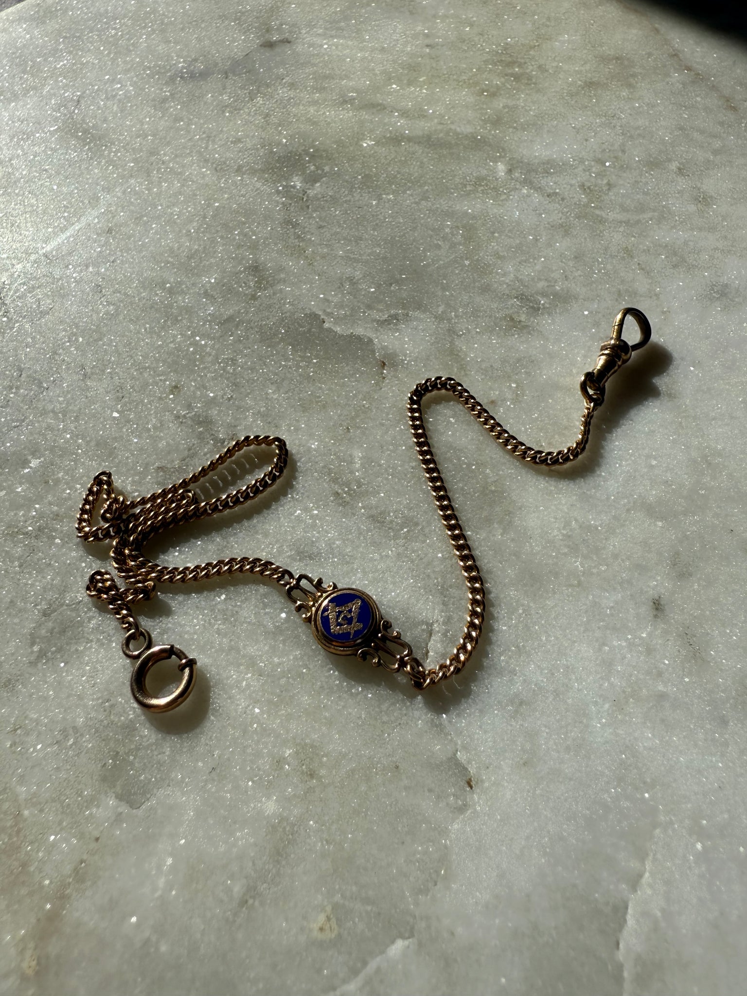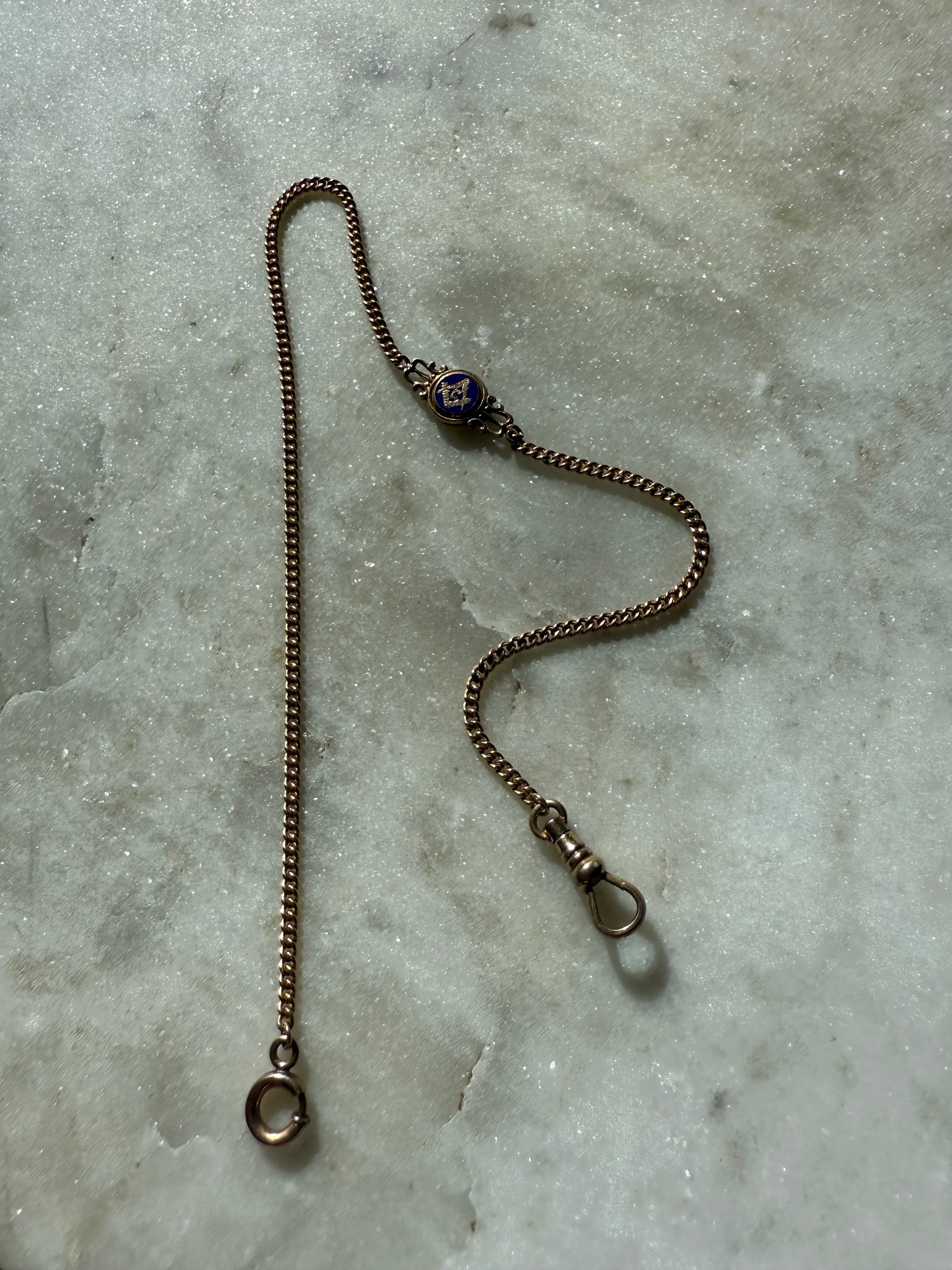 7.7 grams • Bates & Bacon 1/20 12k gold fill • 13” lying flat with measuring tape • mason enamel piece measures 9.85mm • the curb links measure 2.5mm • the dog clip measures 7.5mm • normal antique wear, some oxidation in areas