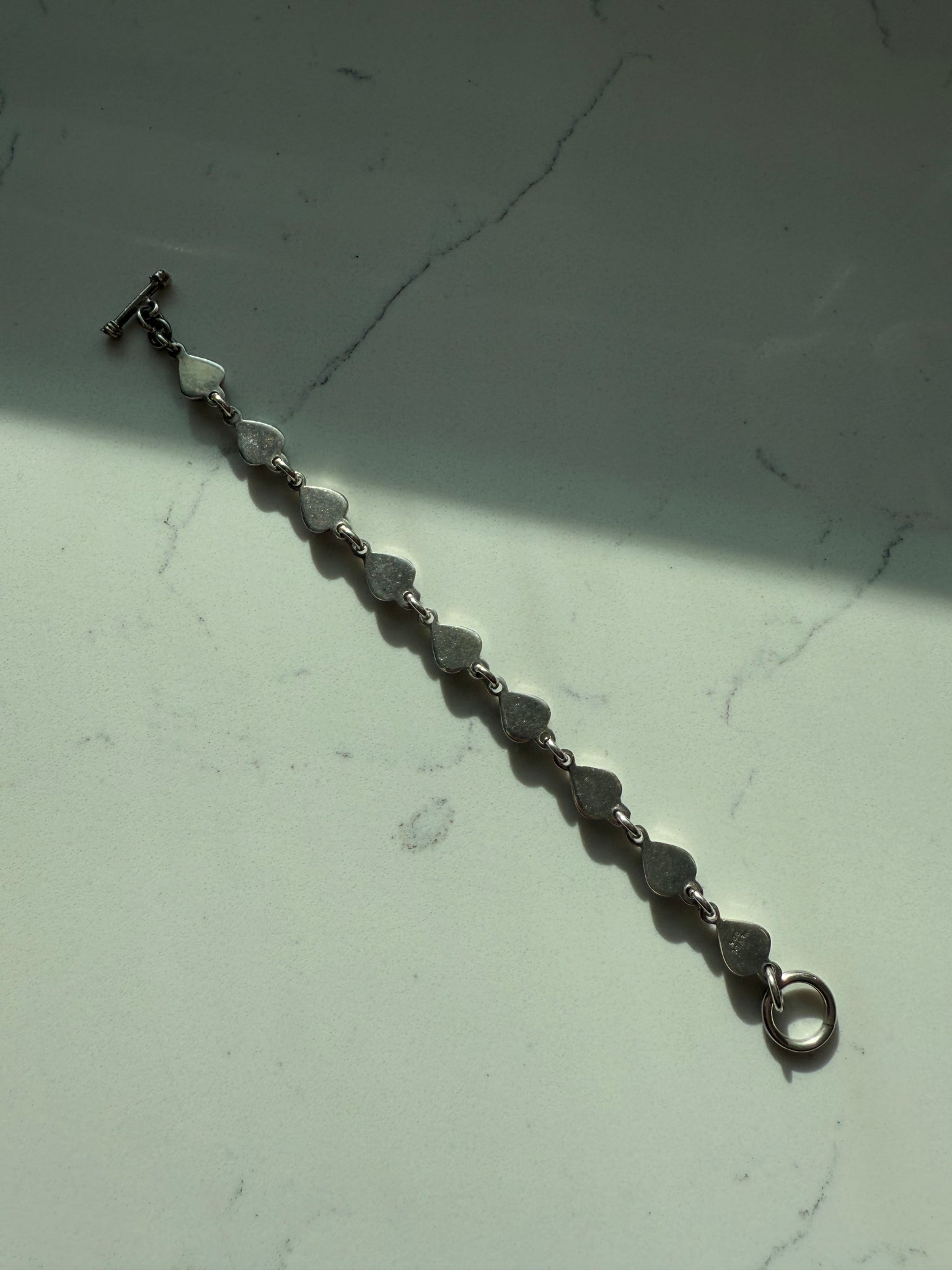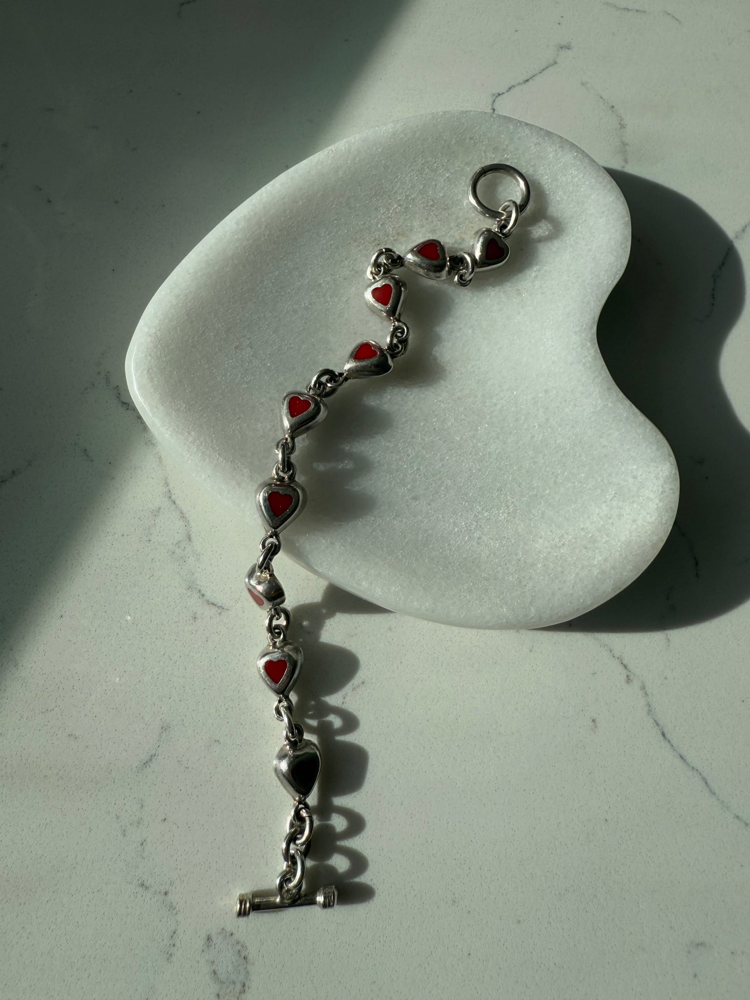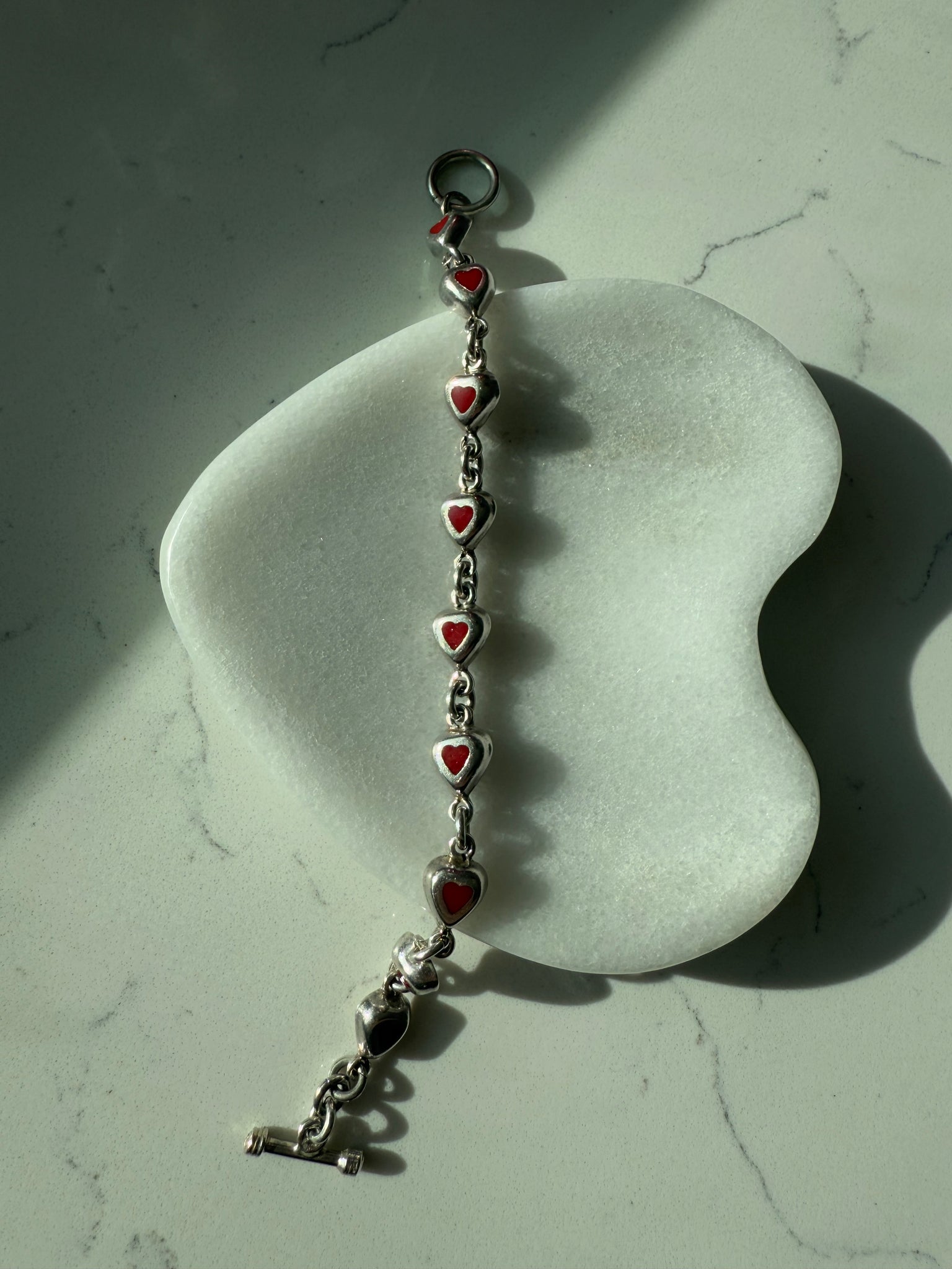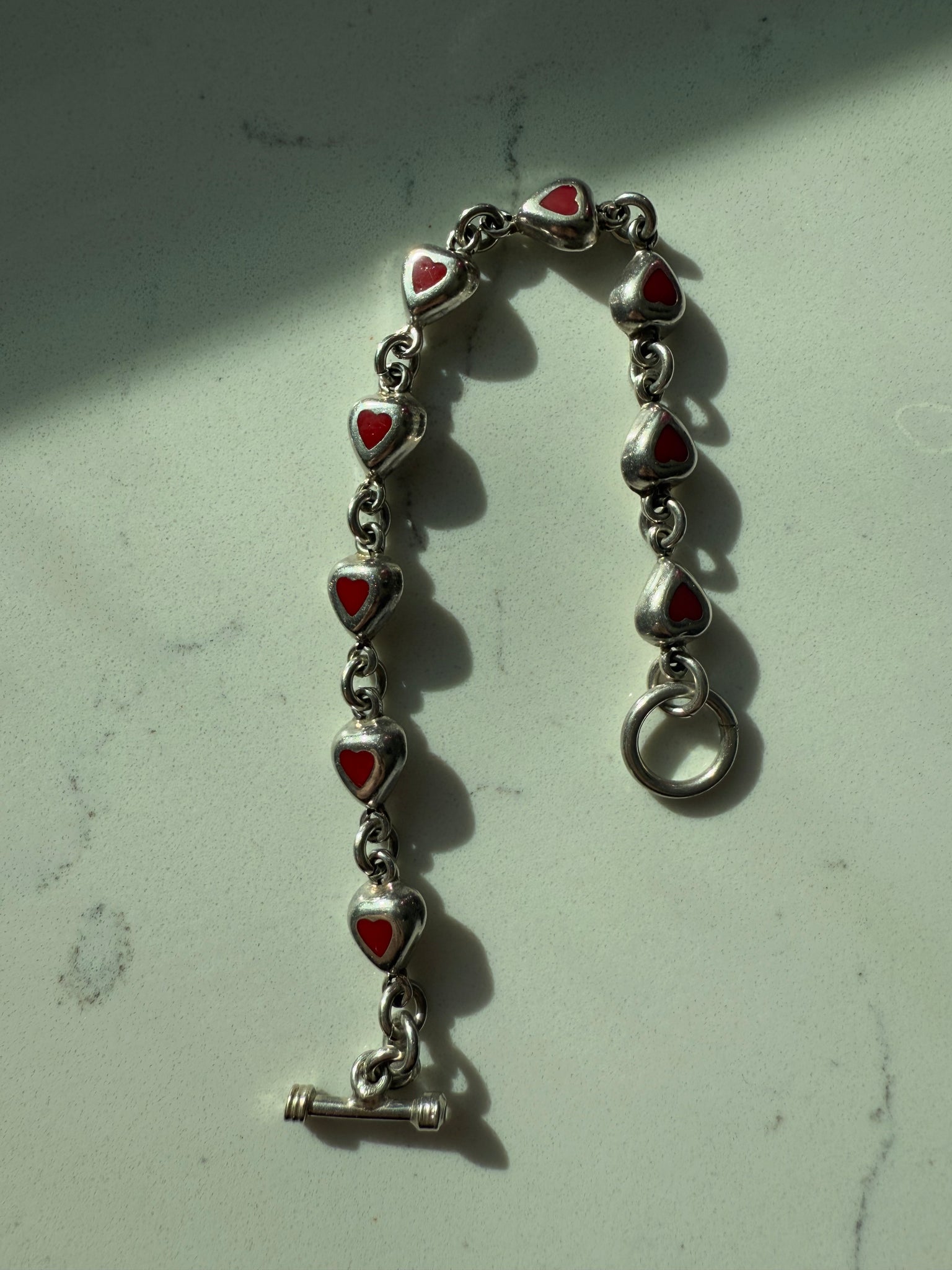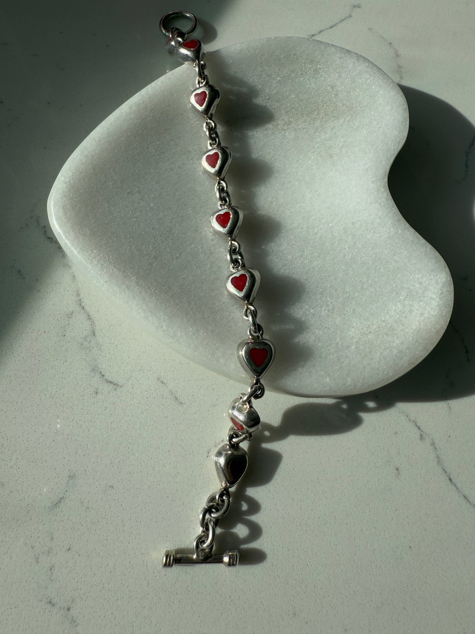 Mexico Red Enamel Heart Sterling Silver Toggle Clasp Bracelet 7.25”
