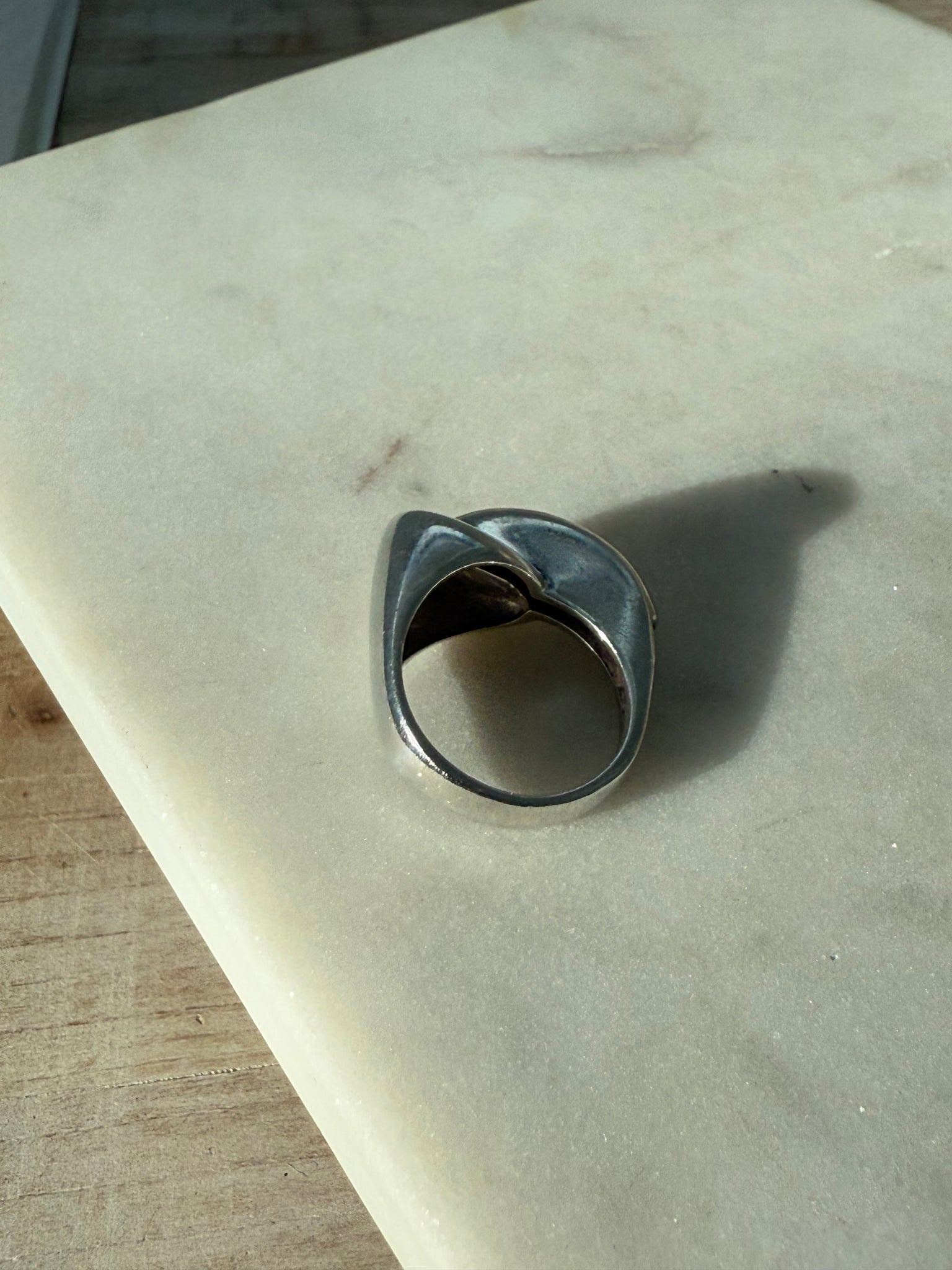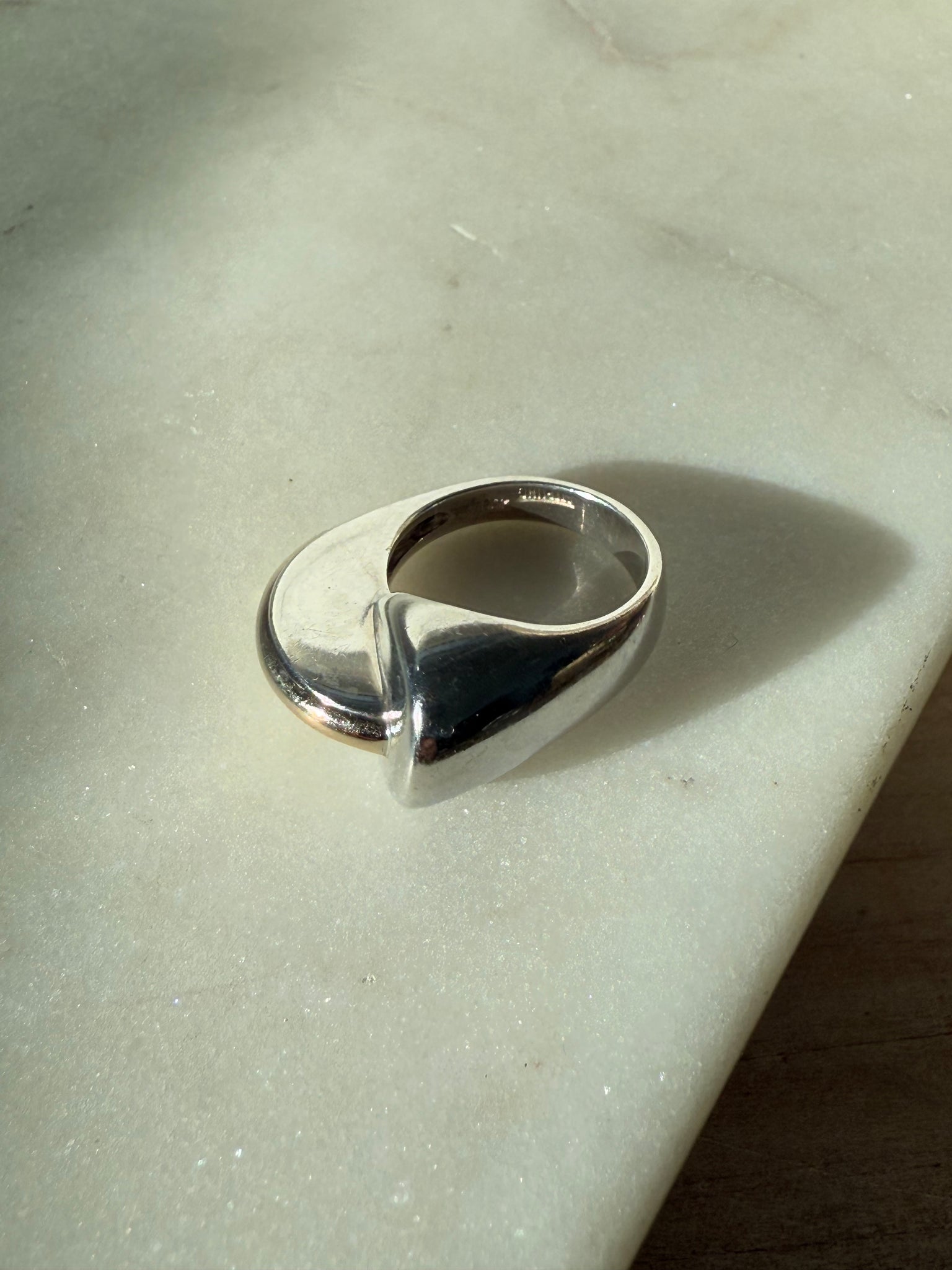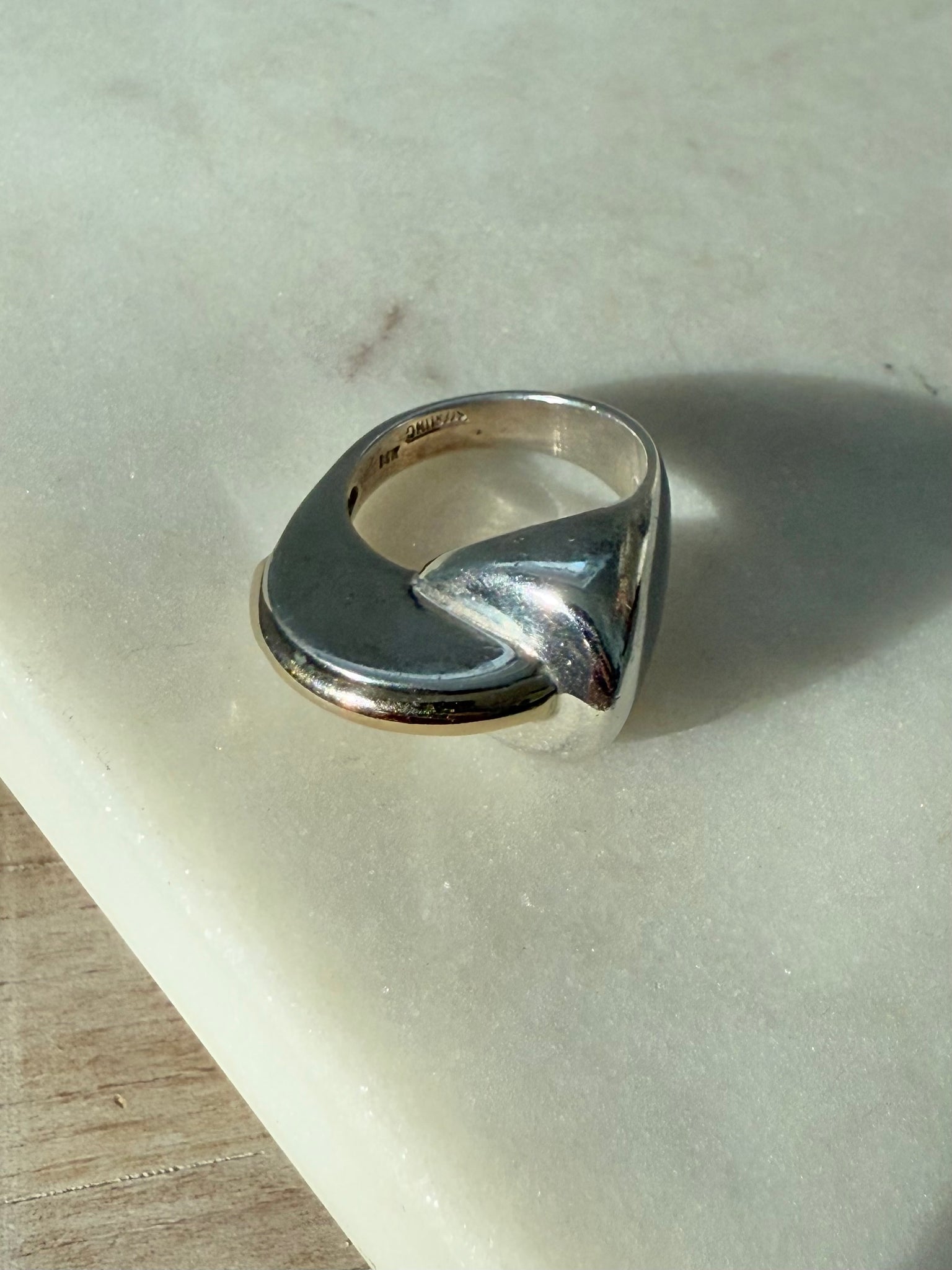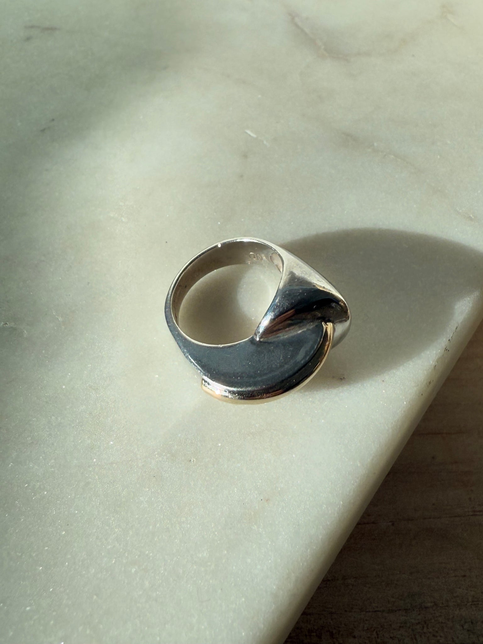.925 Sterling silver with a chunk of 14k gold on top, the gold has a tiny dent in it • size 7 • 7.8 grams