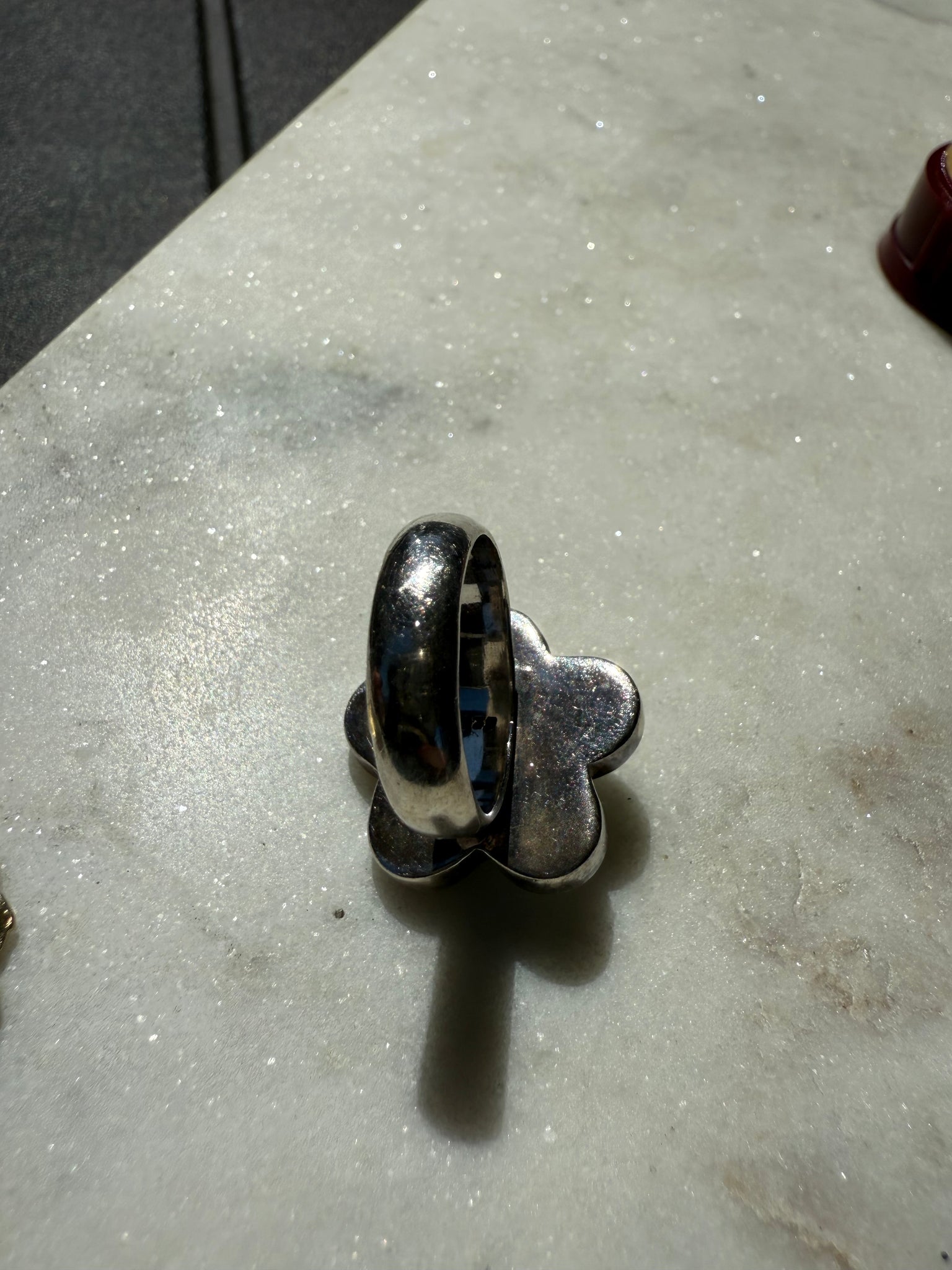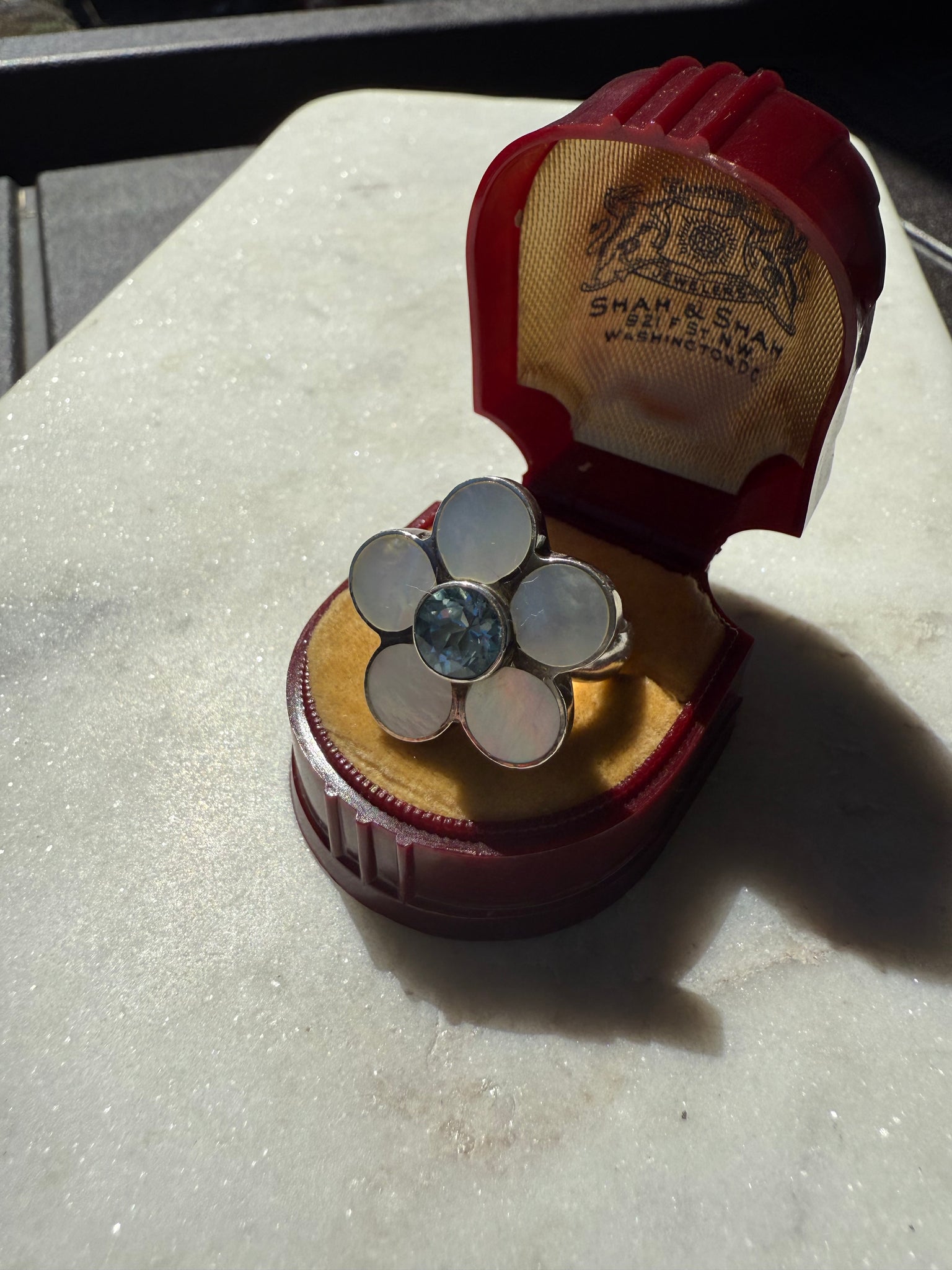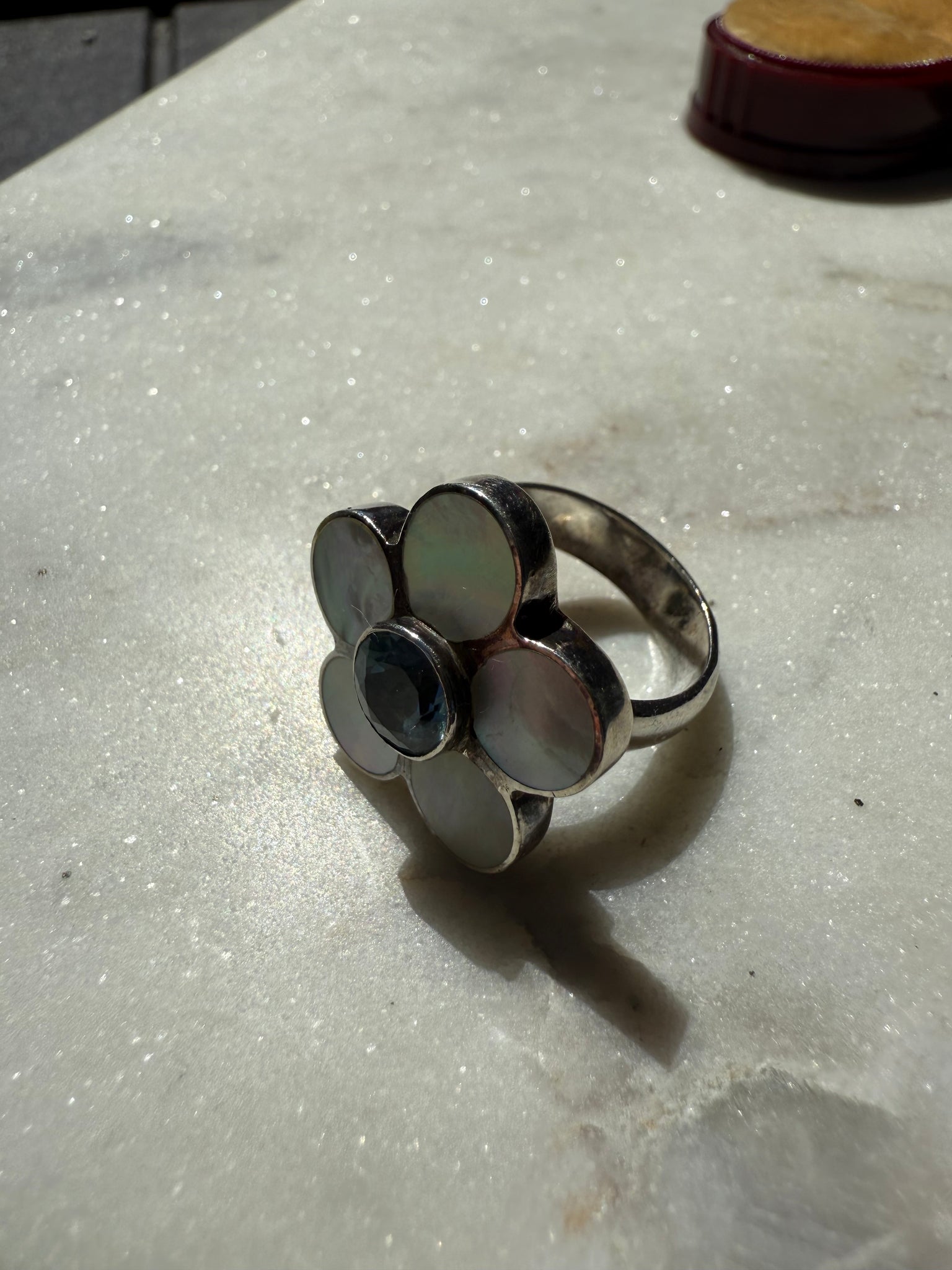 Mother of Pearl & Blue Topaz Flower Ring Size 7