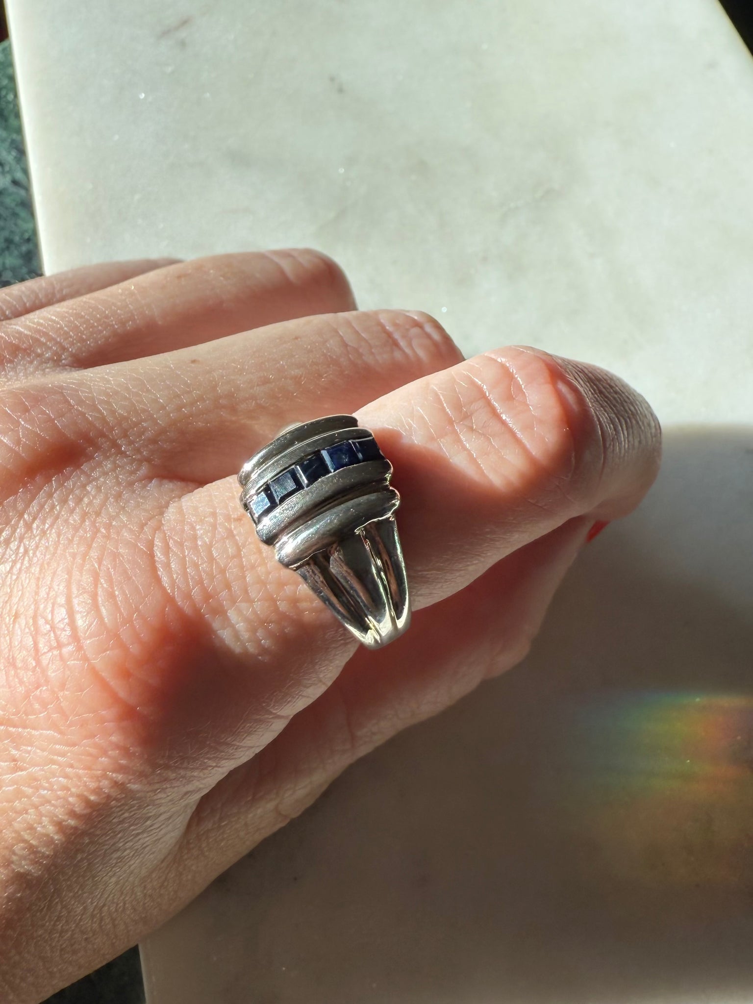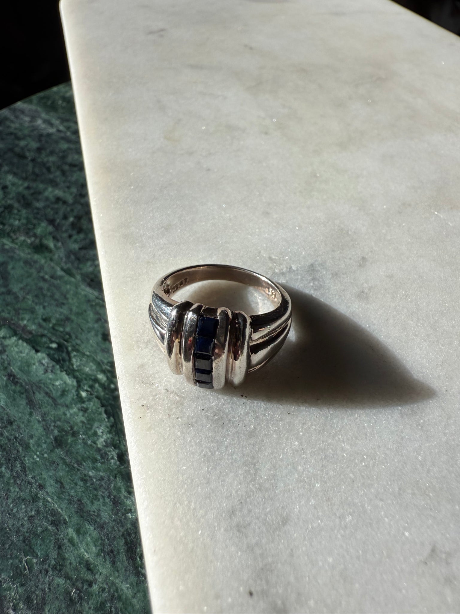 Ring size 8.25 • .925 Sterling silver with blue sapphire stones • 6.3 grams