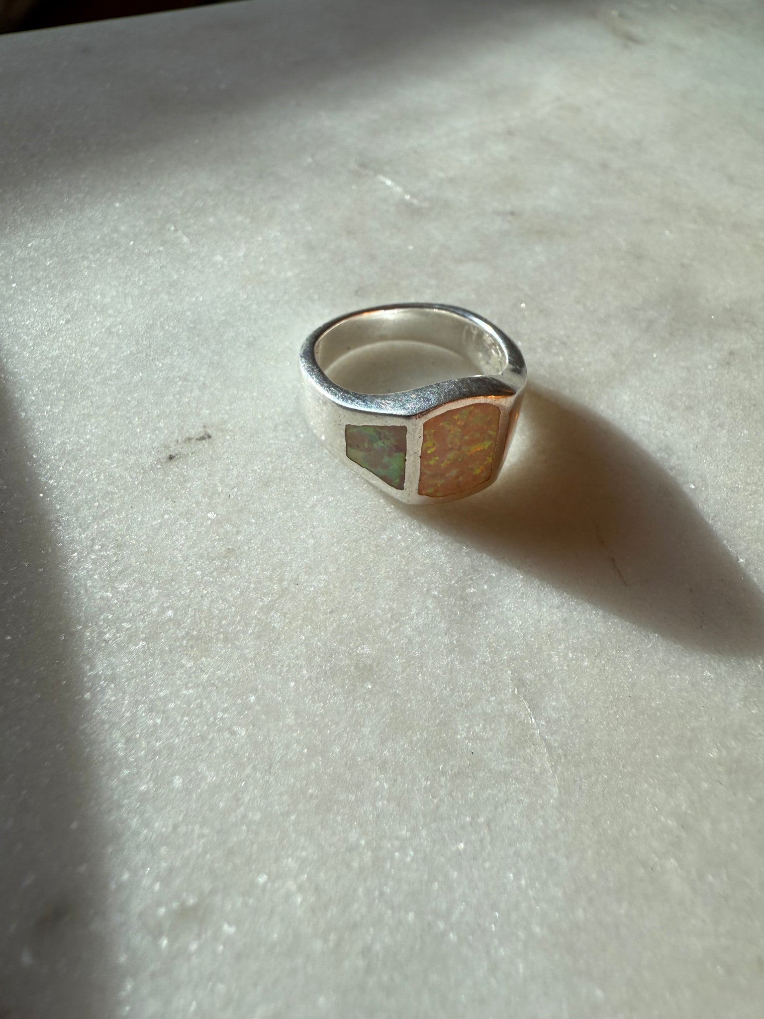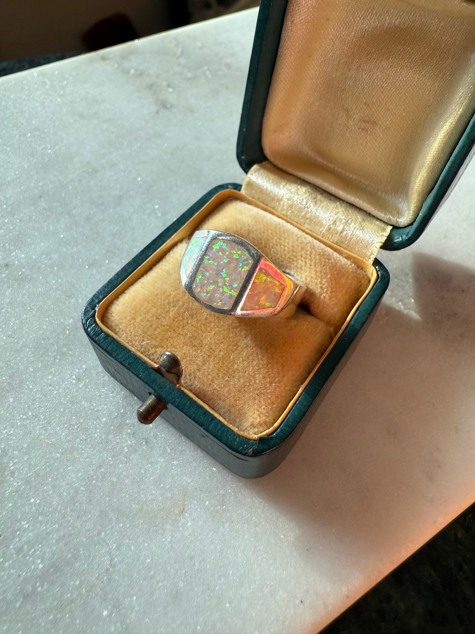 .925 Sterling Silver rhodium plated with simulated opal • 5.6 grams • Ring size 5.75