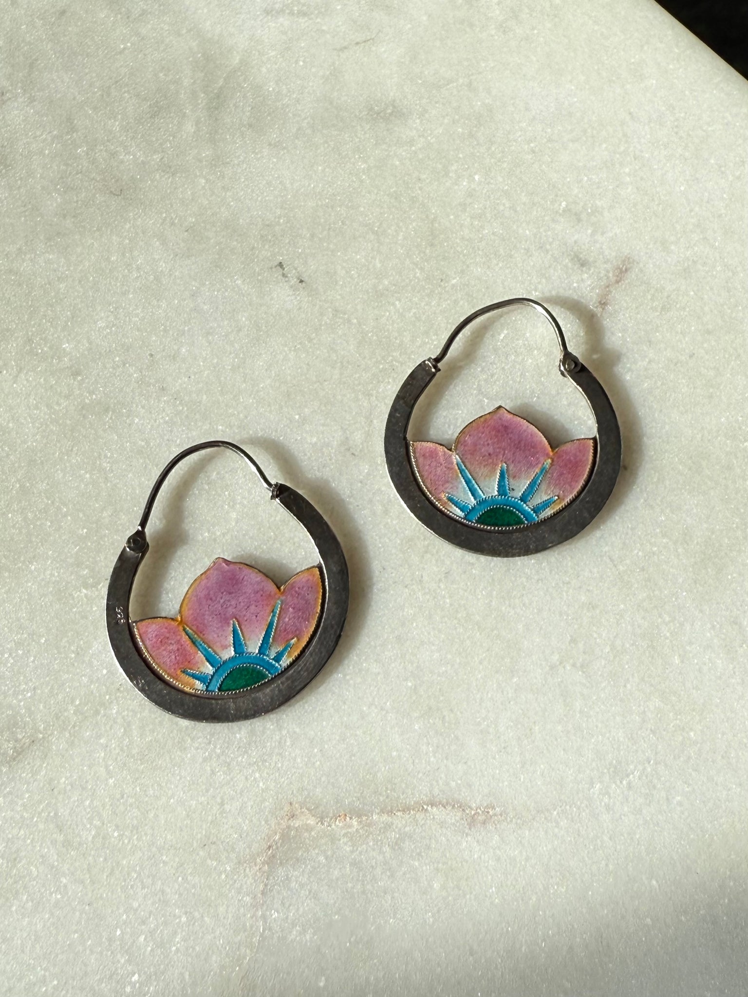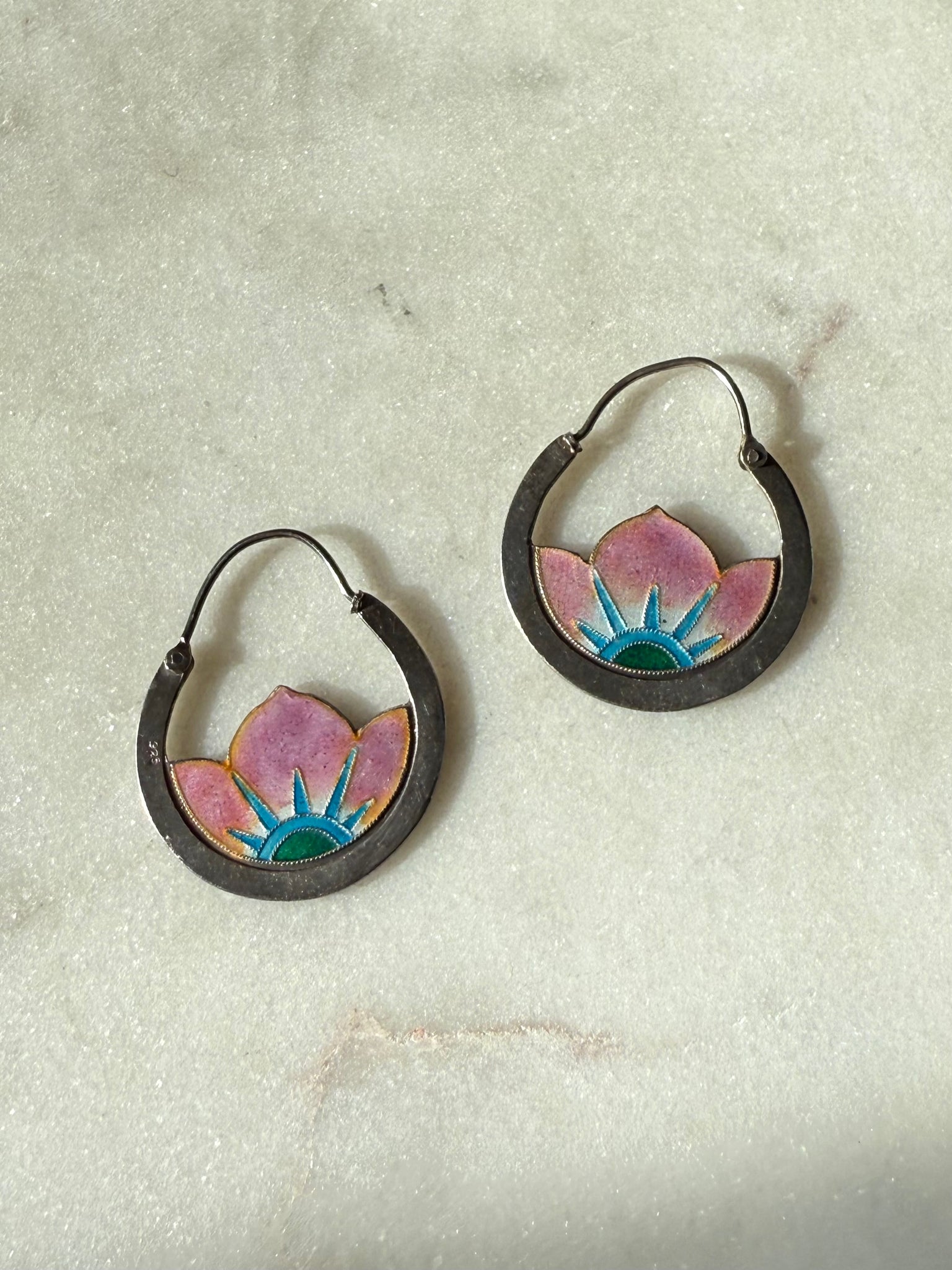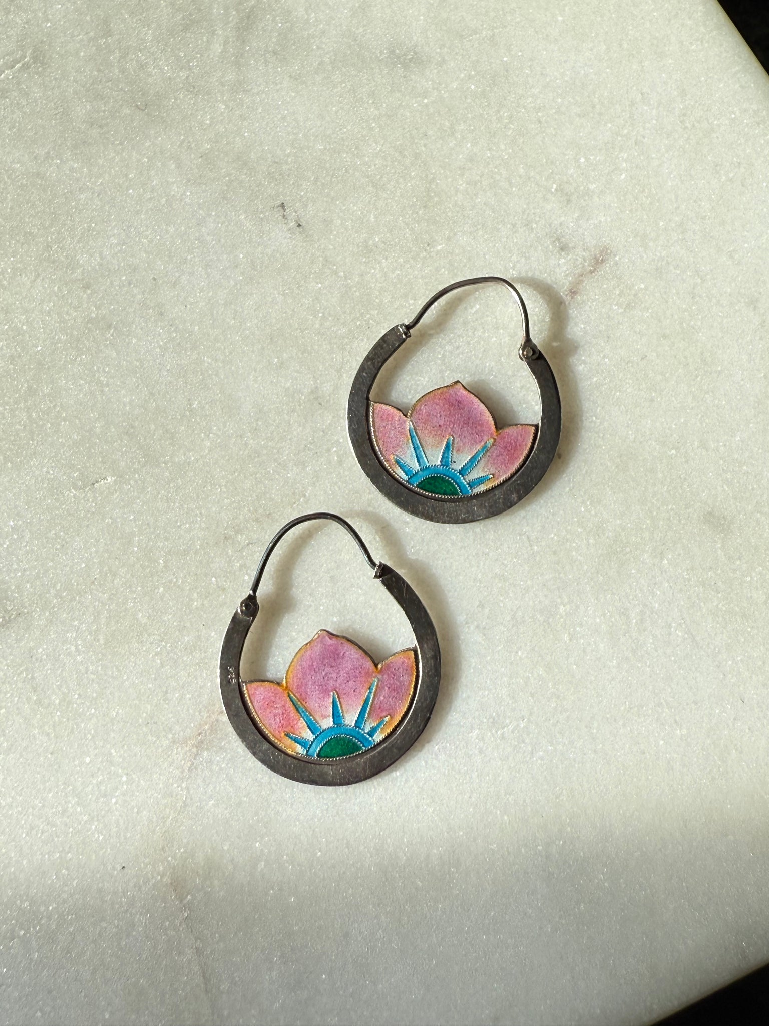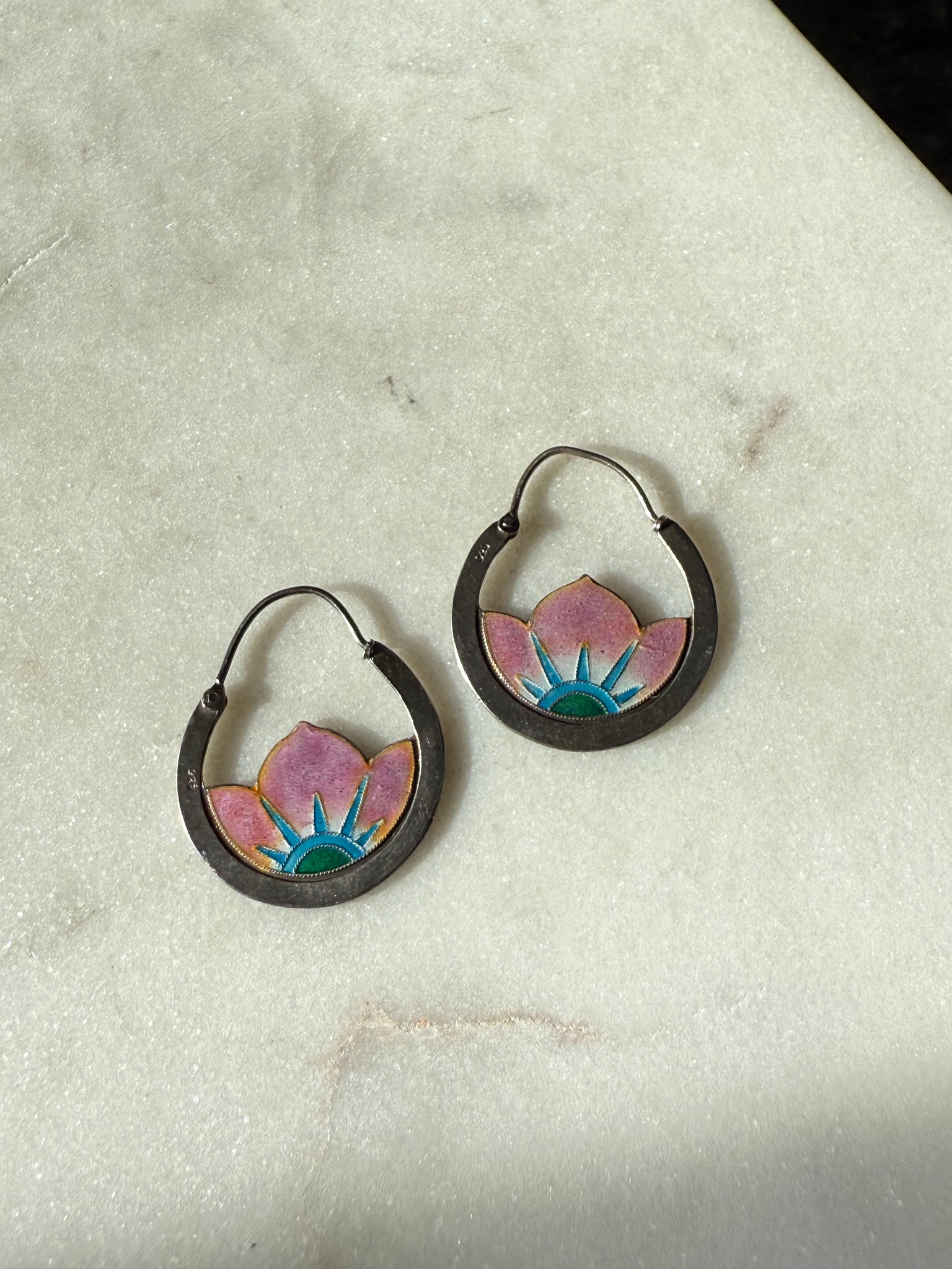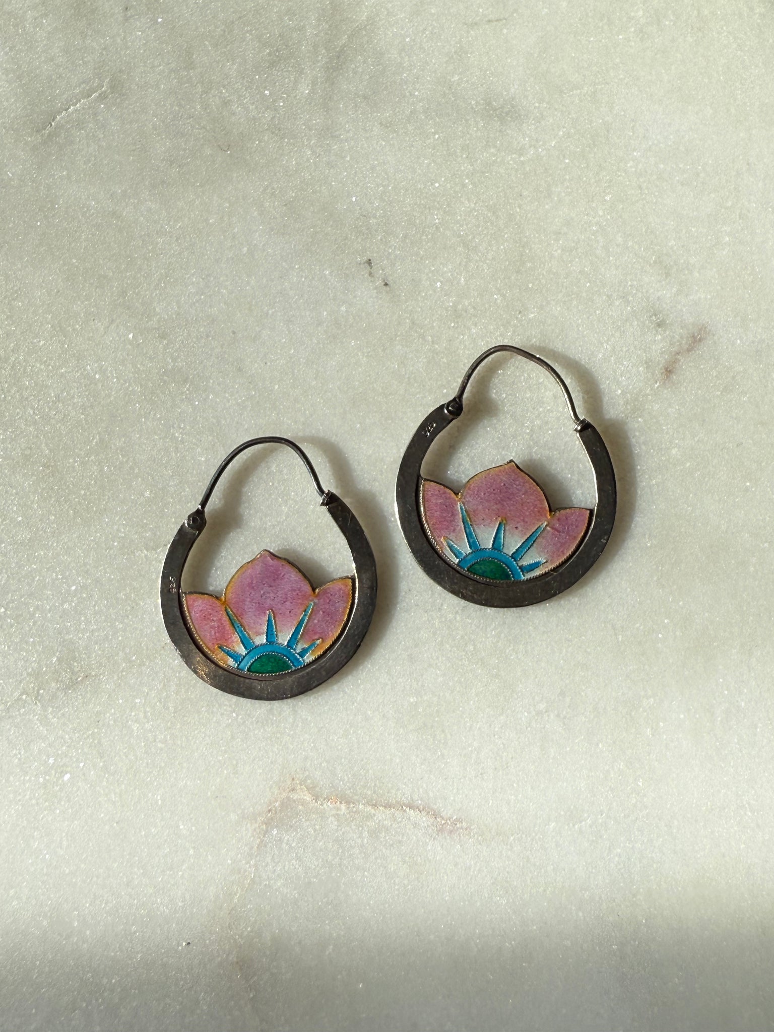 1970s Pink Enamel Flower Sterling Silver Hoop Earrings