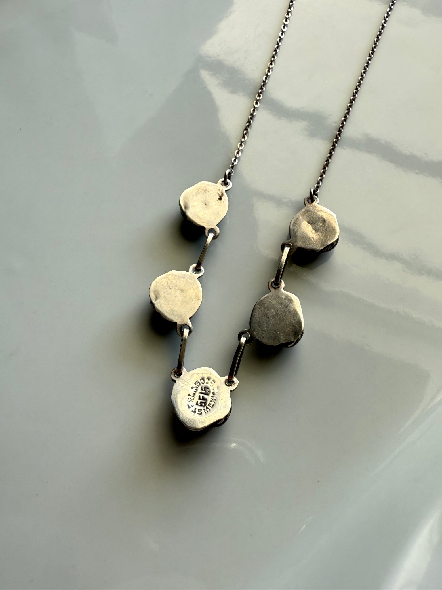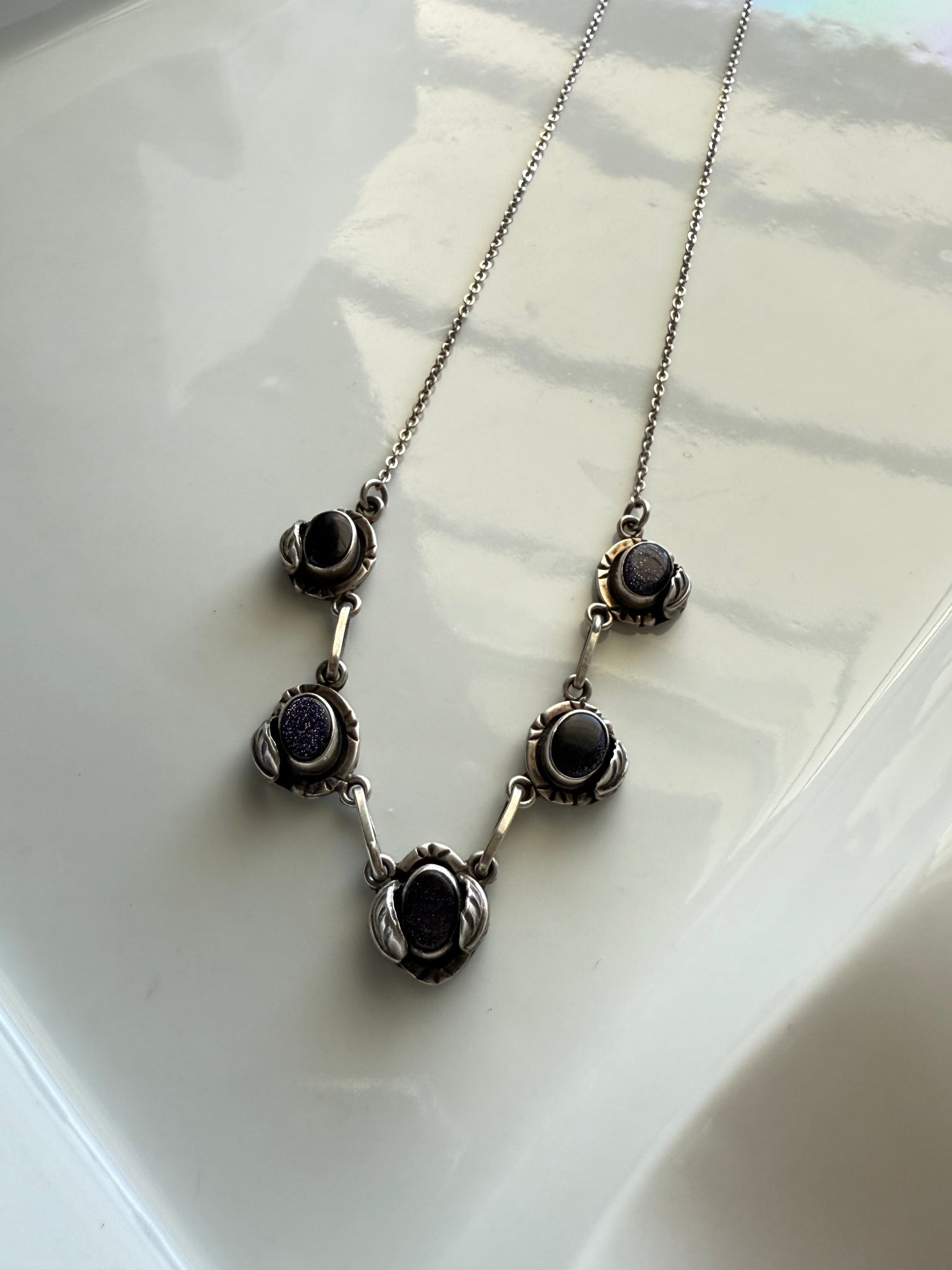 .925 Sterling silver • unsure of the pretty purple glitter stone • 10.9 grams • 20” length • 1mm chain link • 12mm where the purple stones are