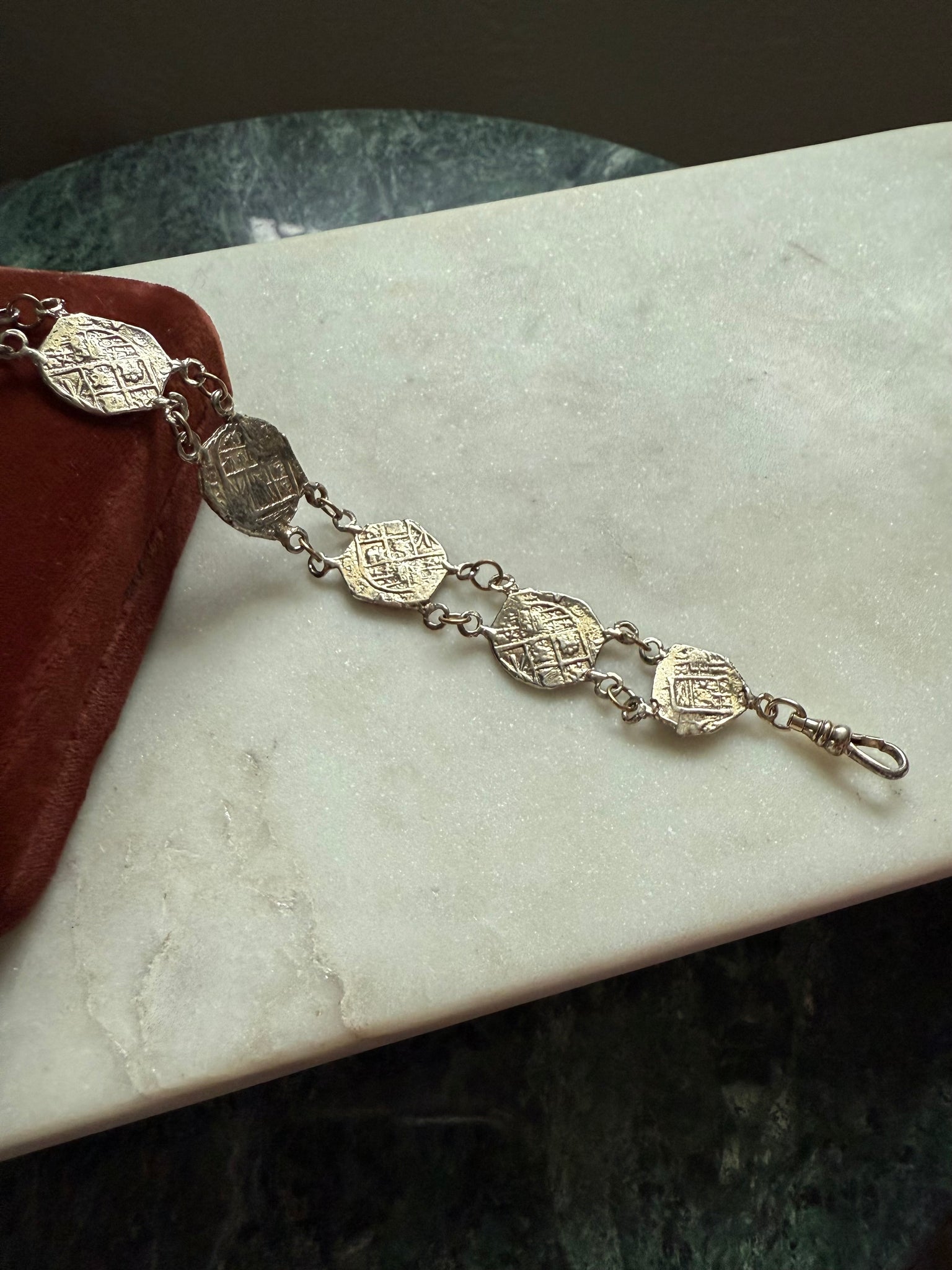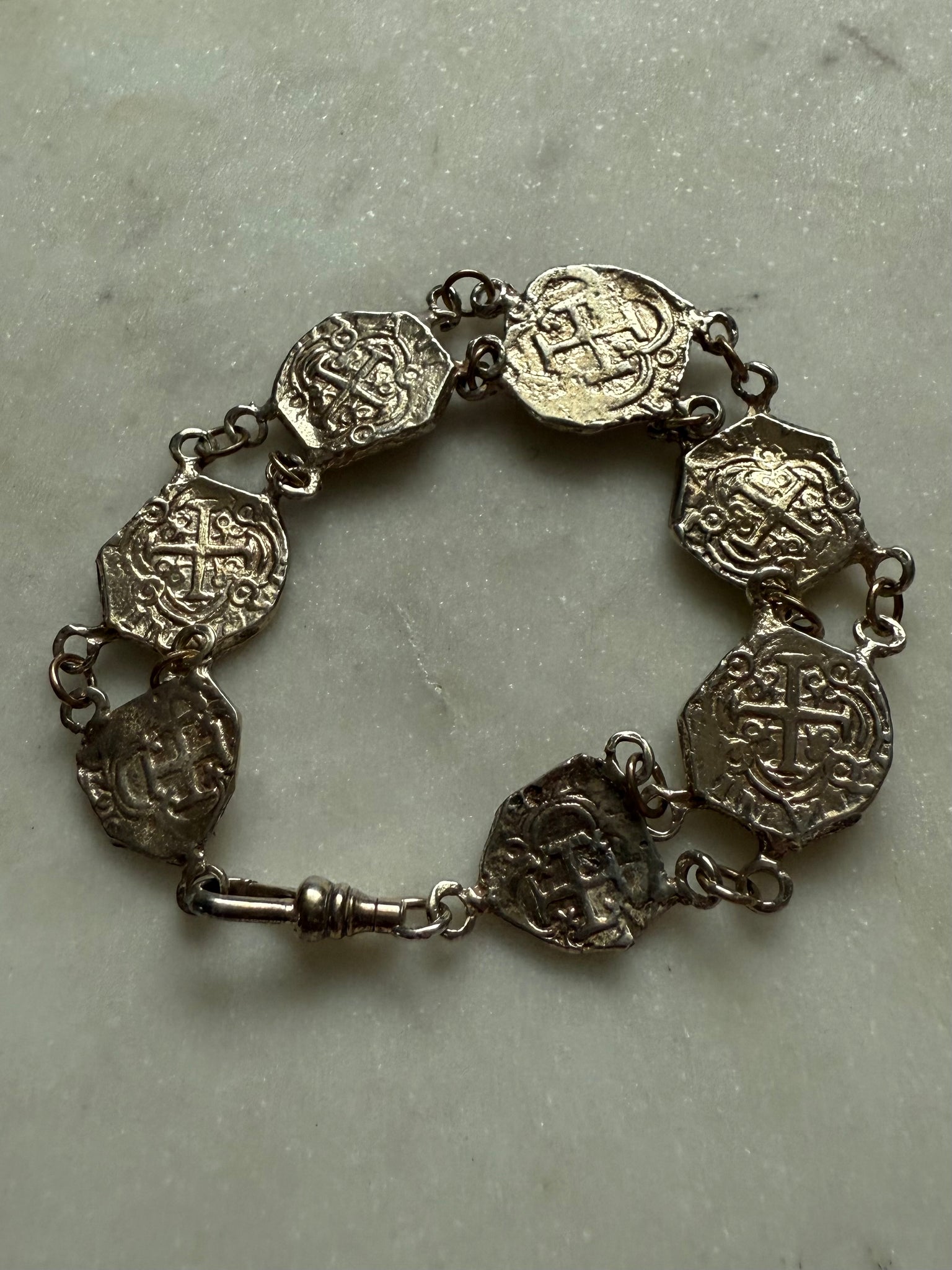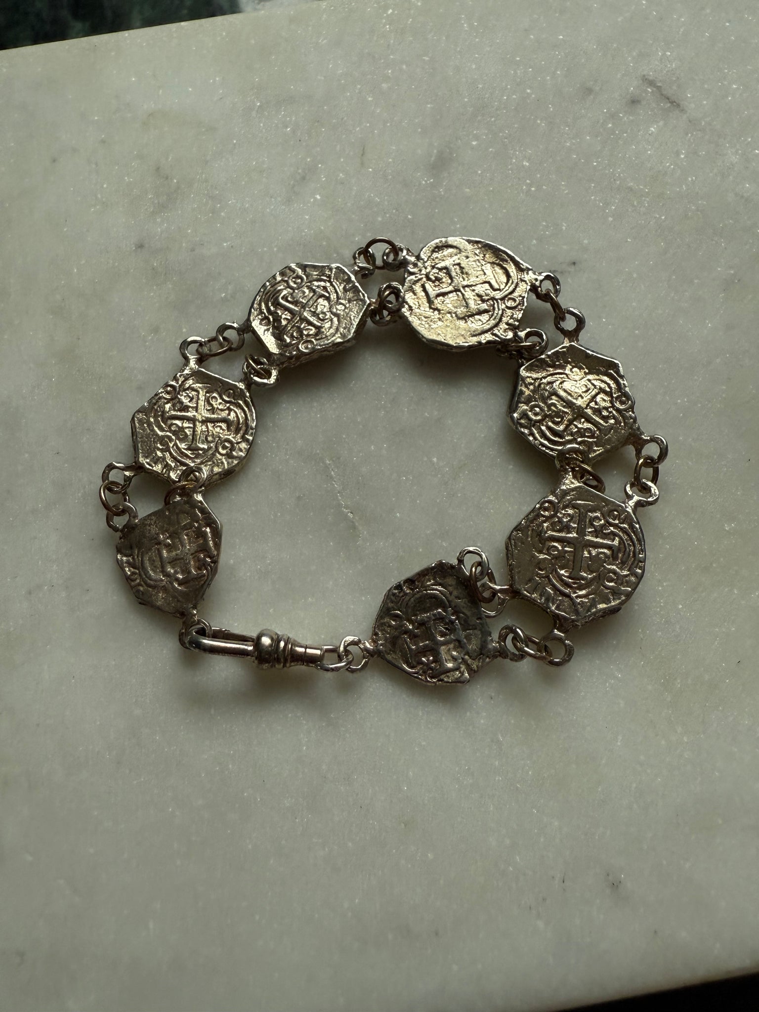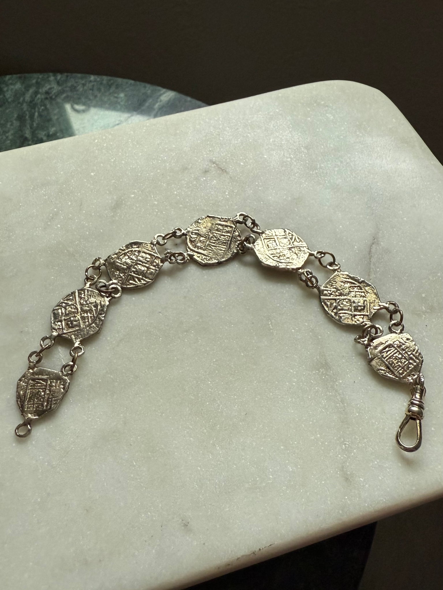 22.6 grams • .925 Sterling silver, the jump rings seem to be another base metal, not sterling • 7.5” length, best for 7” wrist and under