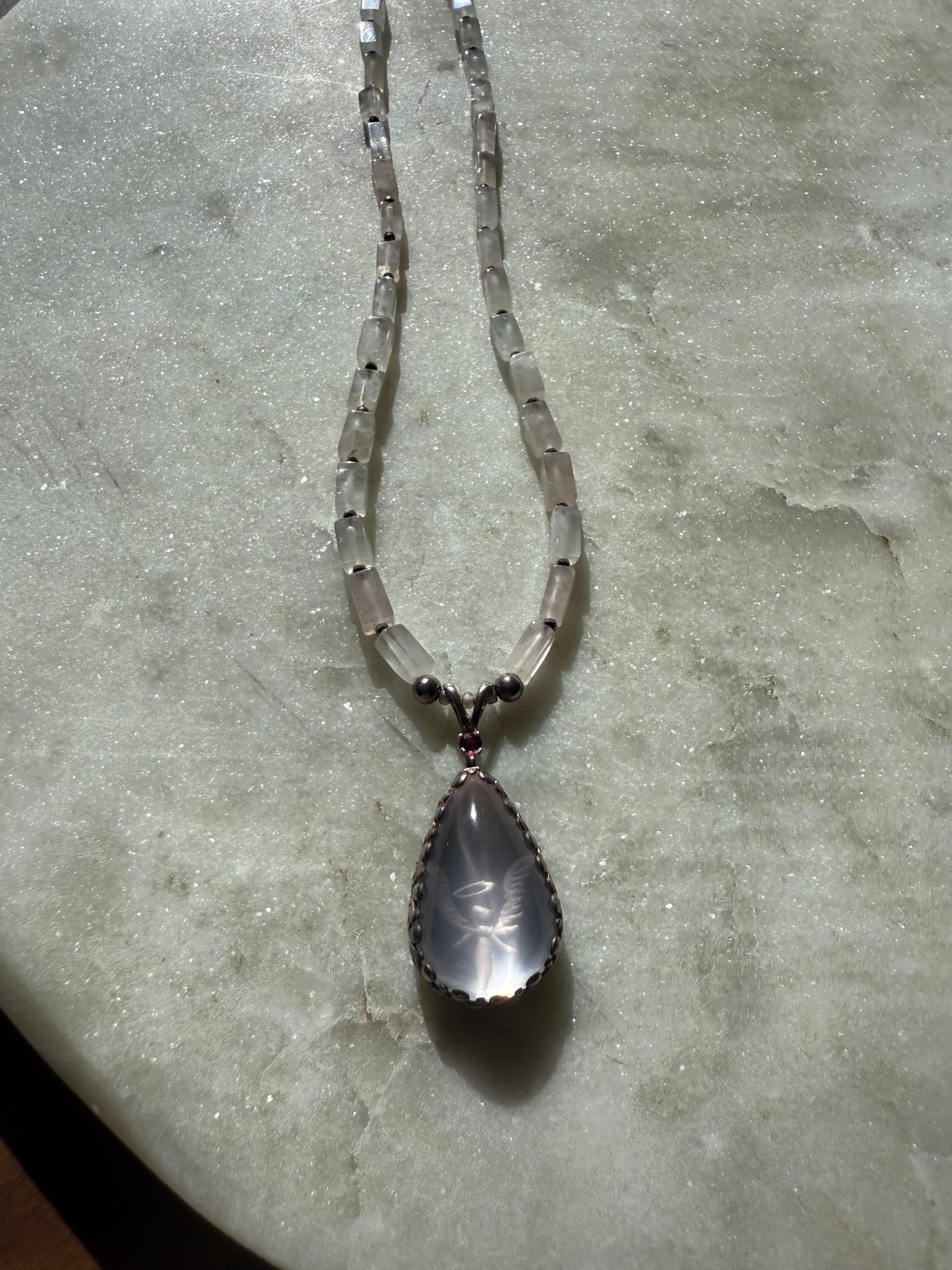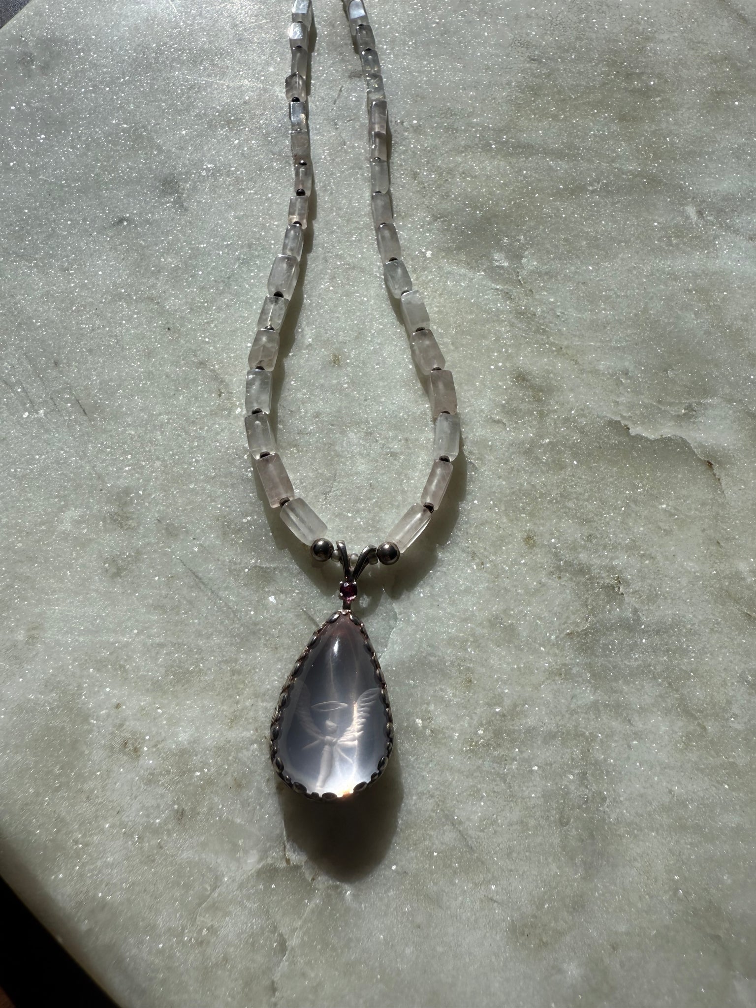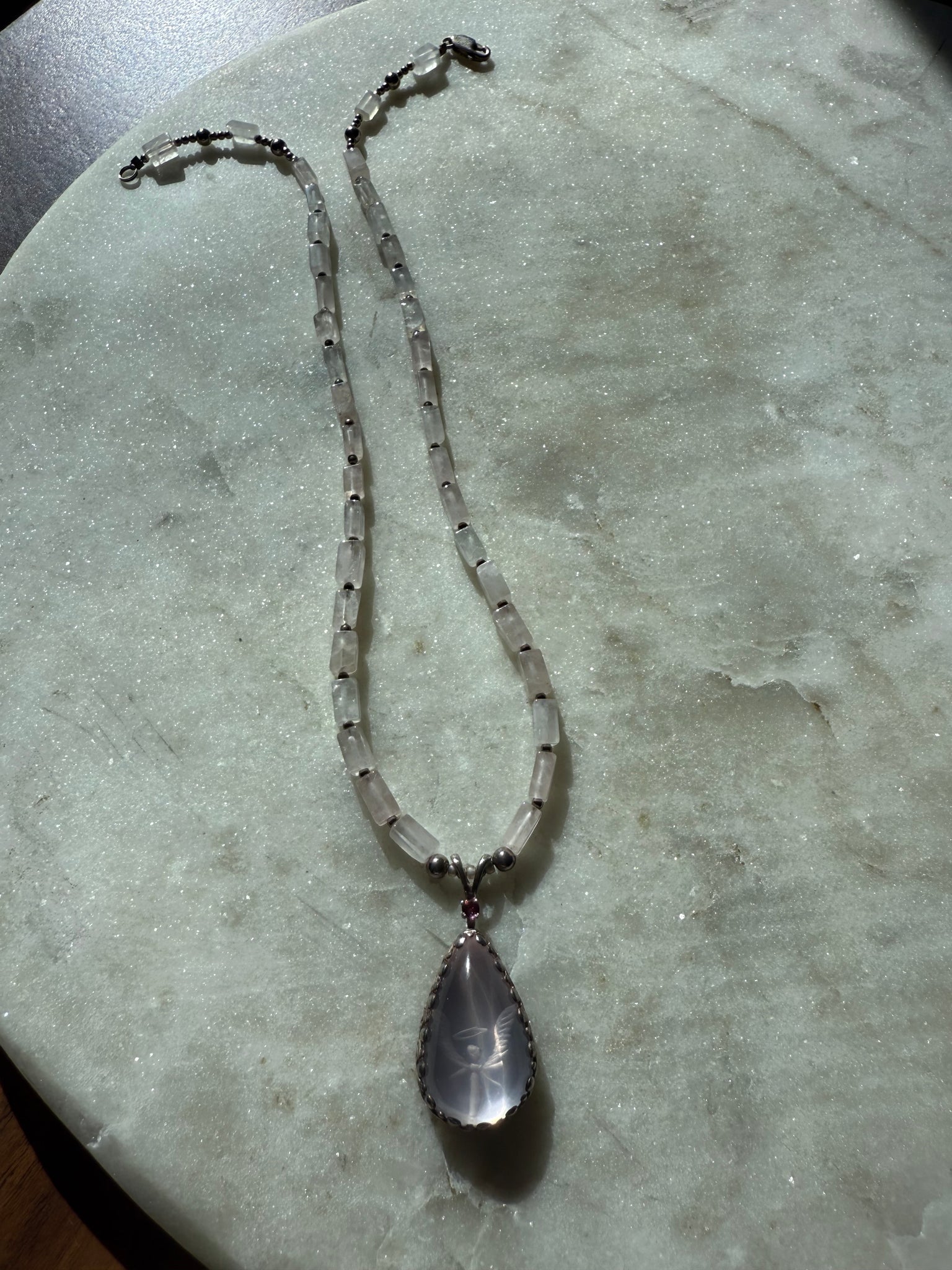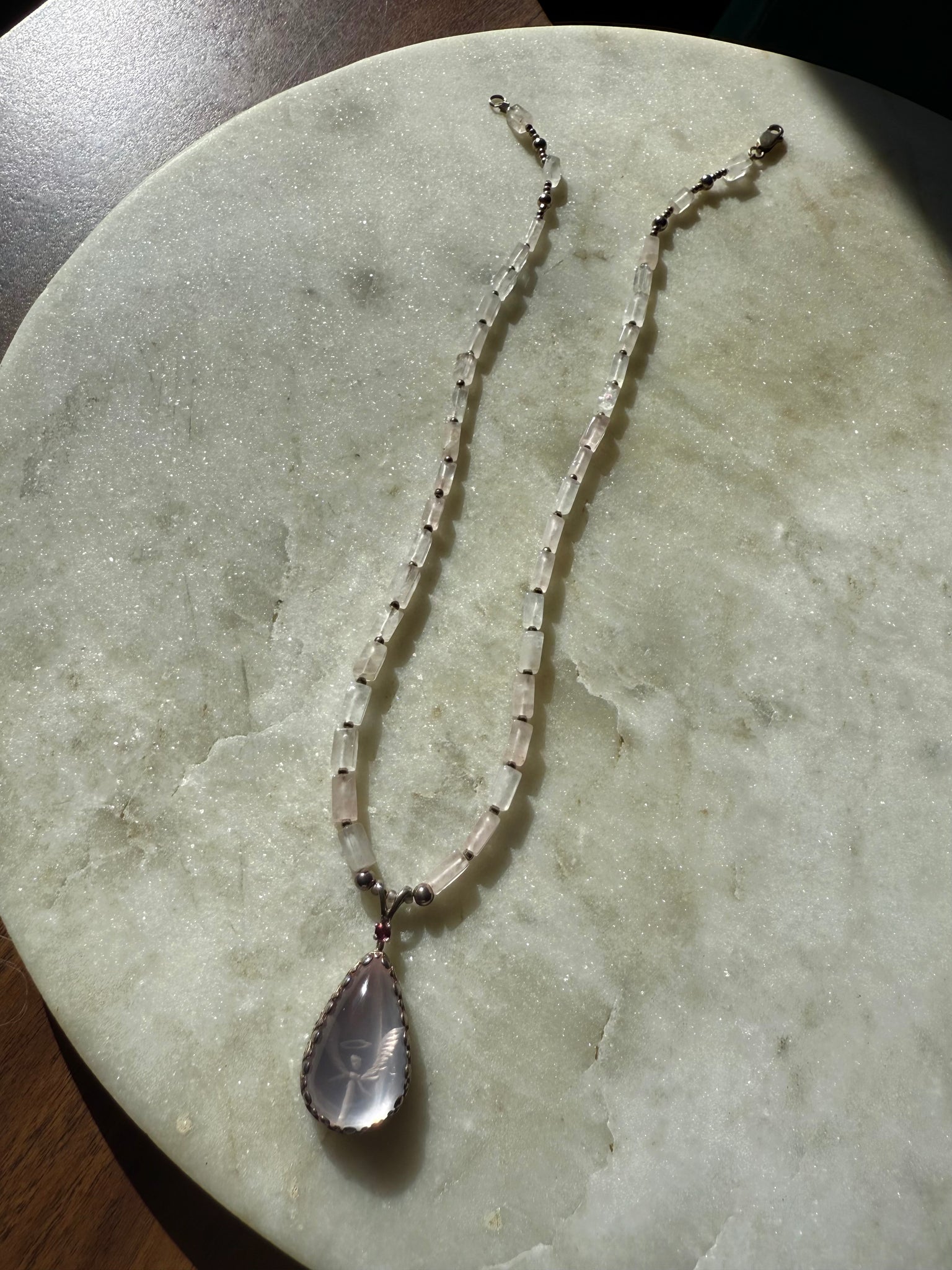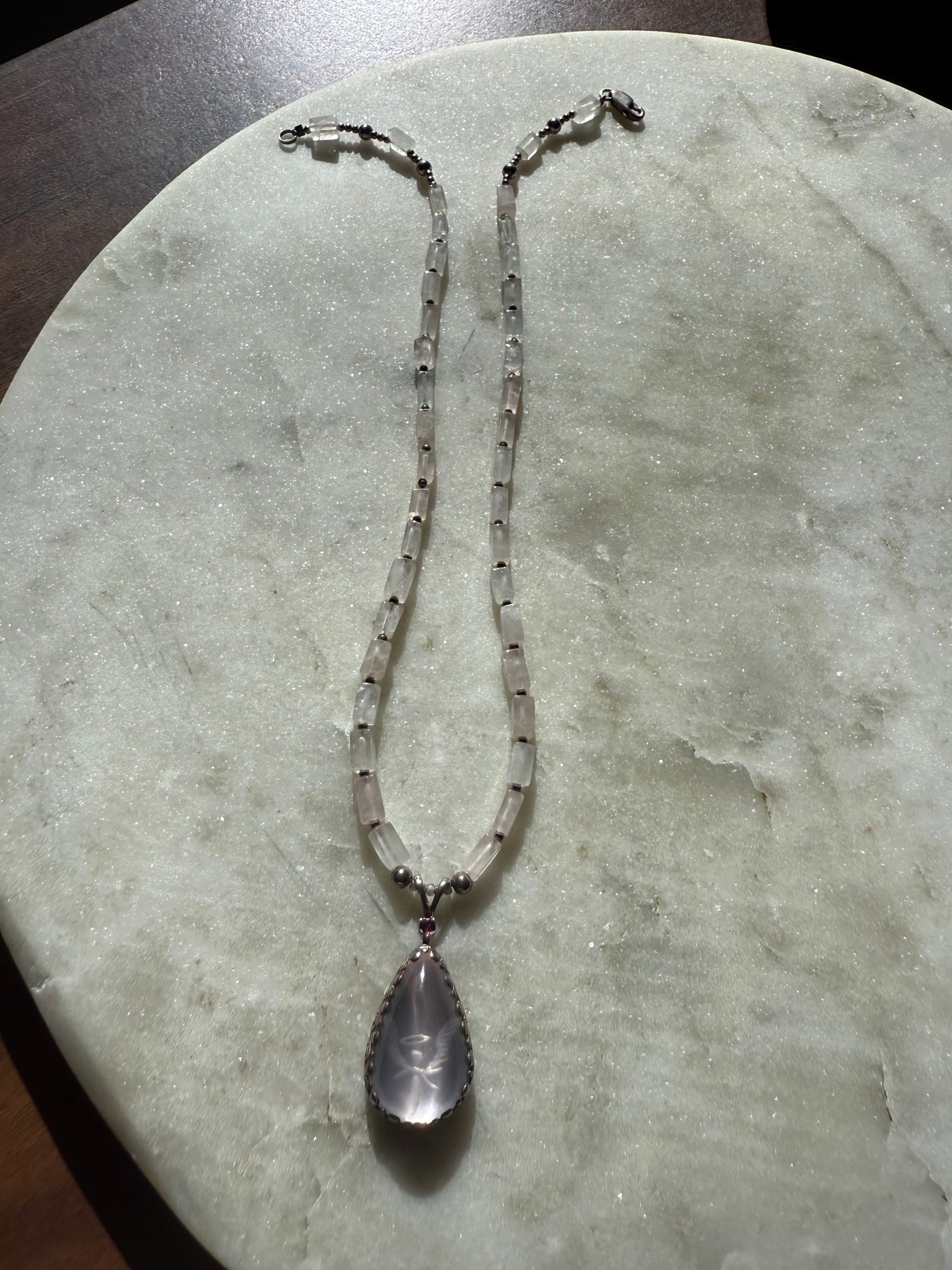 17.25” lying flat, best for 17” or shorter • .925 sterling silver and rose quartz • necklace measures 4.5mm width and the front pendant measures 1.4” length drop • 21.4 grams