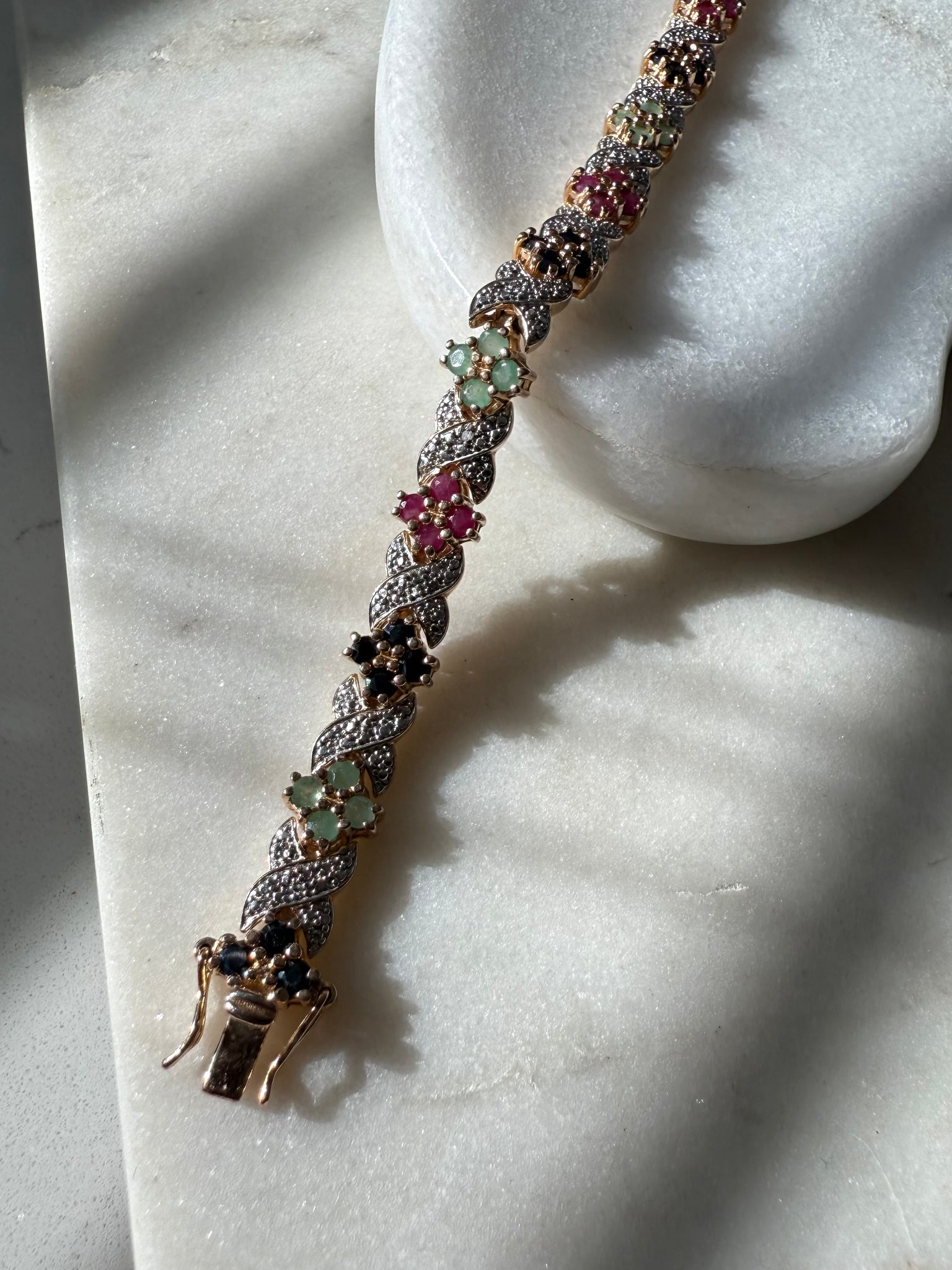 18.2 grams • stamped .925 • natural emeralds, sapphires and rubies • 8.70mm width links • 7.25” length with measuring tape