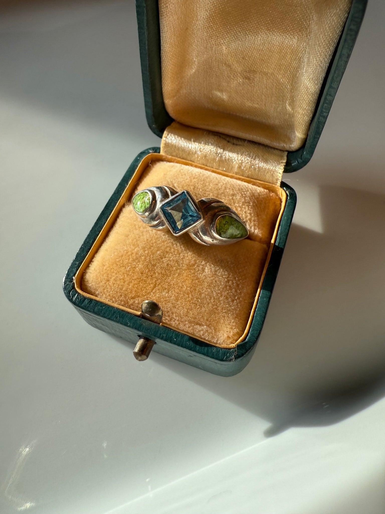 4.2 grams • .925 Sterling silver • size 7.5 • unsure of the green stone, it might be Gaspeite but I do not know