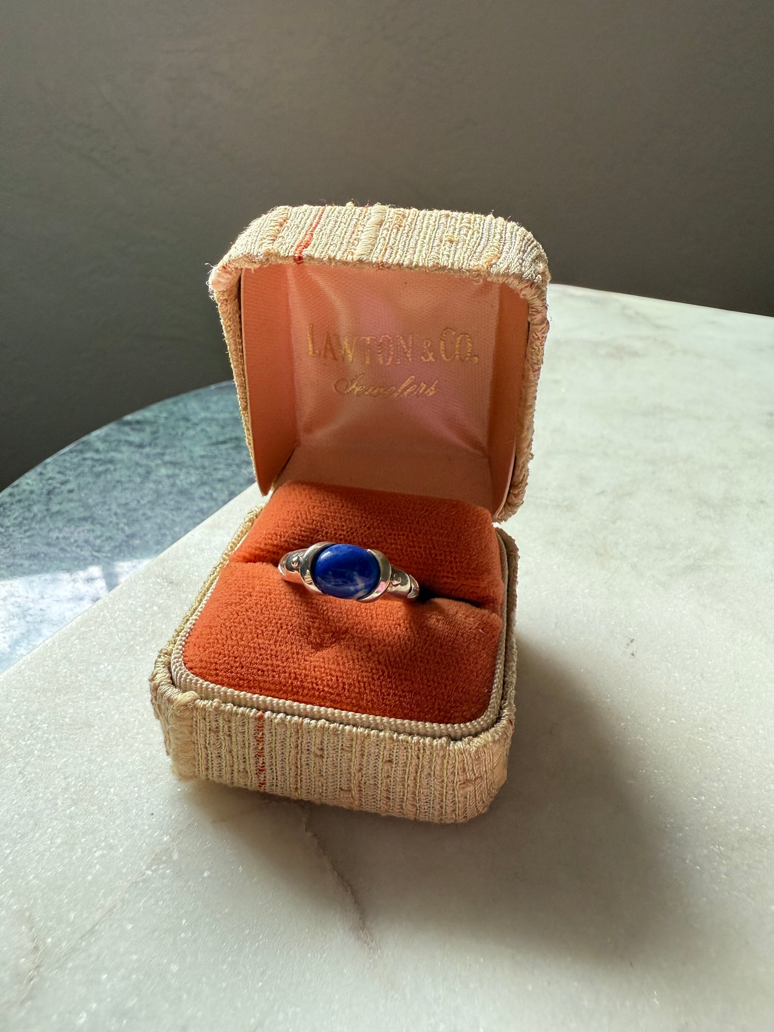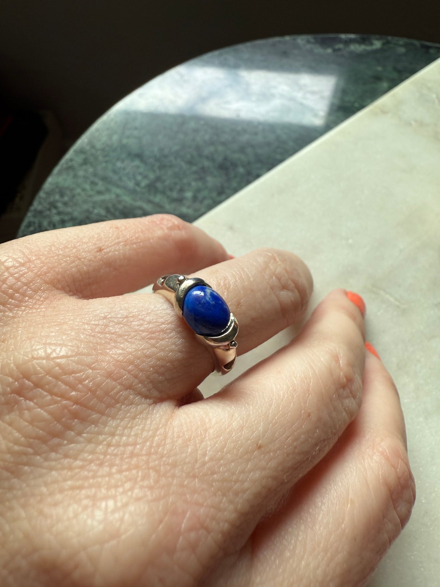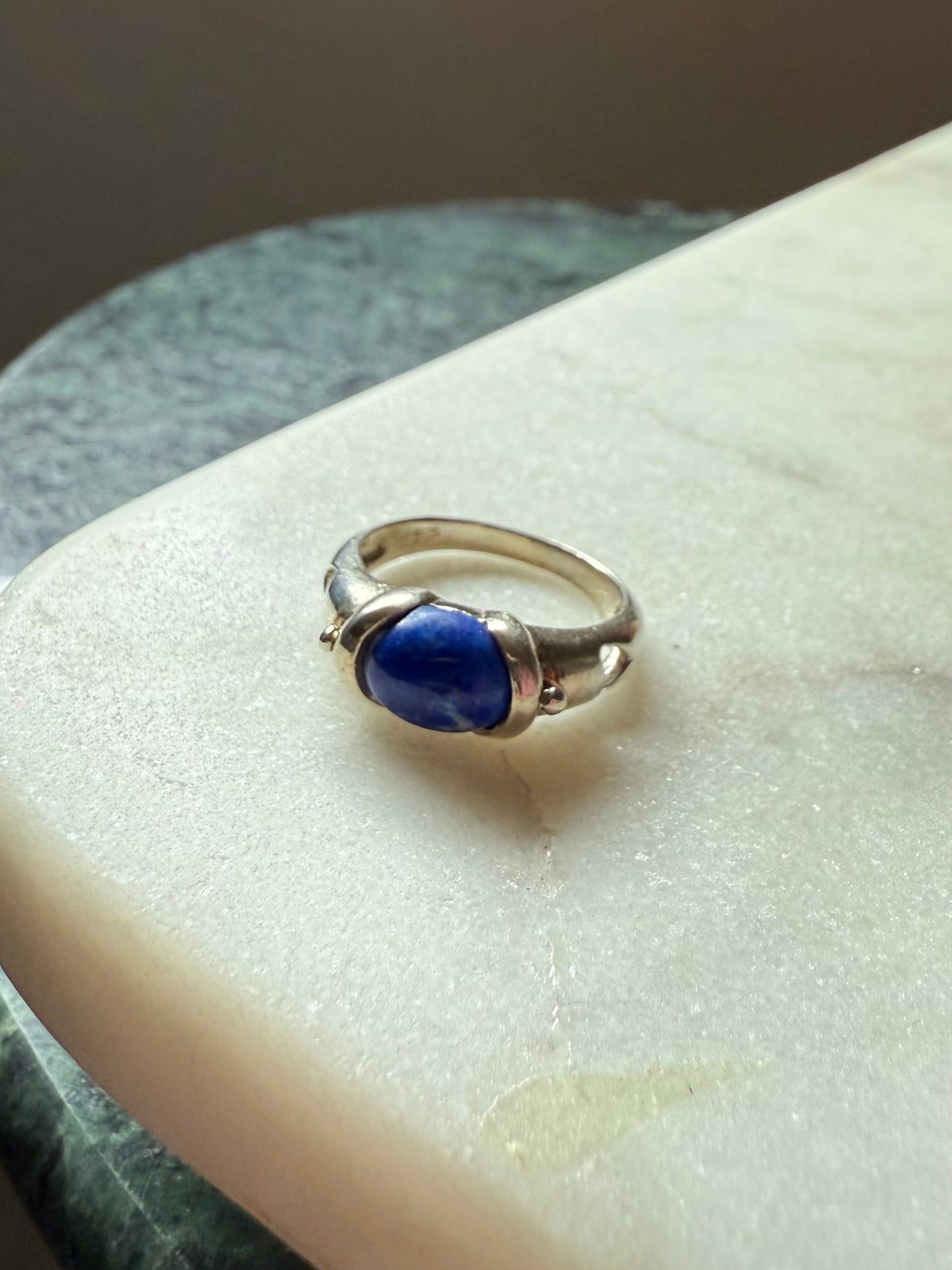 3.1 grams • sodalite stone set in .925 Sterling with two hearts carved on the sides • ring size 6.25