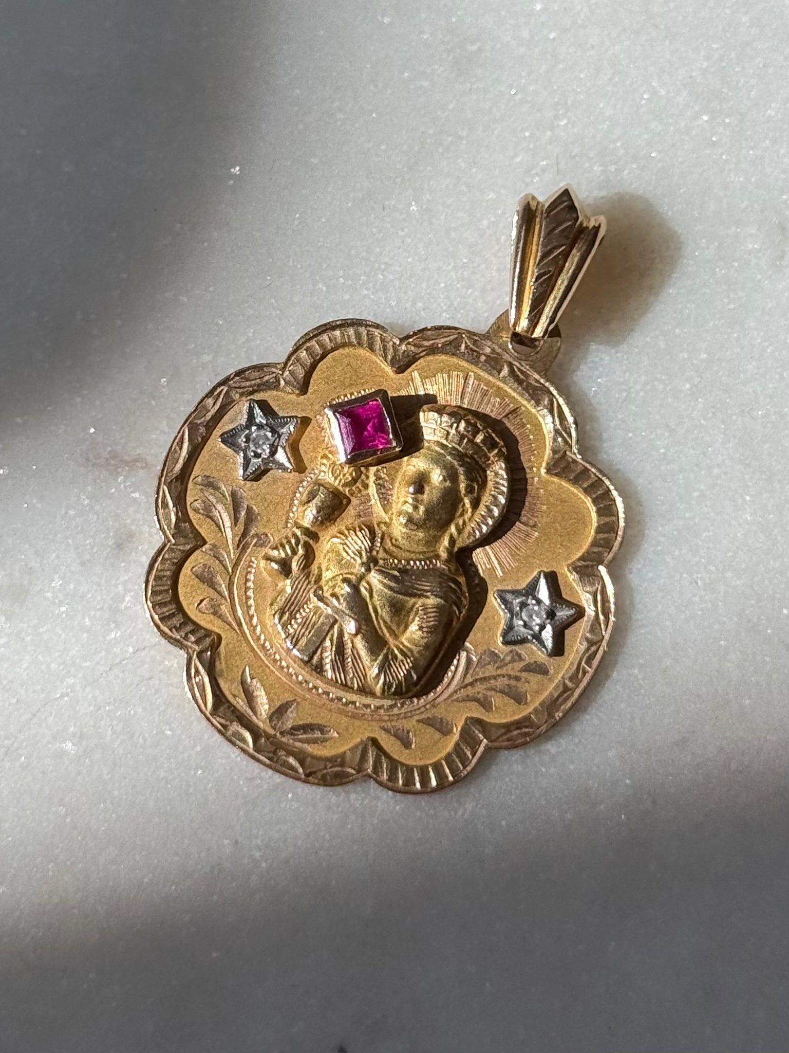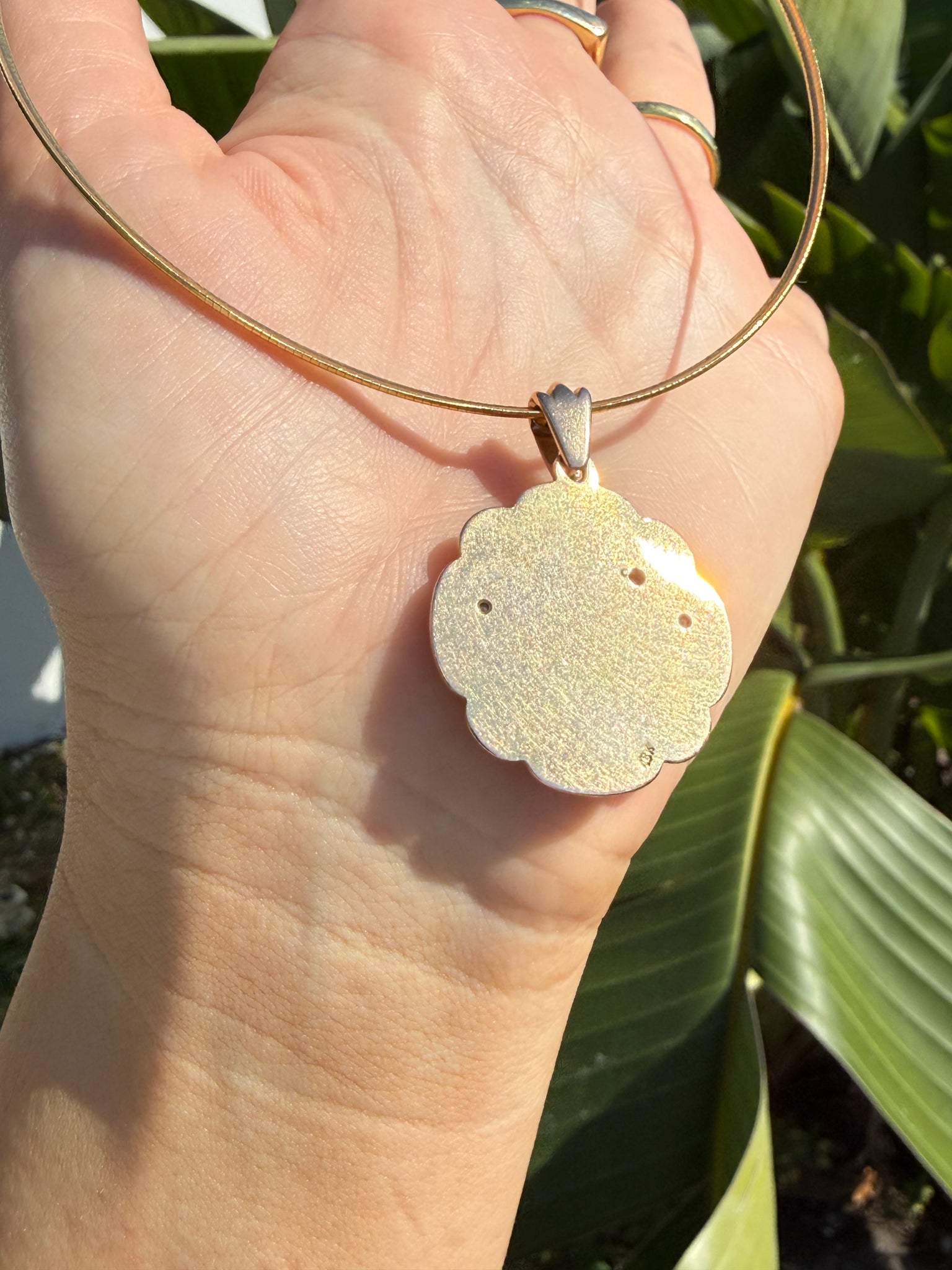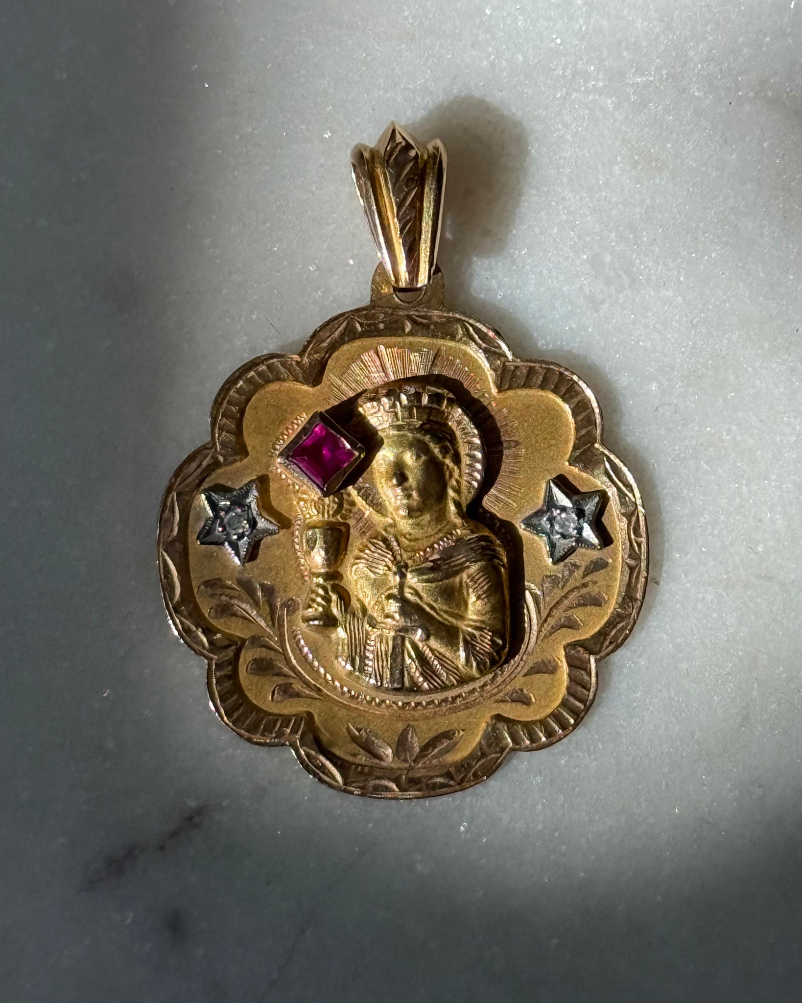 Sacred armor in solid 18k Gold pendant form. Featuring diamonds and a ruby lit flame.
