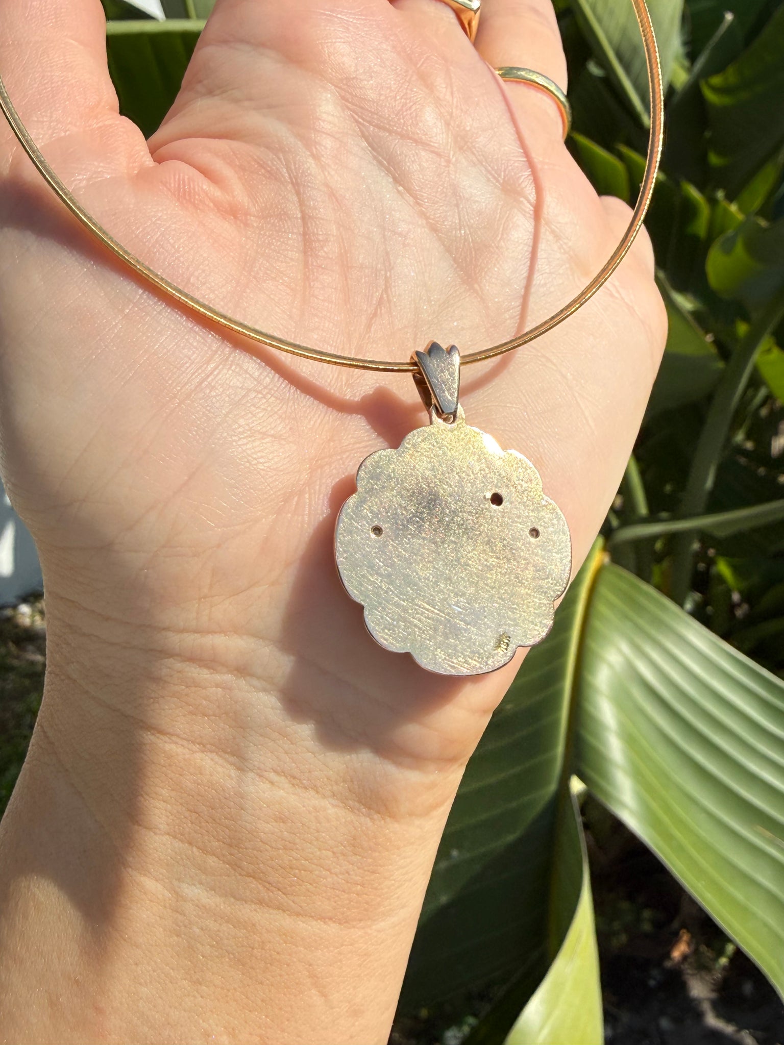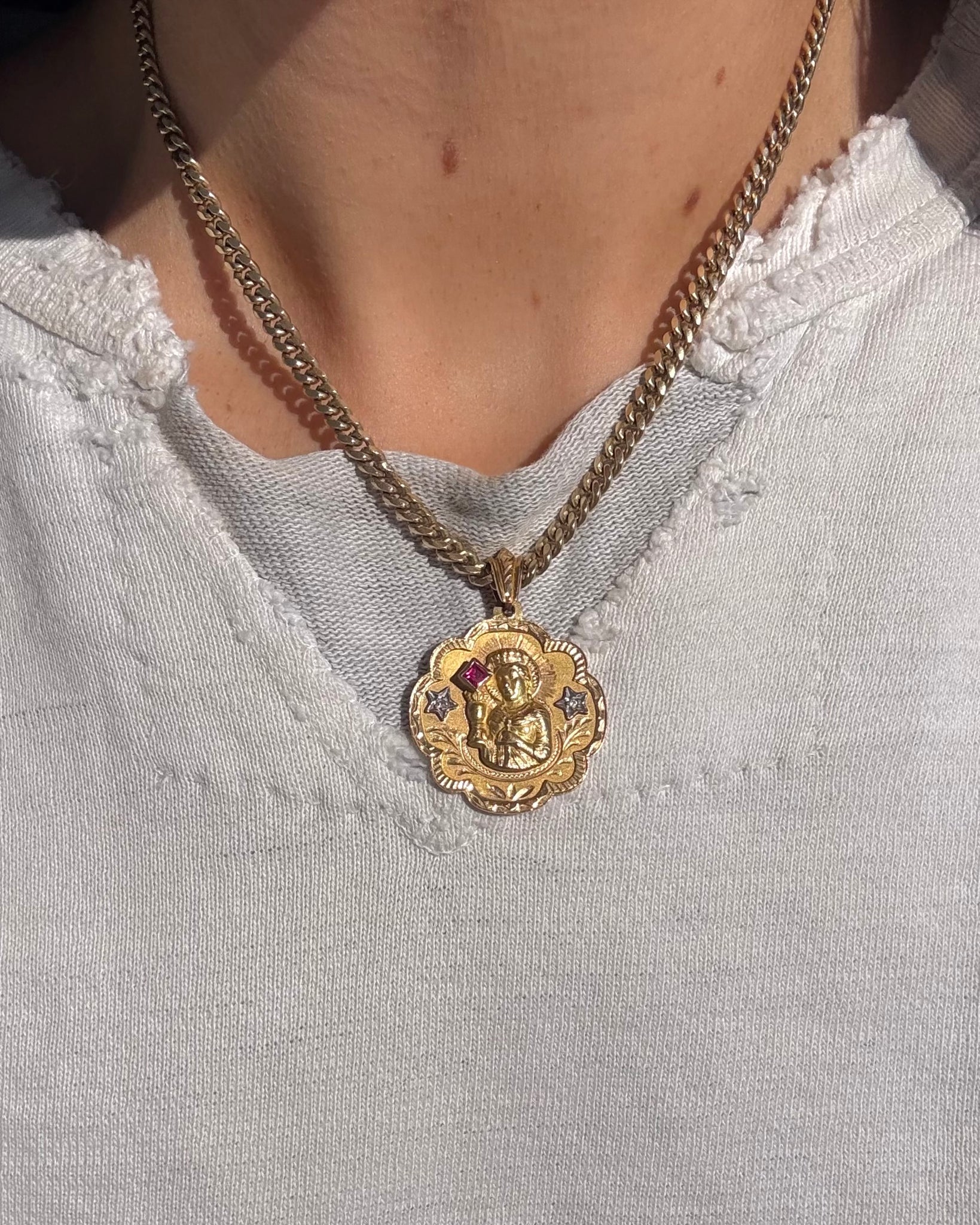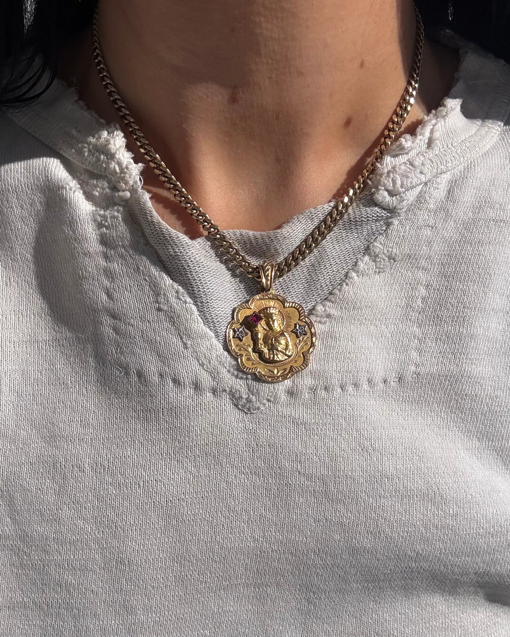 Sacred armor in solid 18k Gold pendant form. Featuring diamonds and a ruby lit flame.
