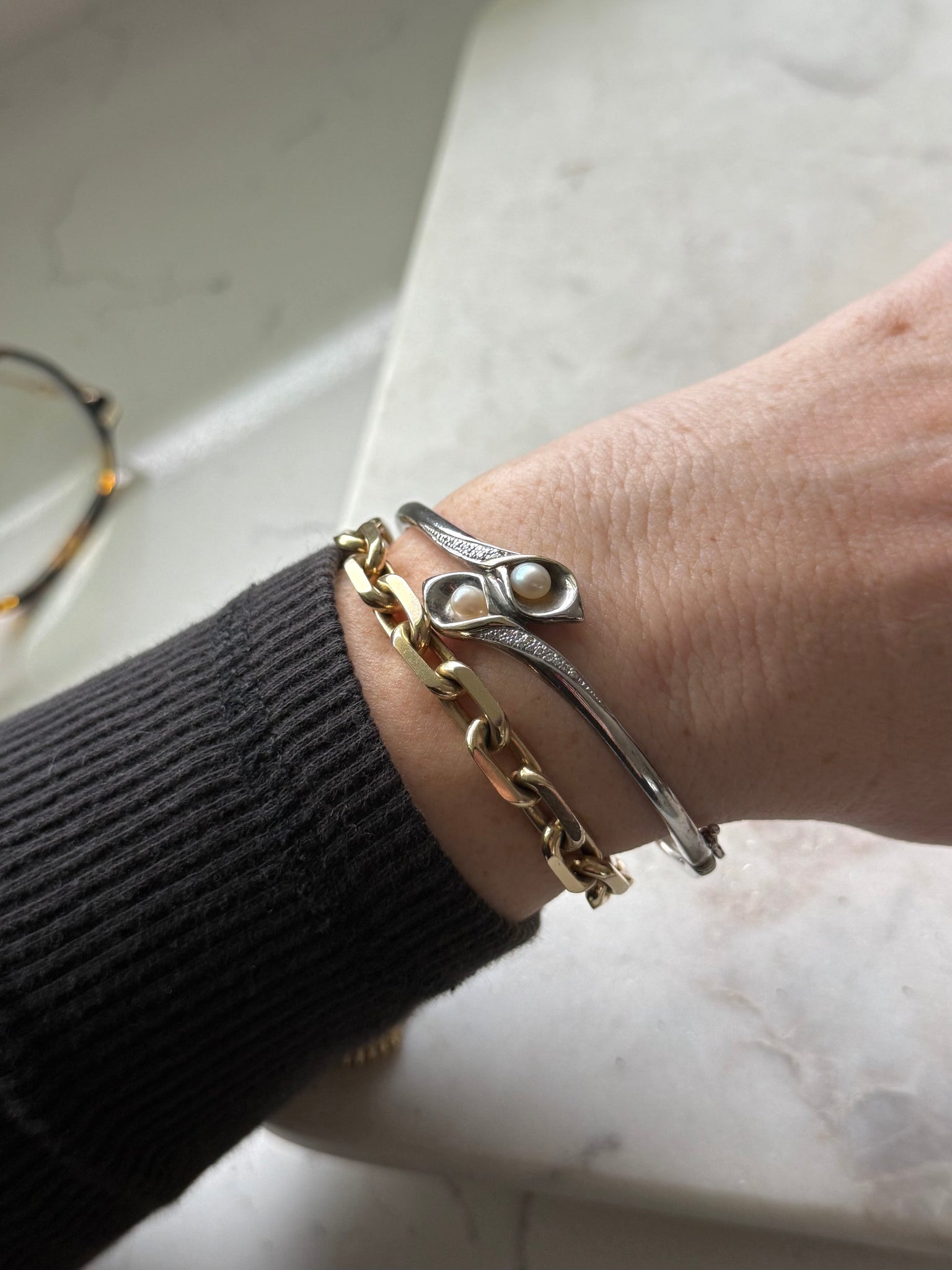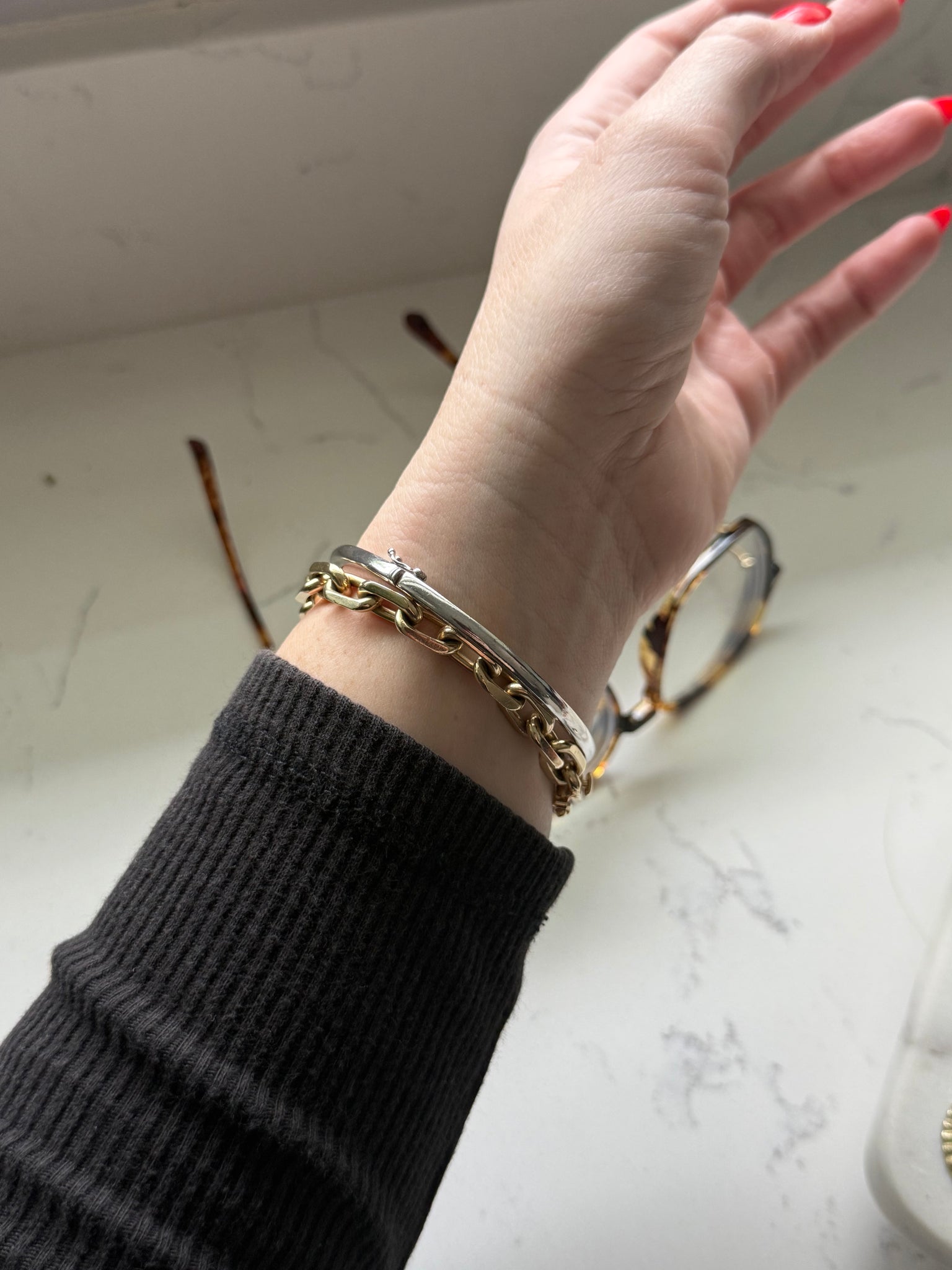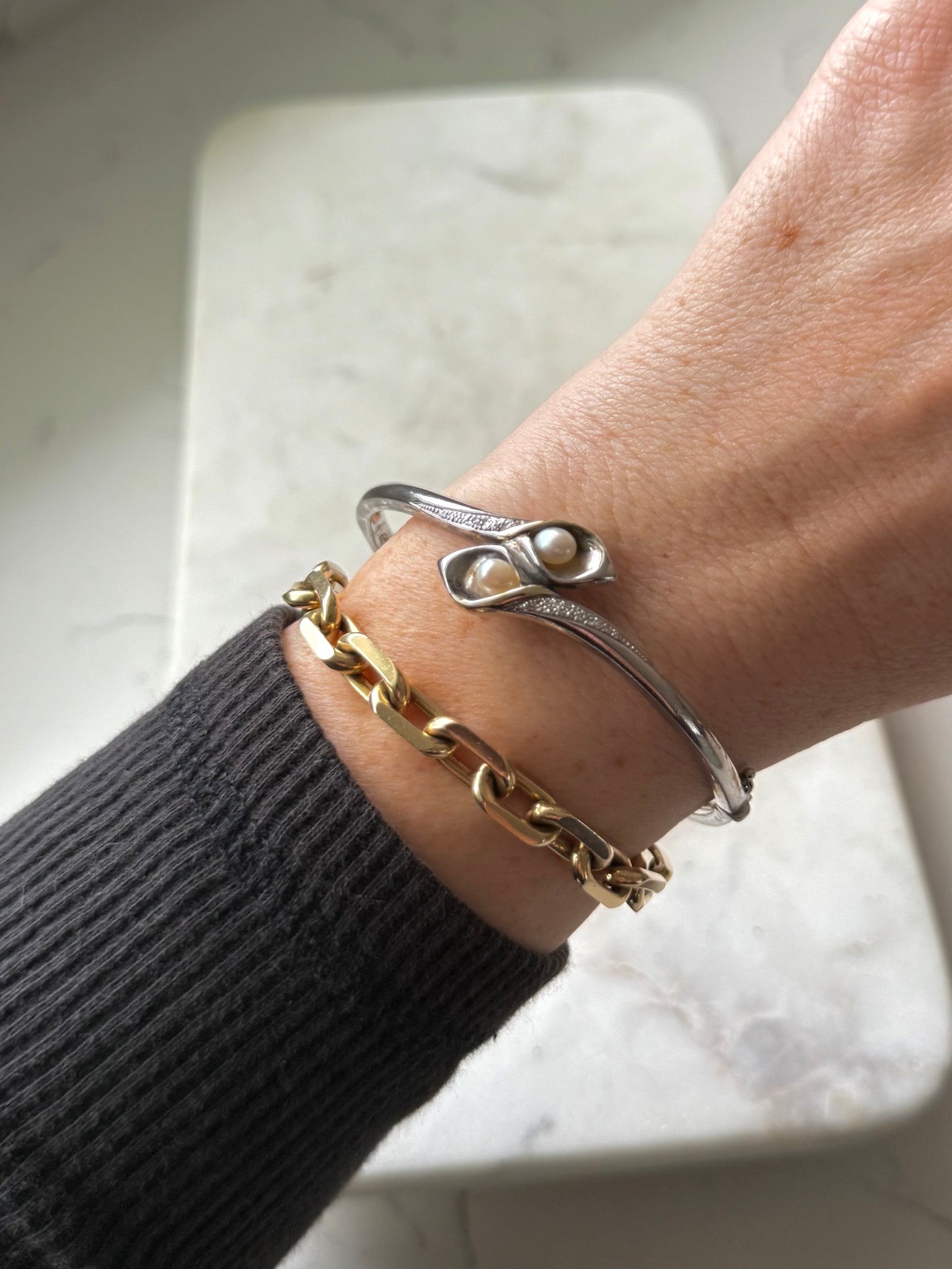 Stamped .925 and 14k gold • total weight is 19.3 grams • 2.38” inner diameter • fits around size 7.5” wrist best but check inner diameter to be sure