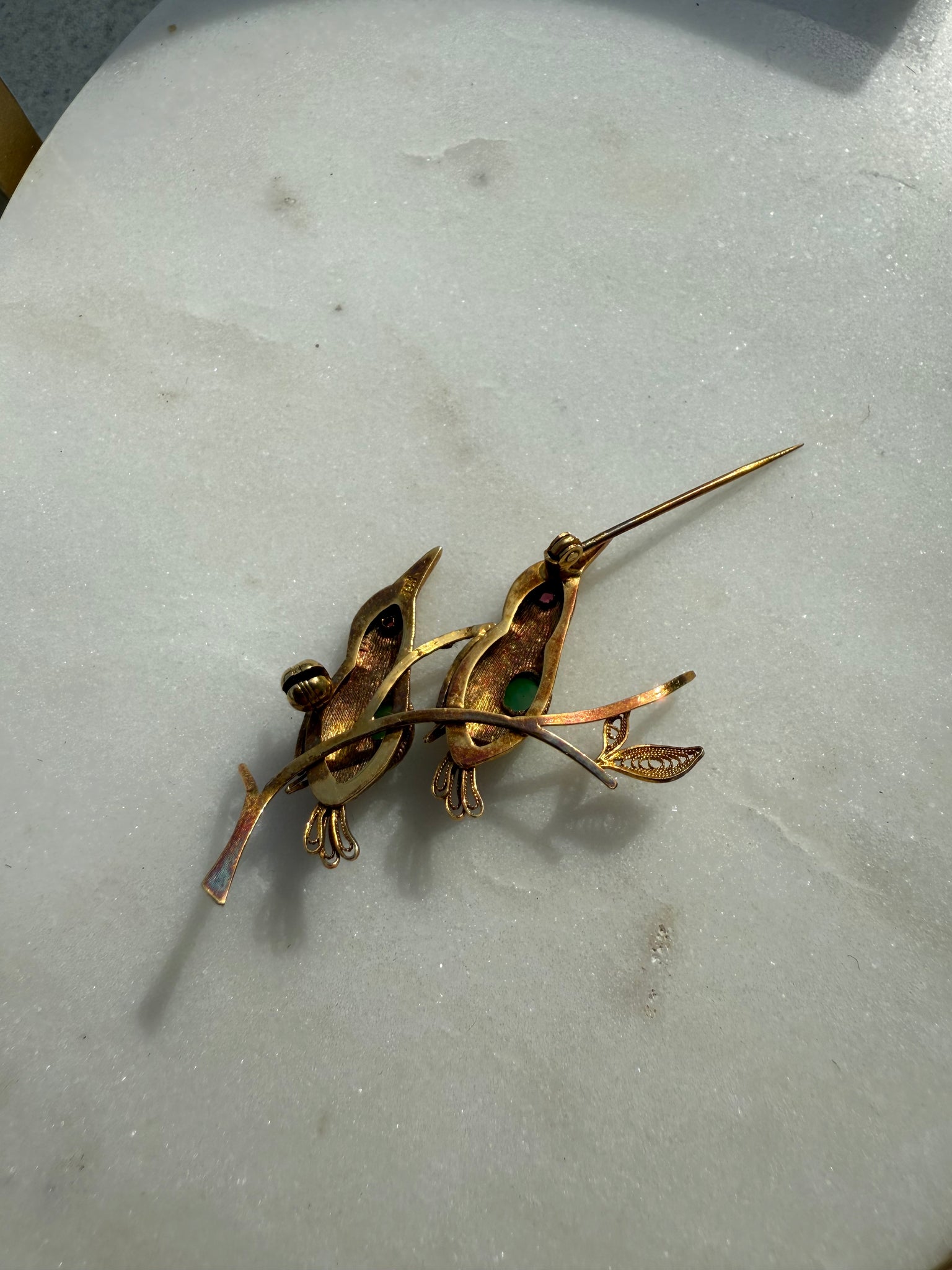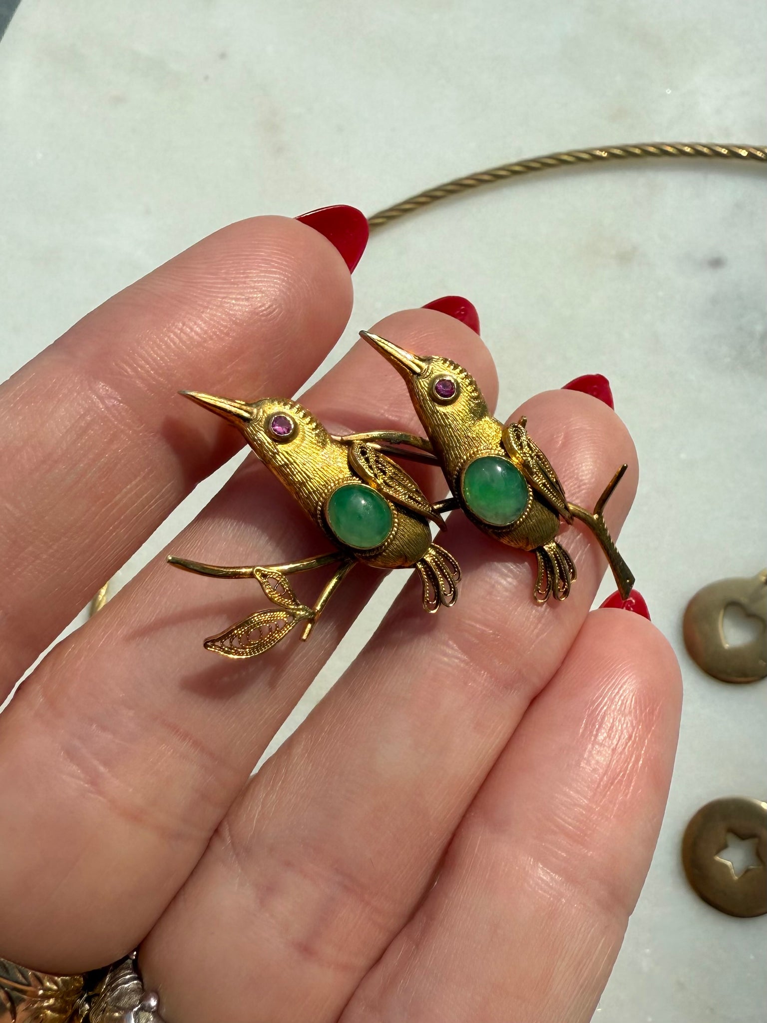 Vintage 14k Gold Lover Birds Brooch • pink sapphire eyes and jade •3.7 grams•1.5” x .80”