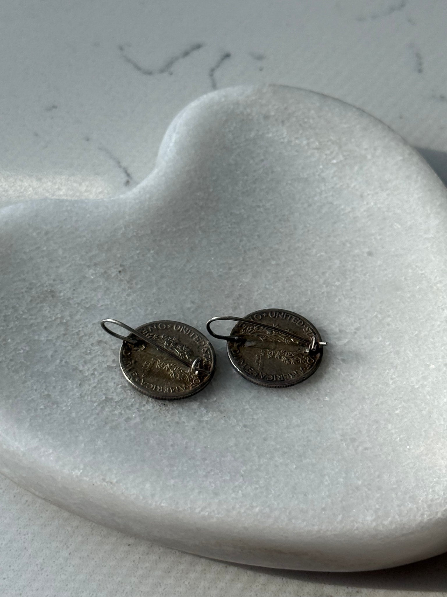 Vintage from 1942 when coins were 90% Sterling and 10% copper • posts are .925 Sterling • total weight is 5.2 grams • each earring measures .75”