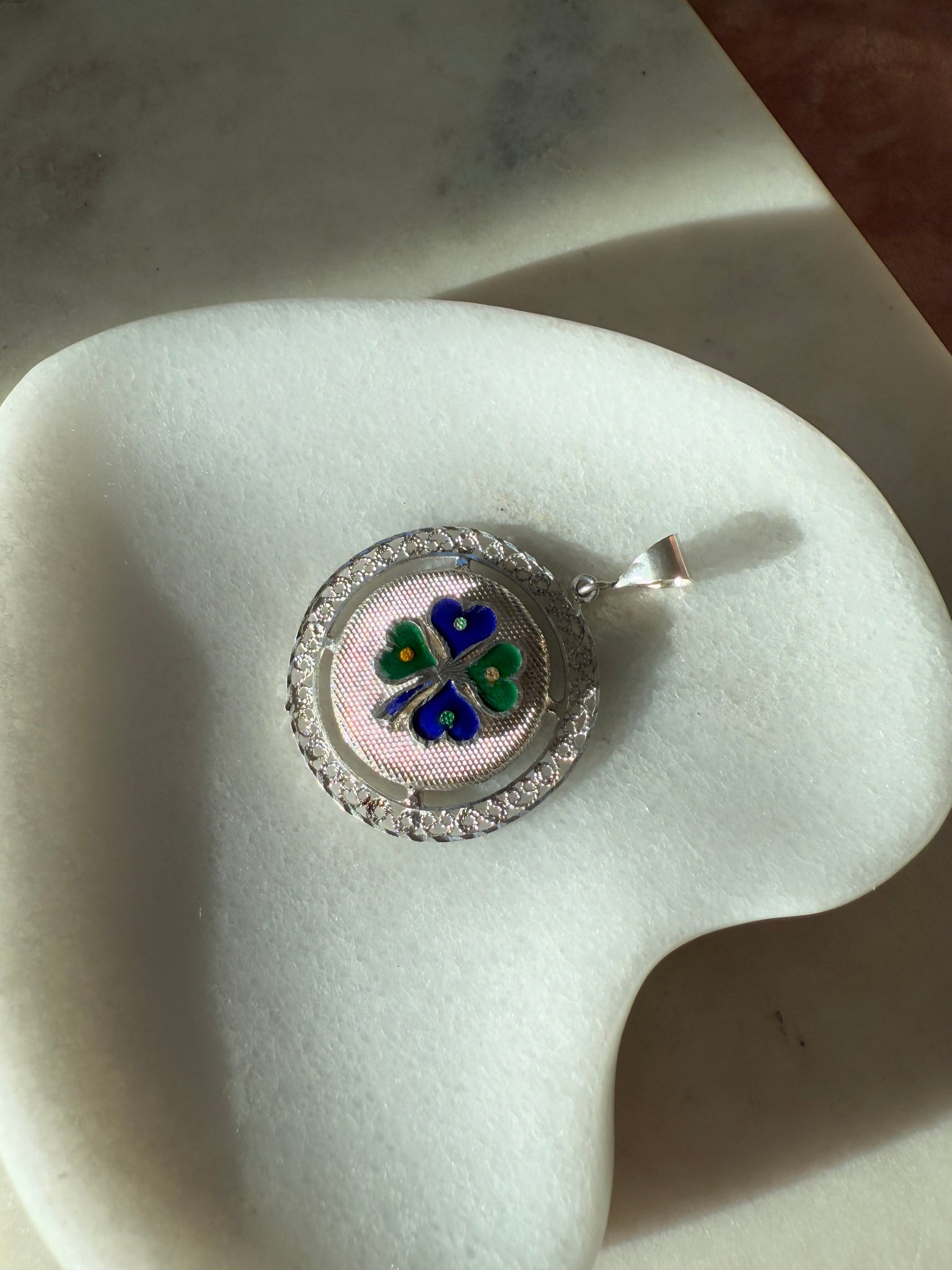 Vintage Enamel Four Leaf Clover Sterling Silver Pendant