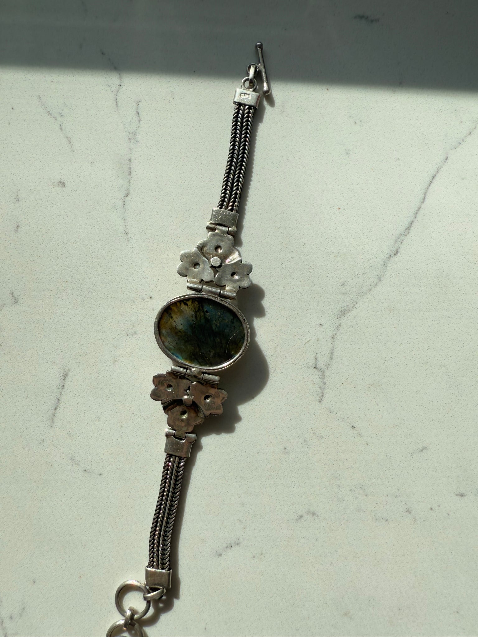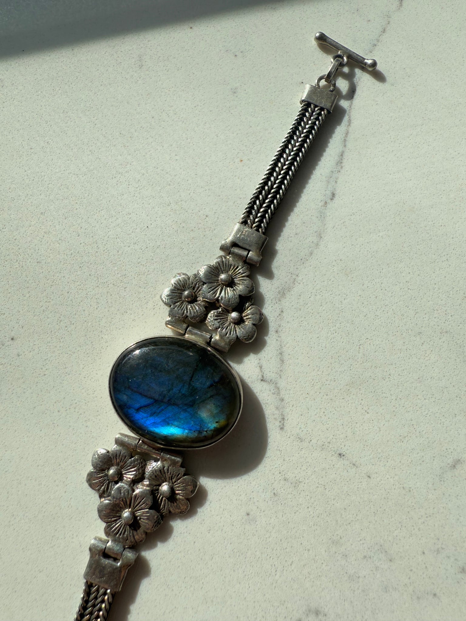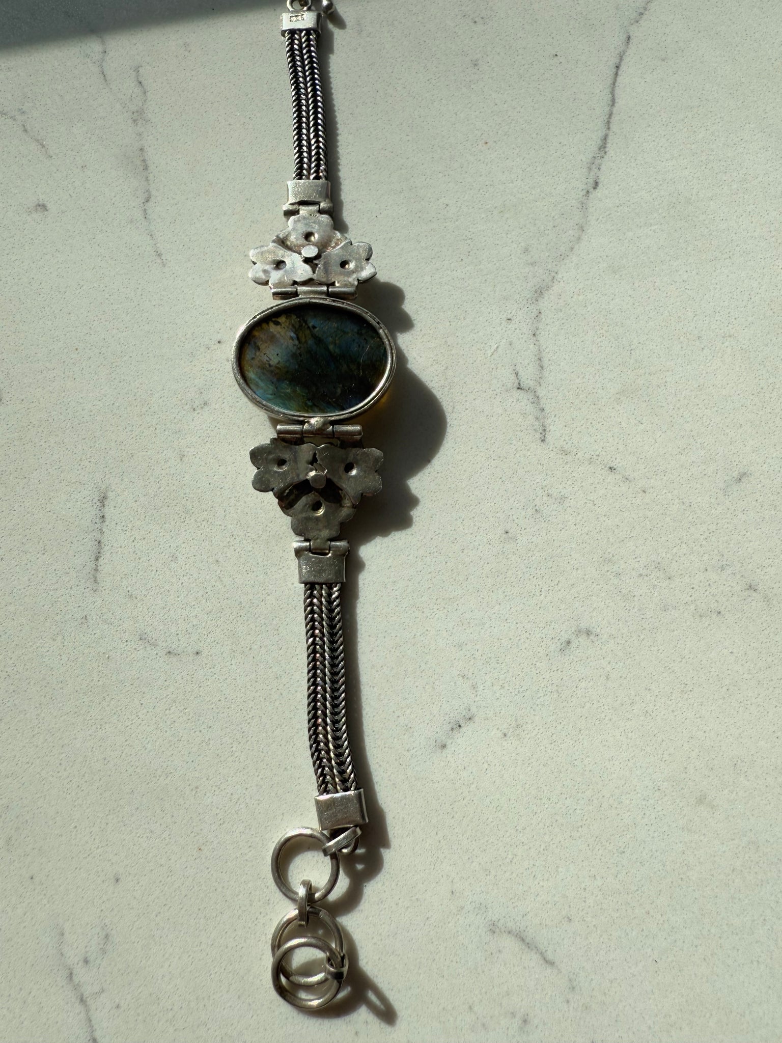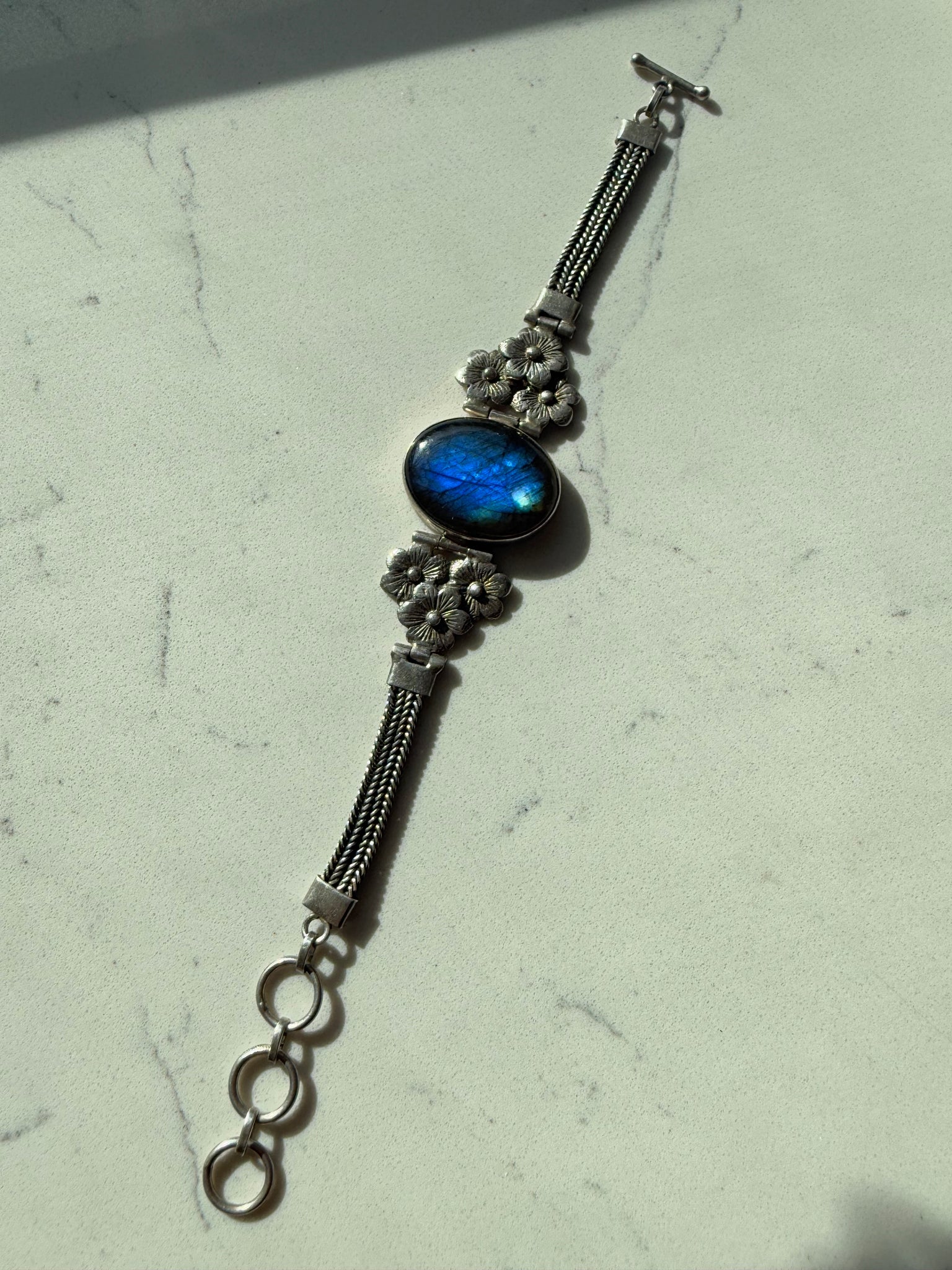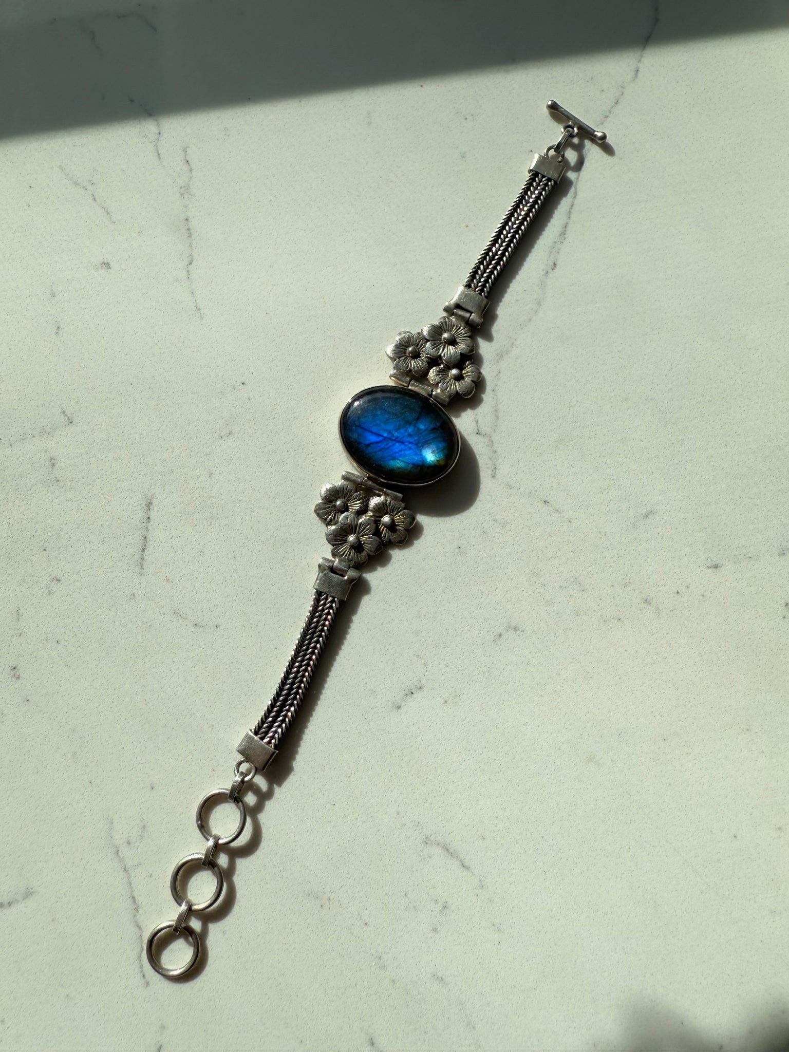 24.7 grams • 1” labradorite stone area • 21mm flower area • measures 6.75”-7.75” when lying flat with measuring tape