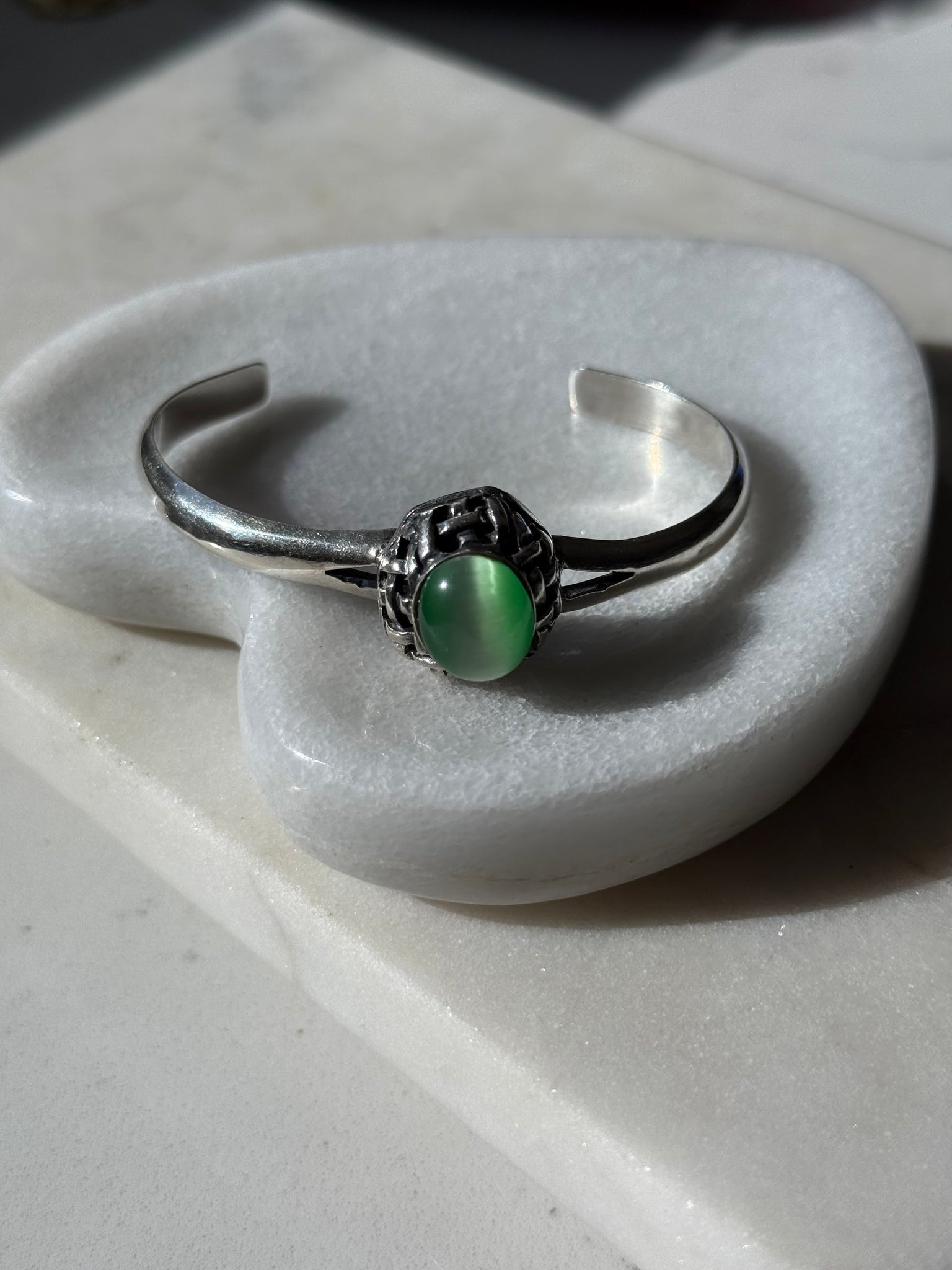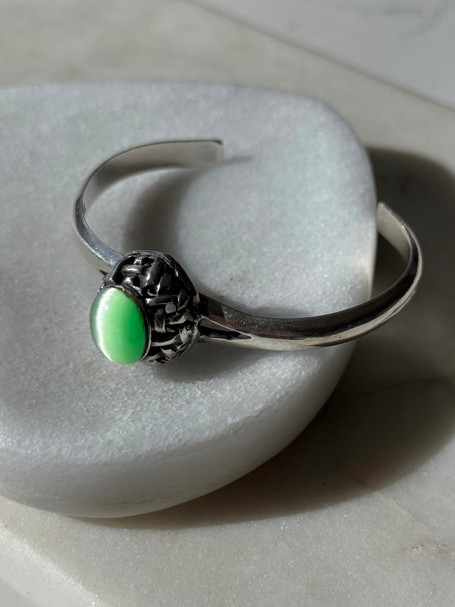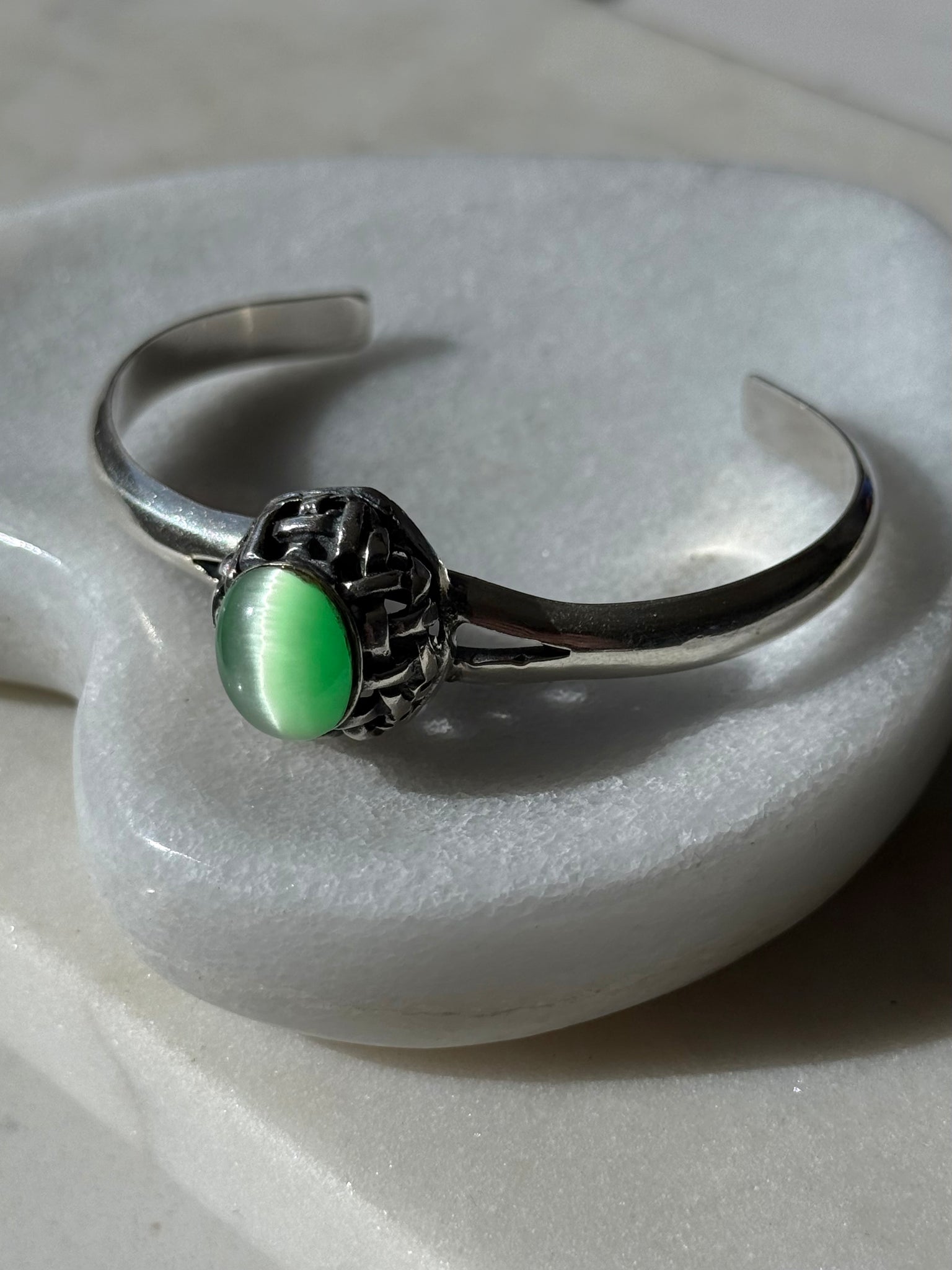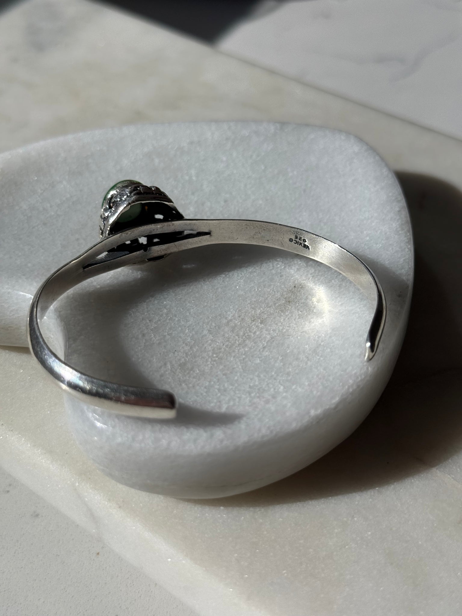 Solid .925 Sterling silver • 20.6 grams • fits around wrist 7.5” best but can be tightened a little • 2.5” inner diameter