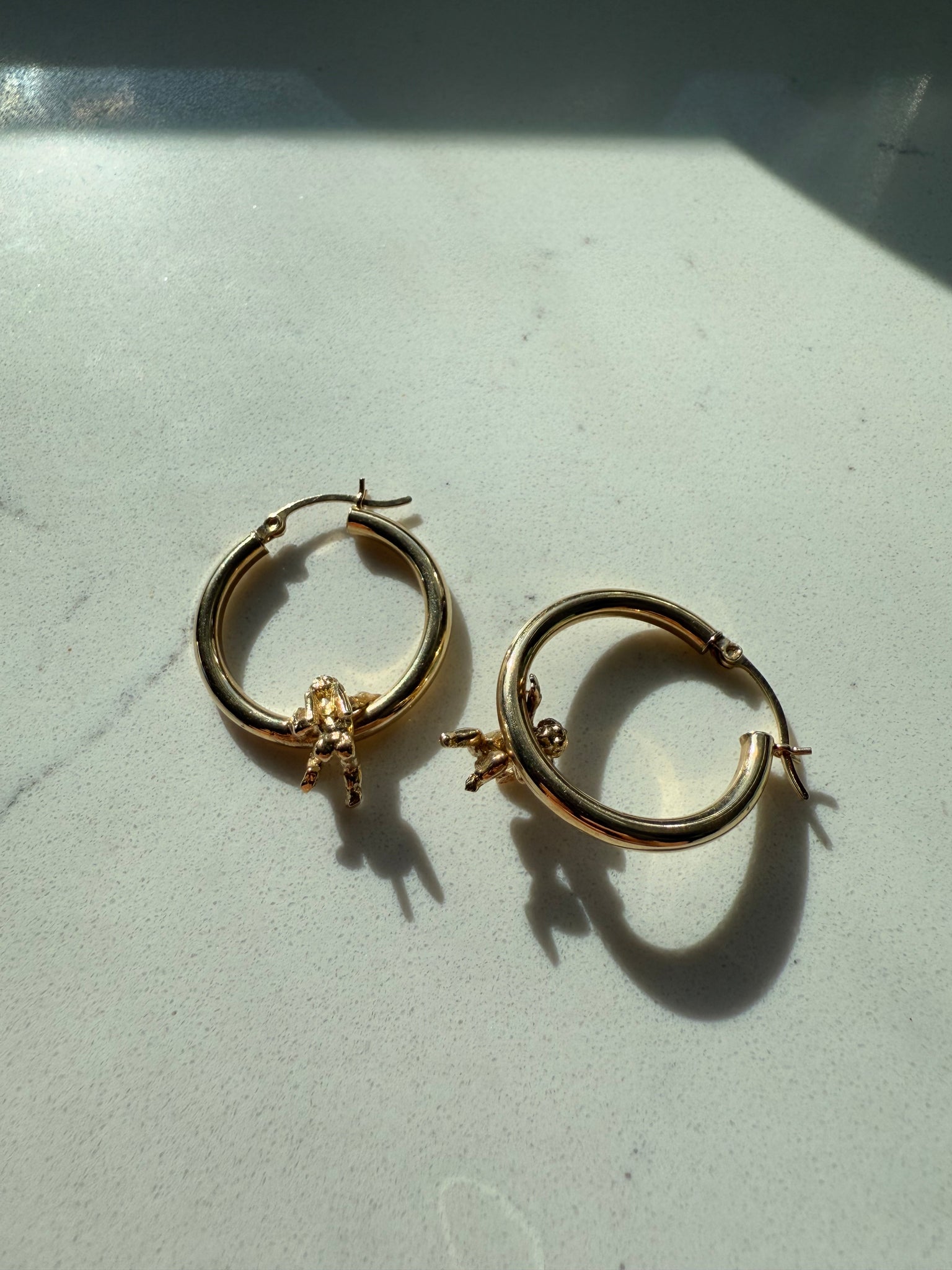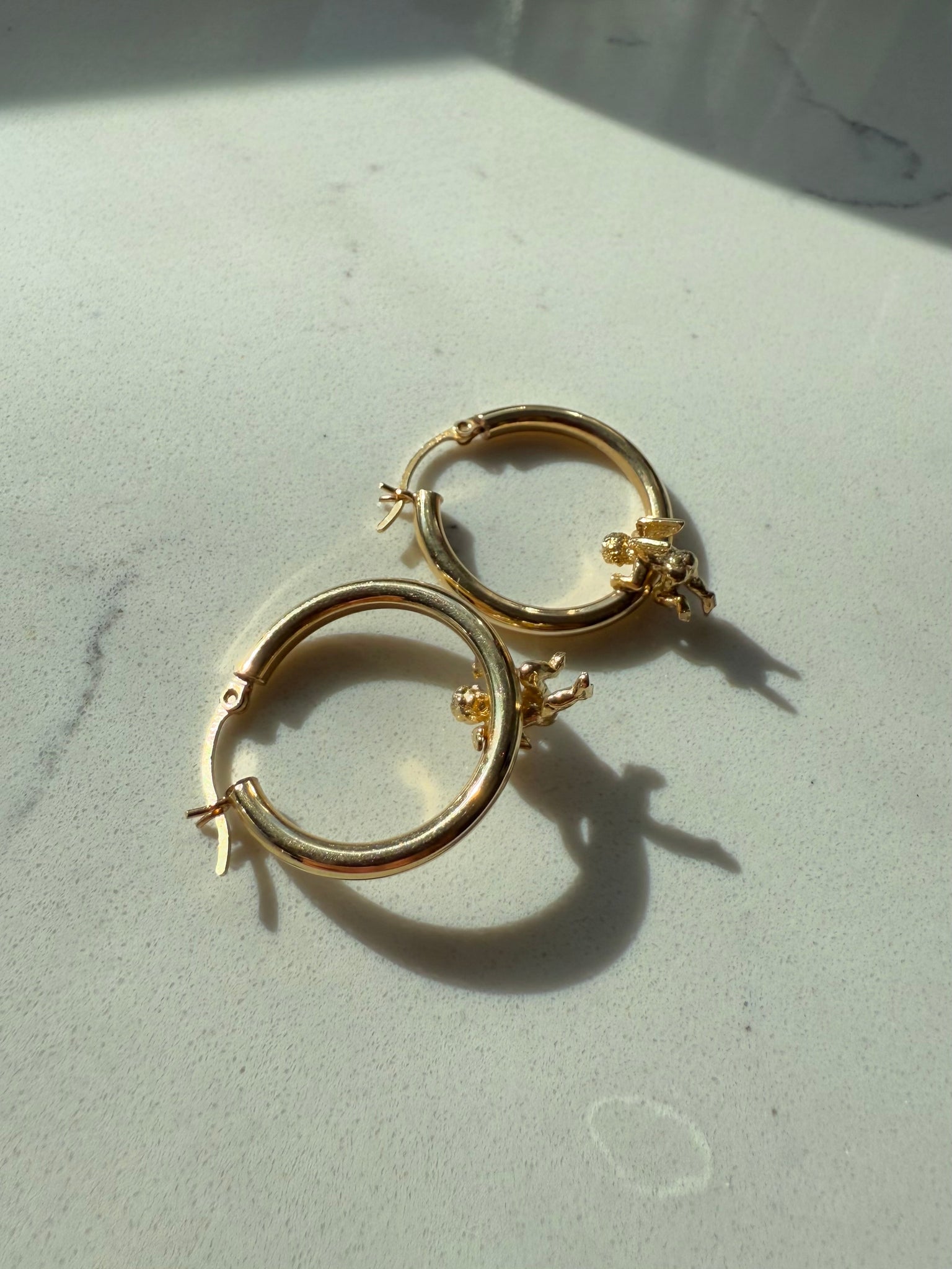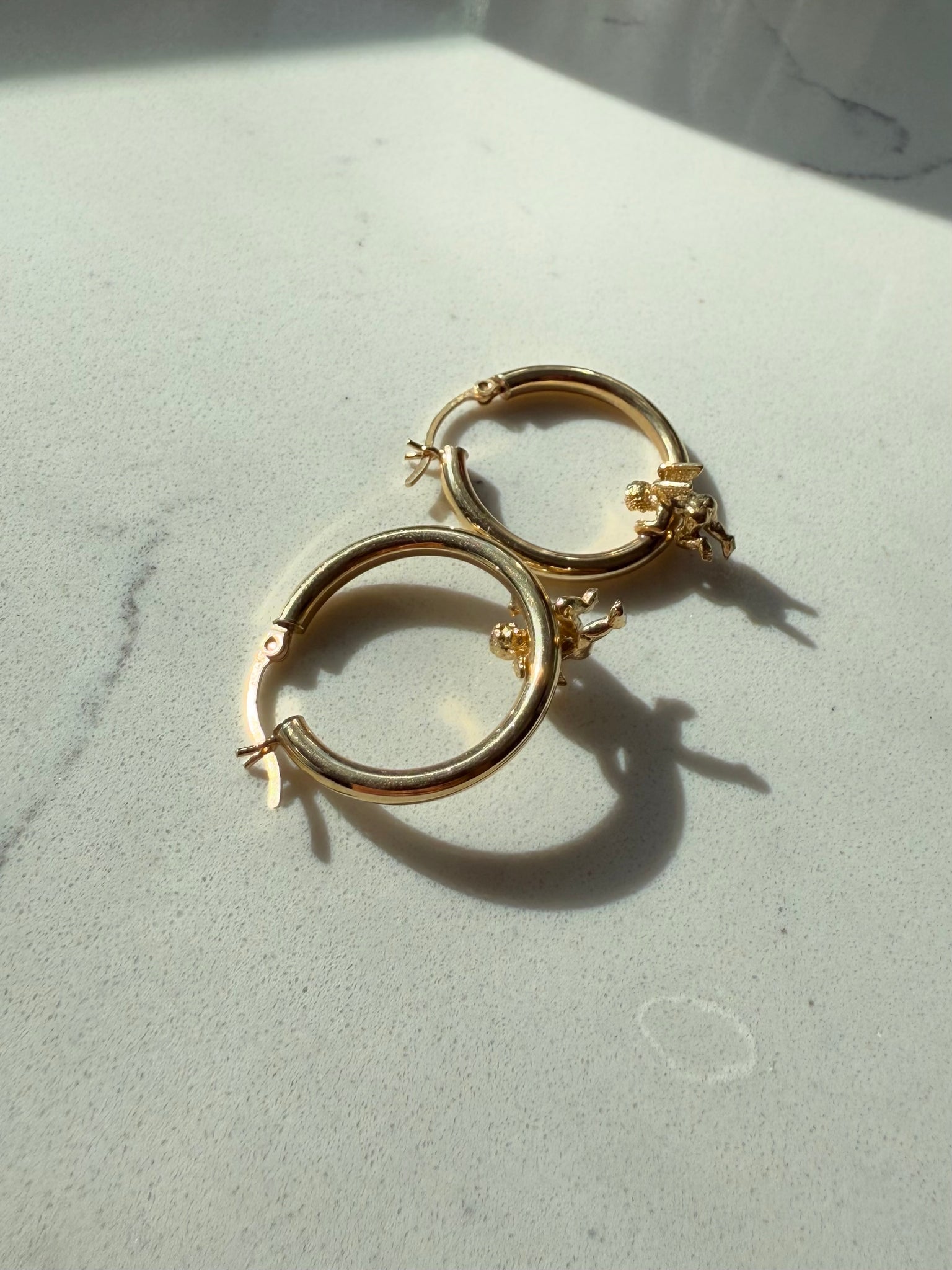 Larger Hanging Cherub 14k Yellow Gold Hoops•4.5 grams •1” x .92” x 3mmAmazing condition
