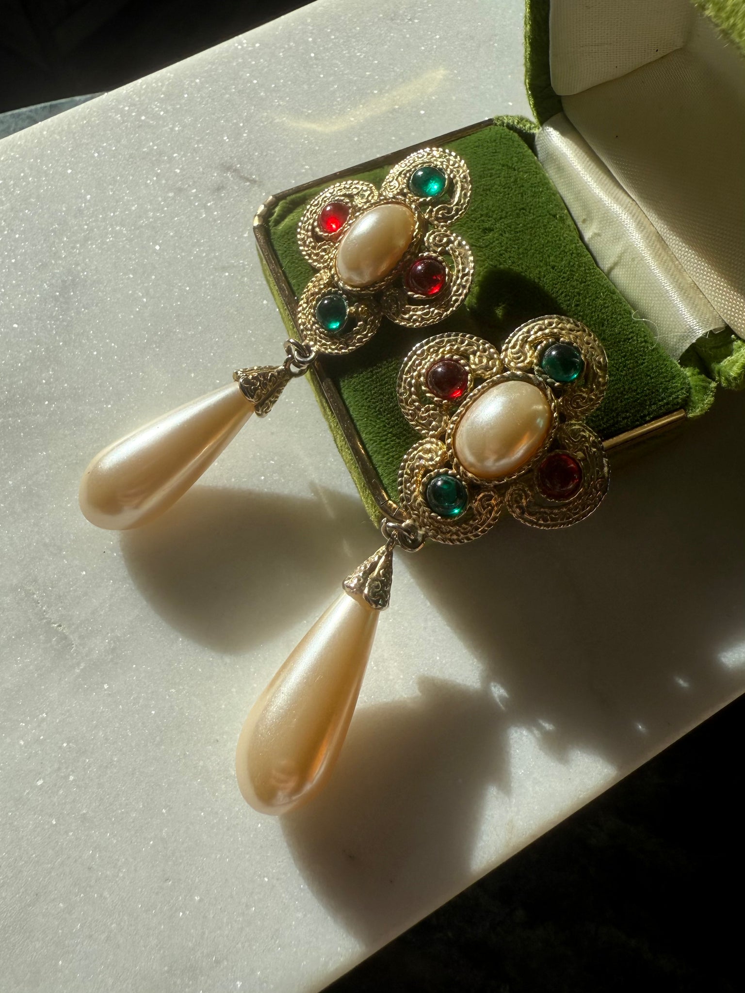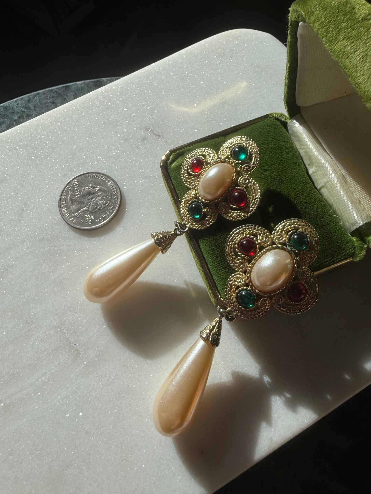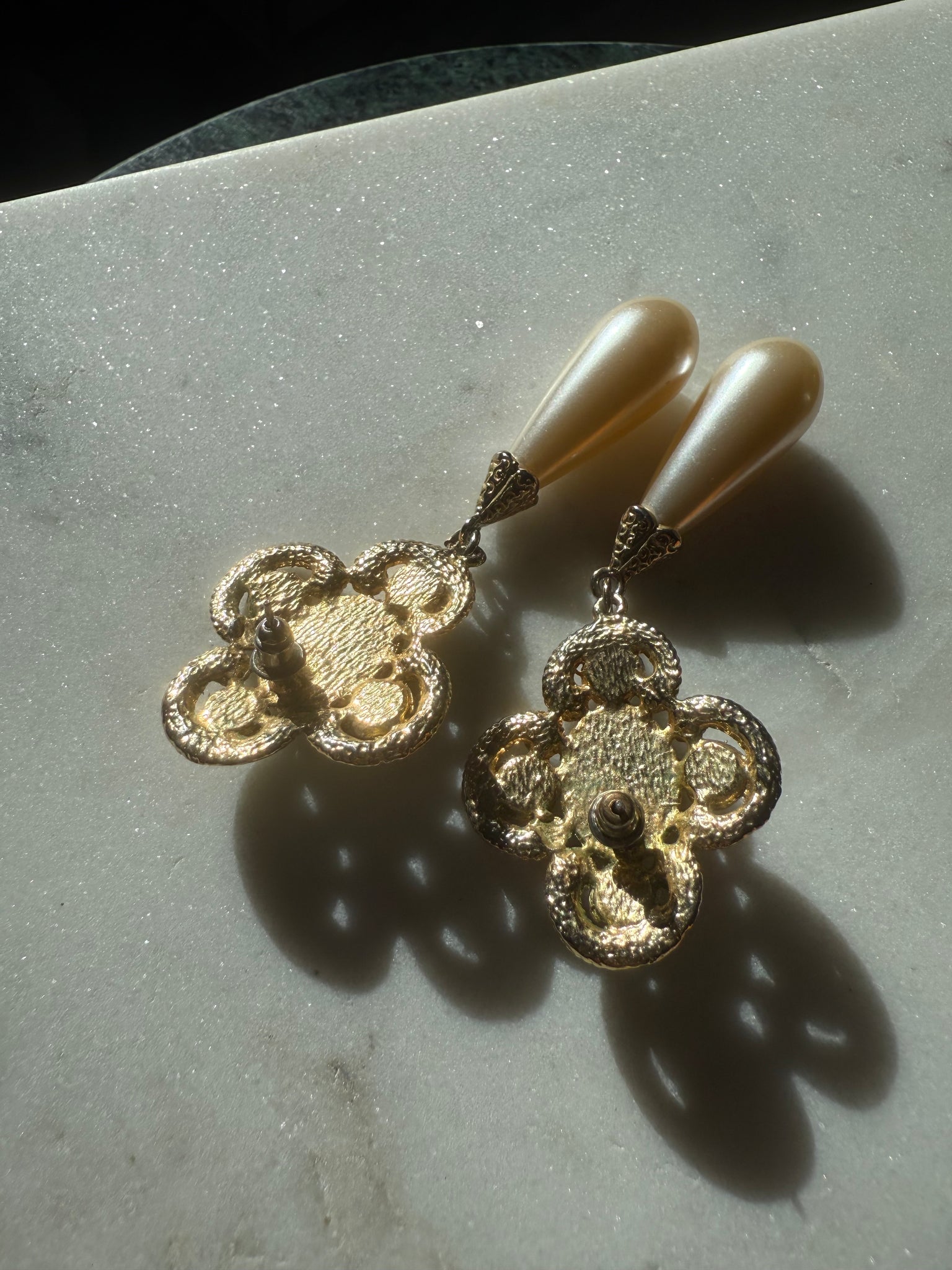 Vintage Pearl Drop Cabochon Gold Plated Earrings