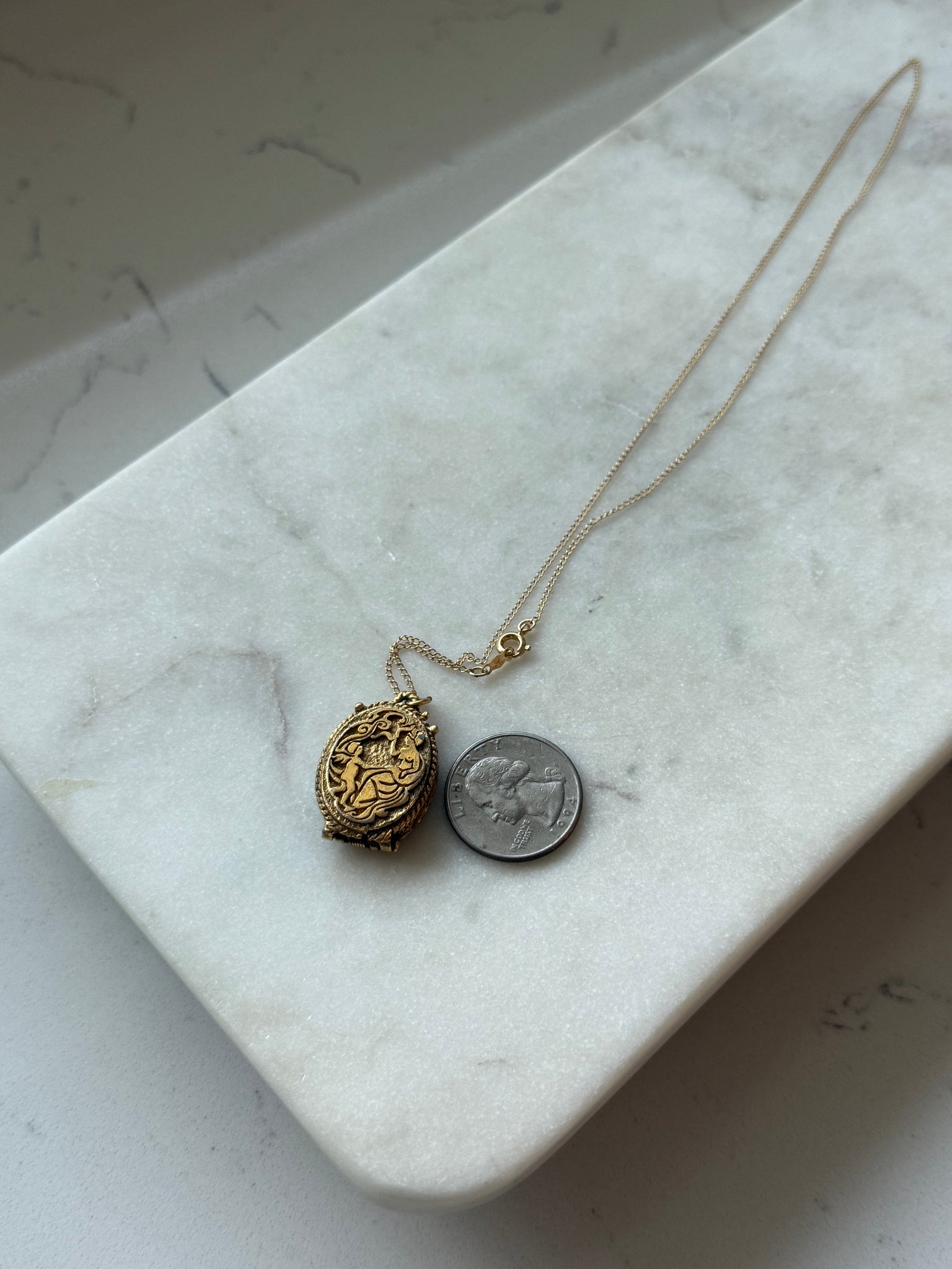 Gold plated costume jewelry • some of the gold plate is worn off • 14.4 grams • locket measured 1” • 18” length chain