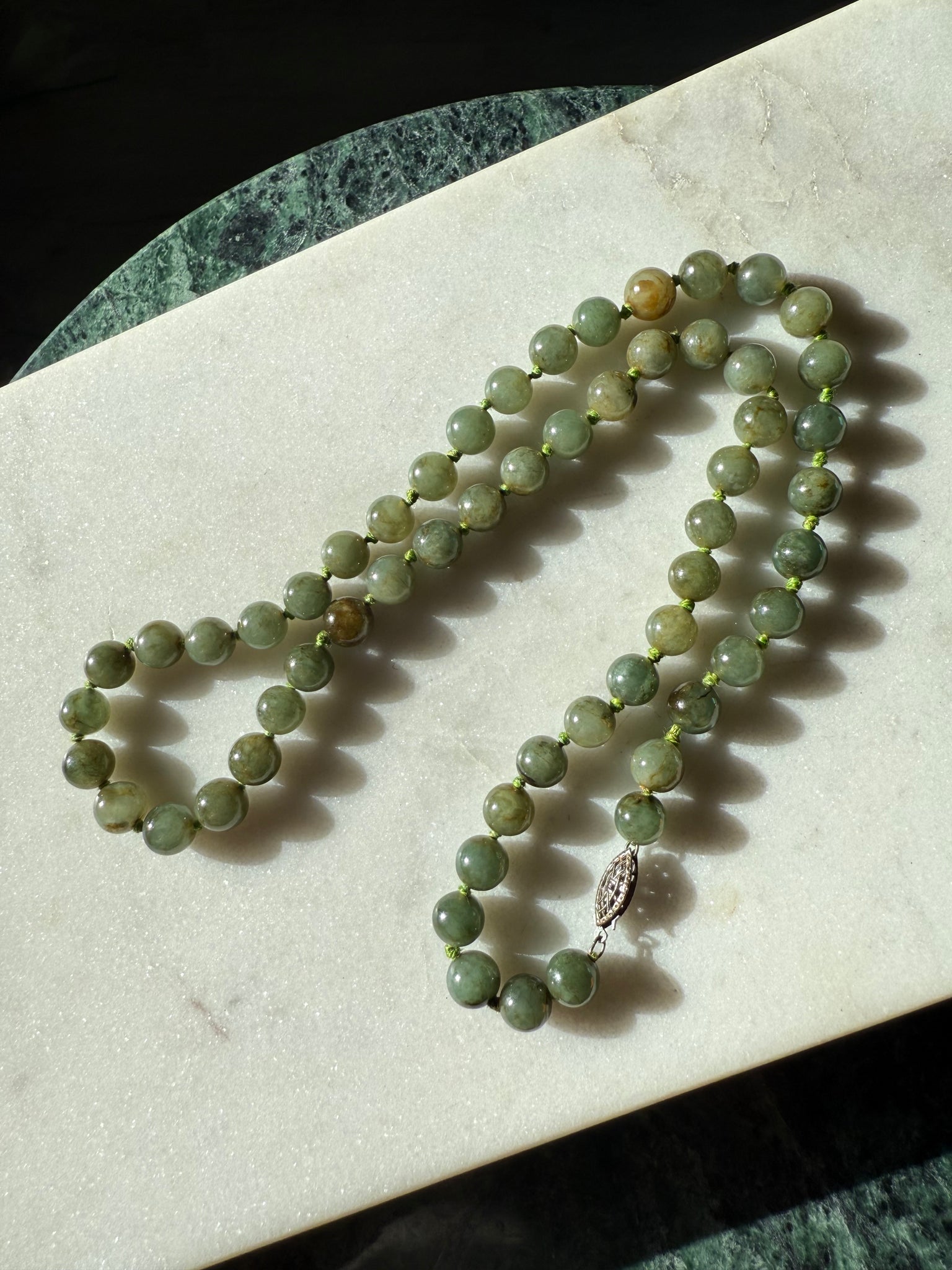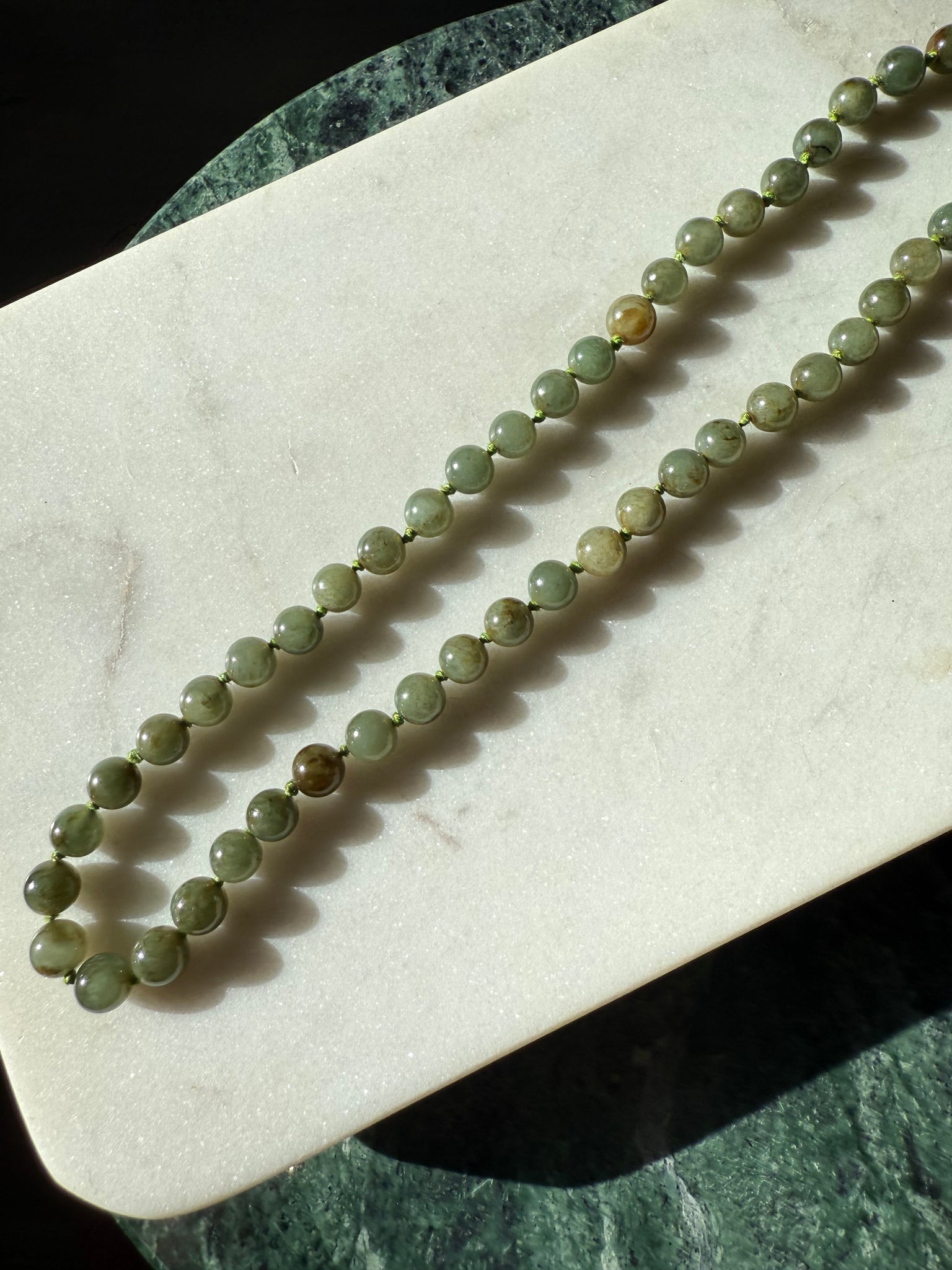 Good condition, I am unsure if the beads are real jade or not. The strands are a little loose in some areas around the beads. 50 grams • 21” length • 8mm width