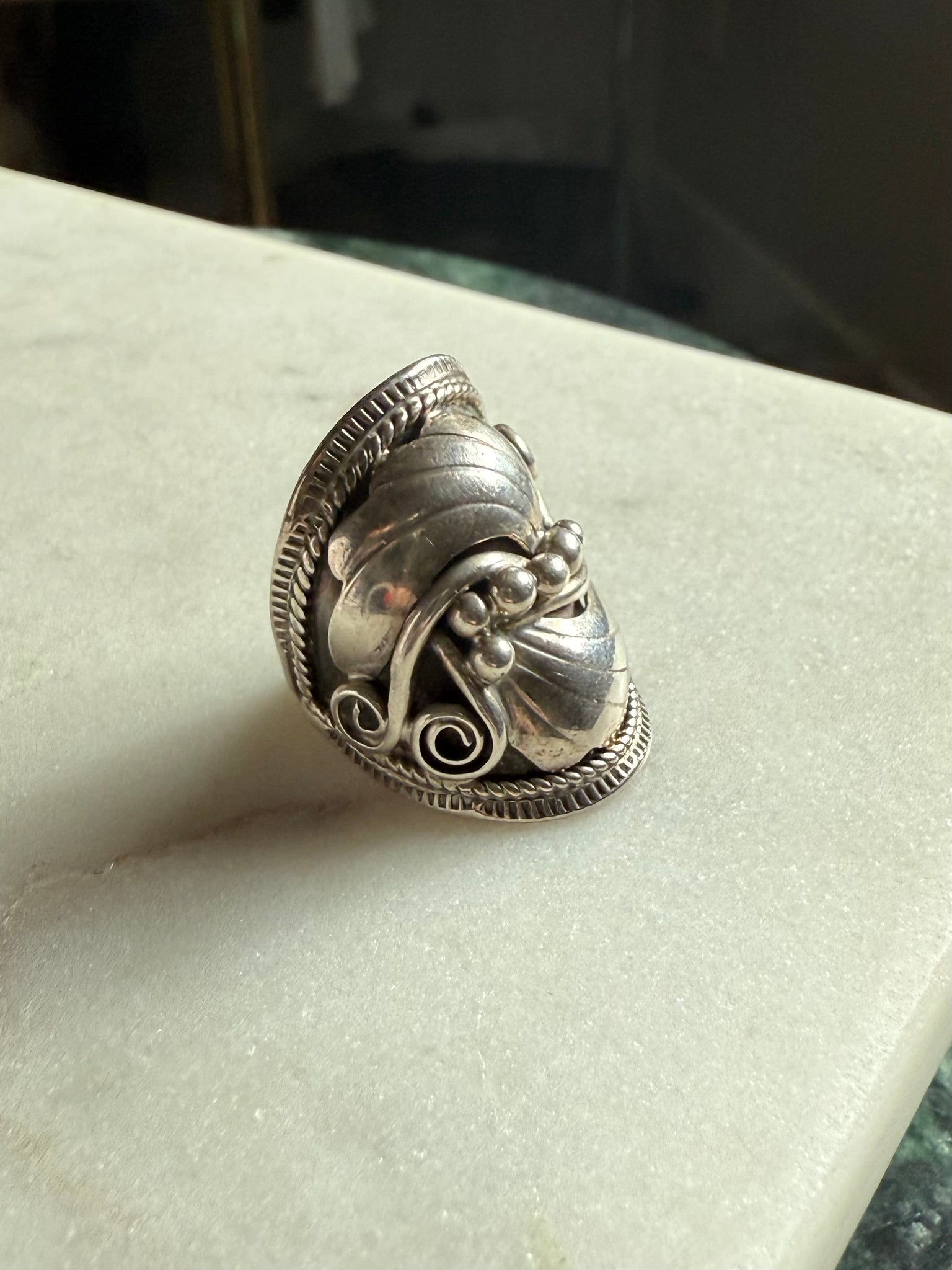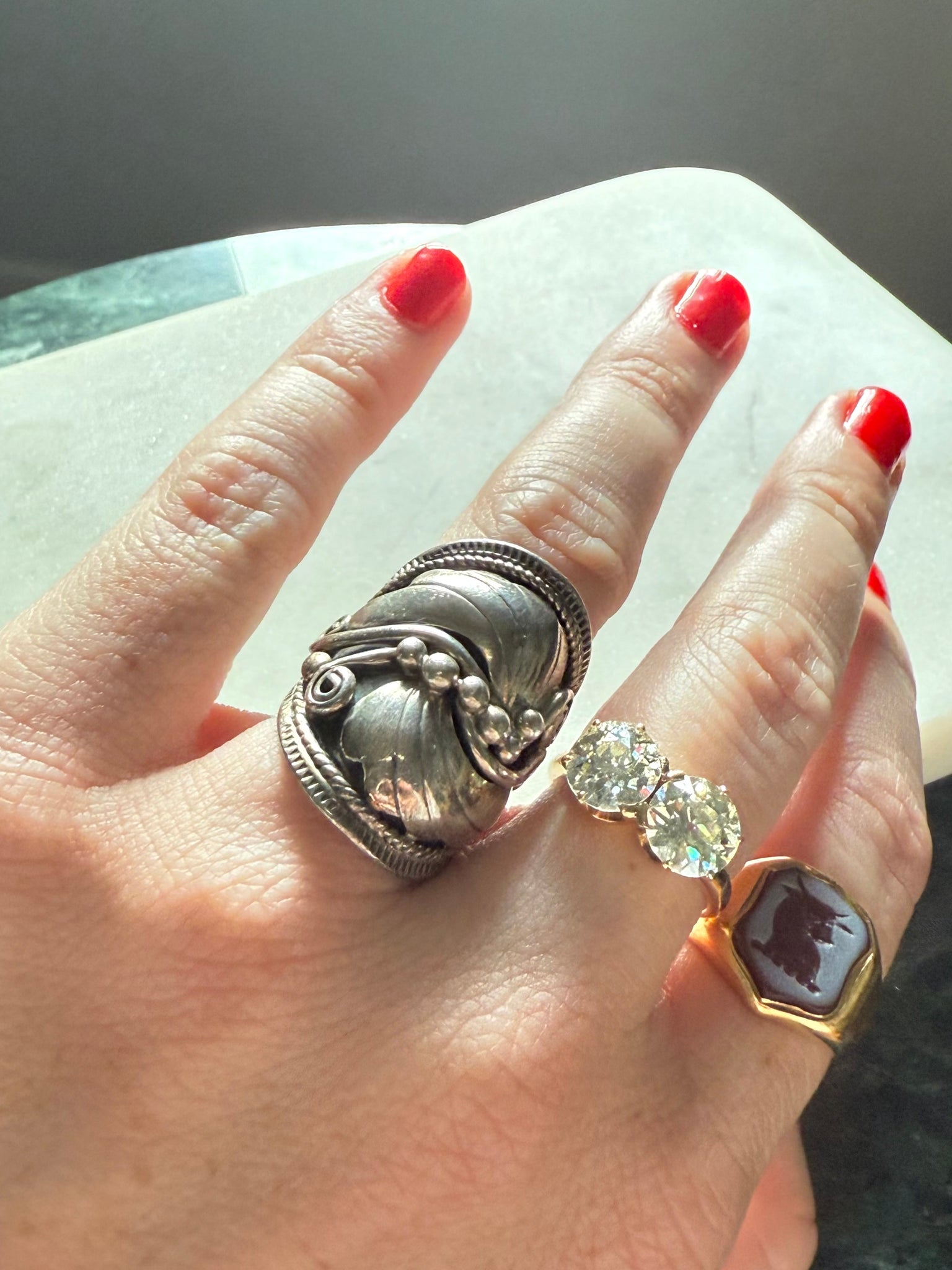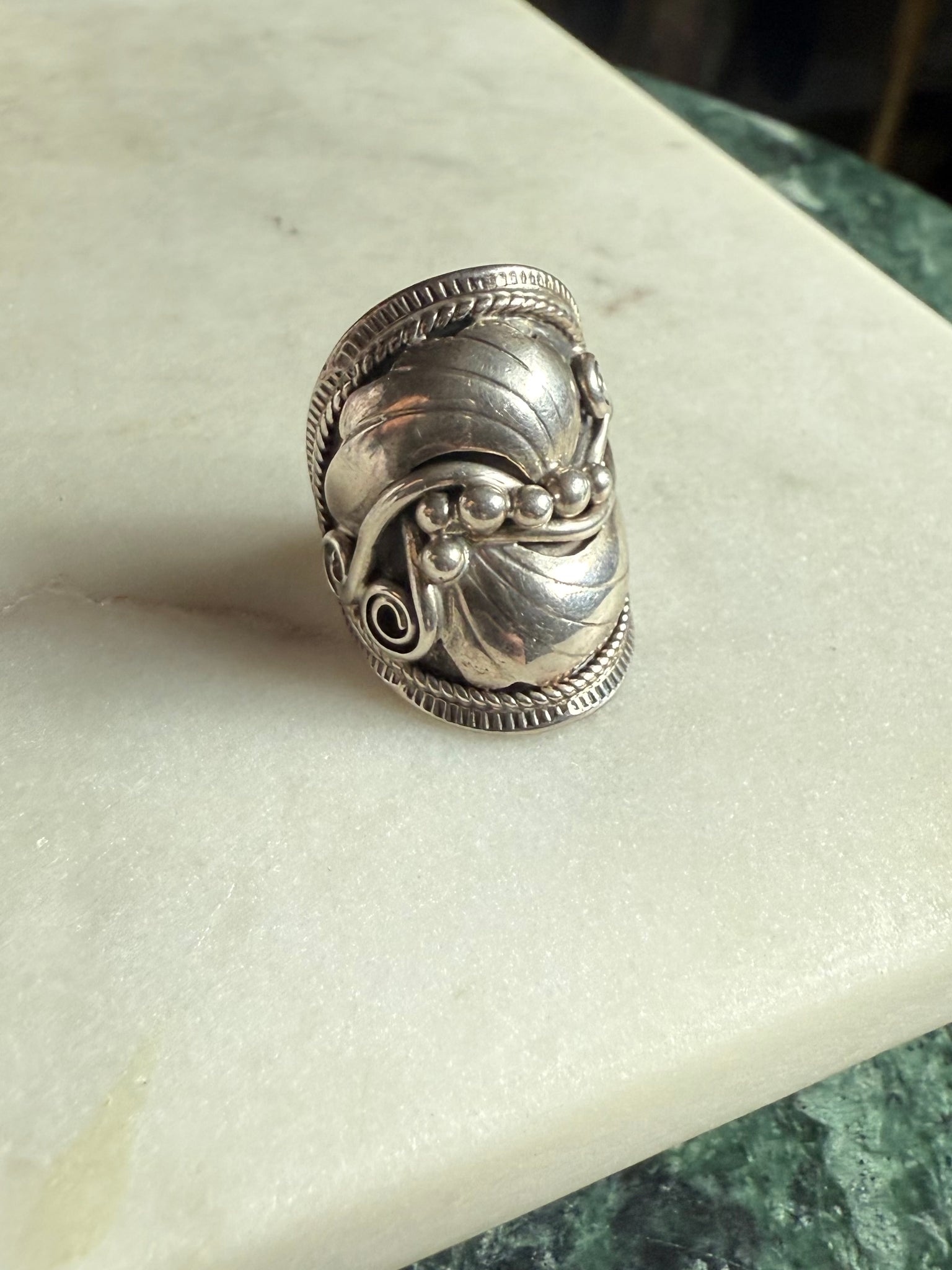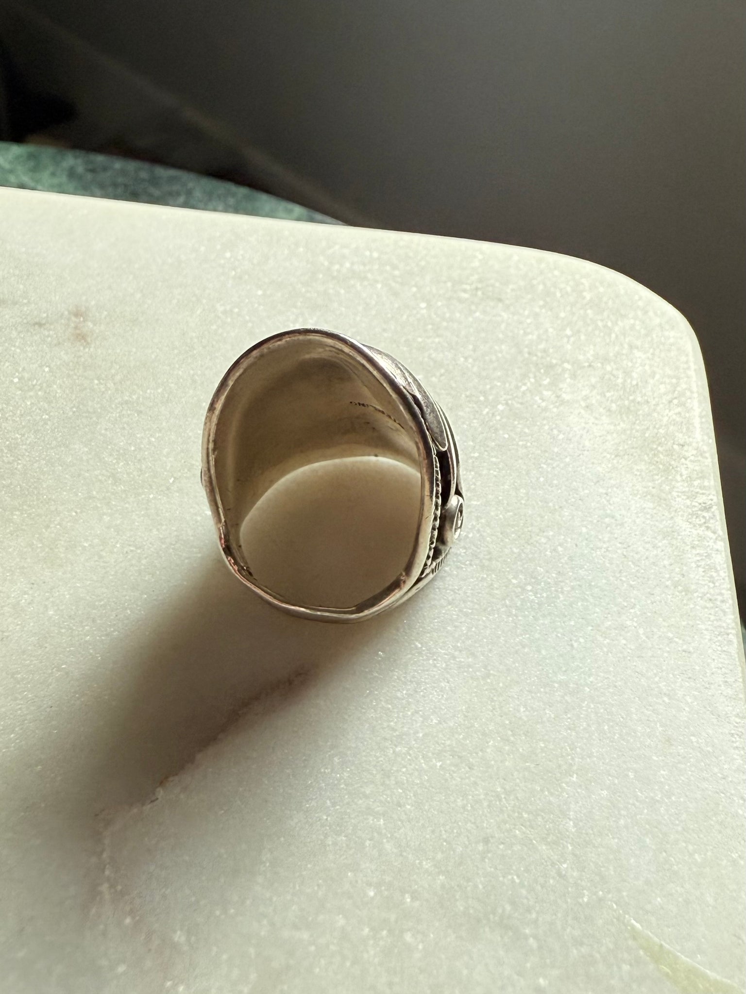 9.8 grams • .925 Sterling Silver • goes to 7.5 on mandrel but fits closer to a size 7 due to the length of the top of the ring taking up so much width